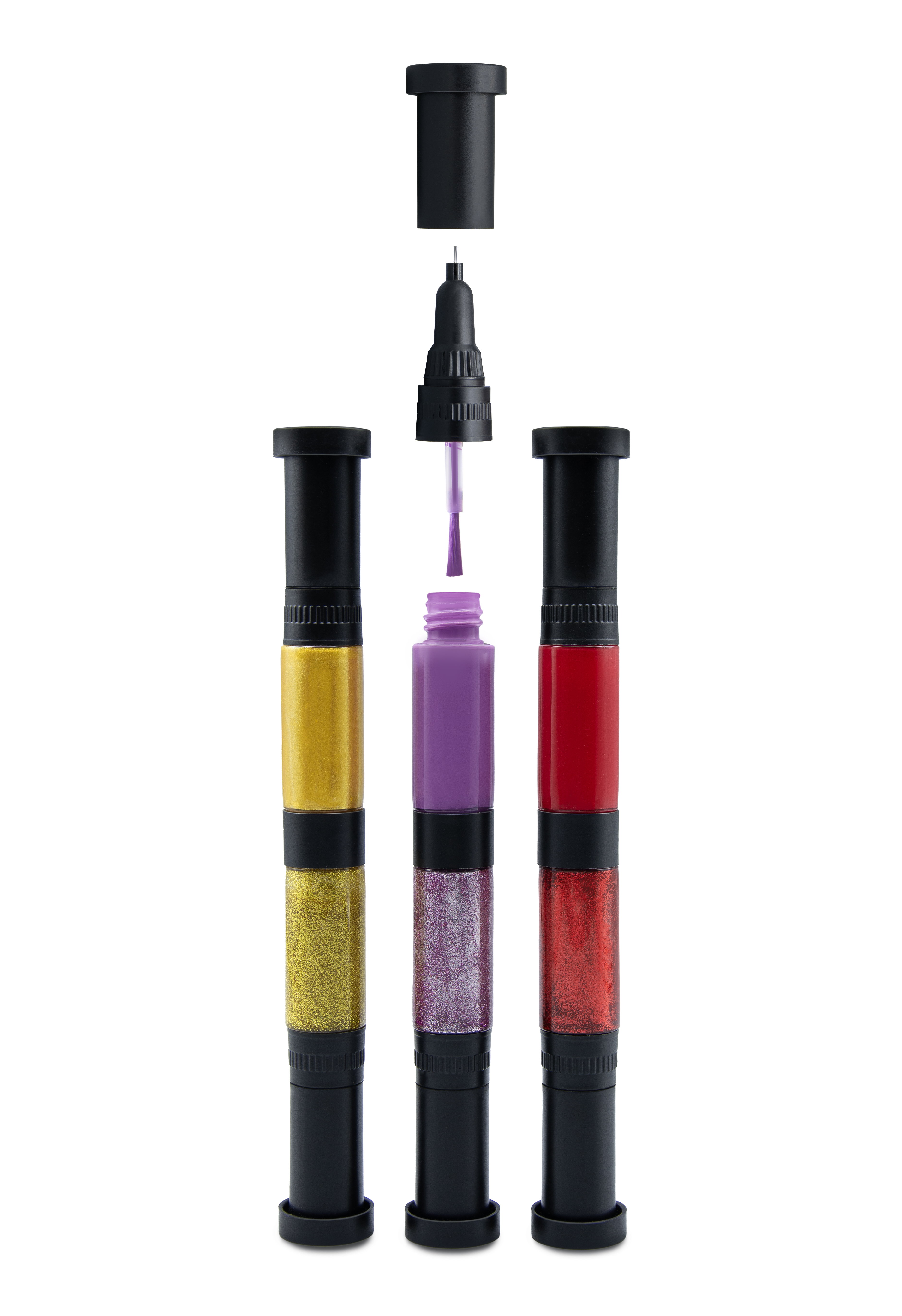W zestawie znajdują się trzy dwukolorowe pisaki: czerwony, złoty i fioletowy w wersji standardowej i brokatowej. Każdy z nich ma pędzelek i pisak.