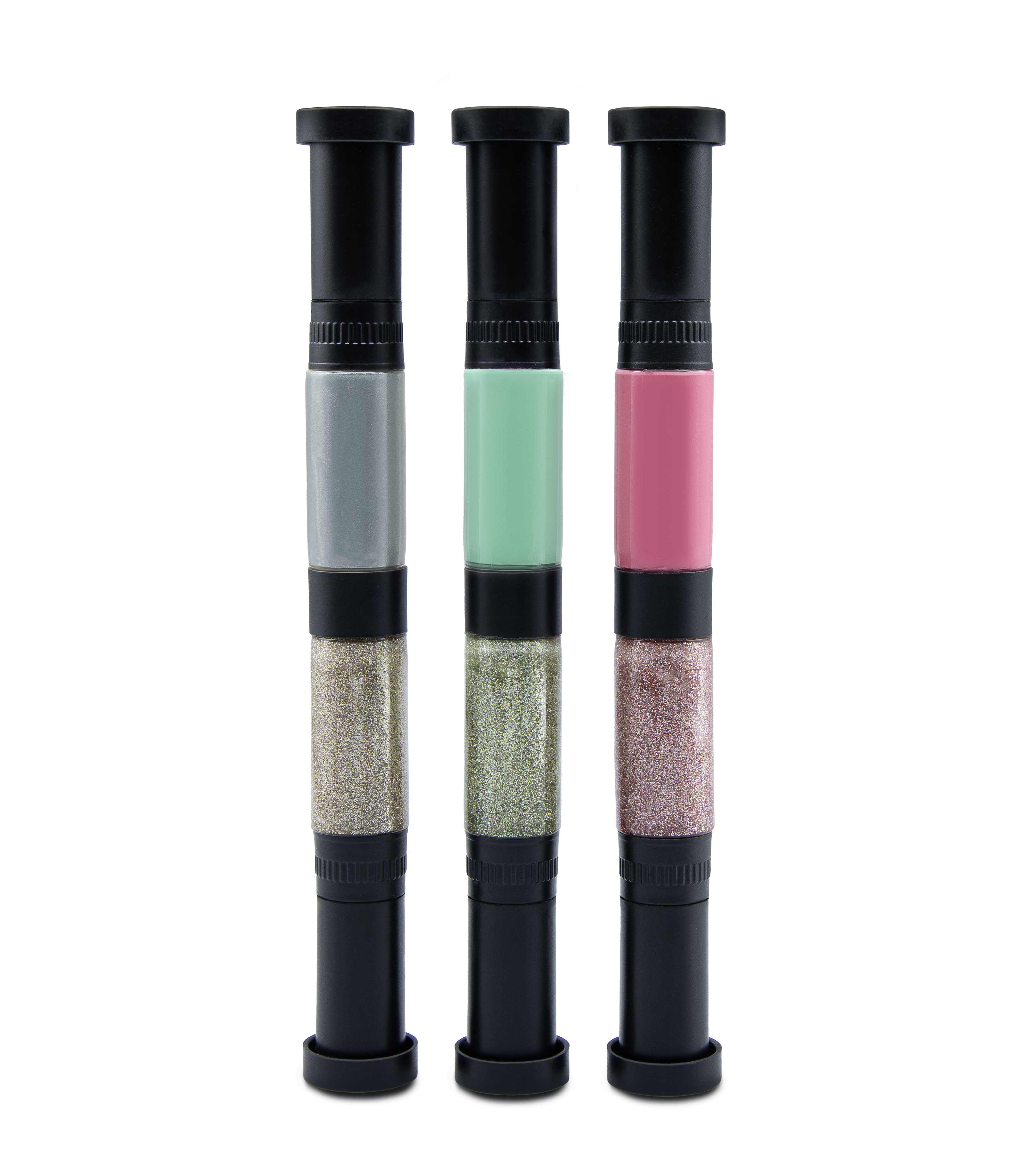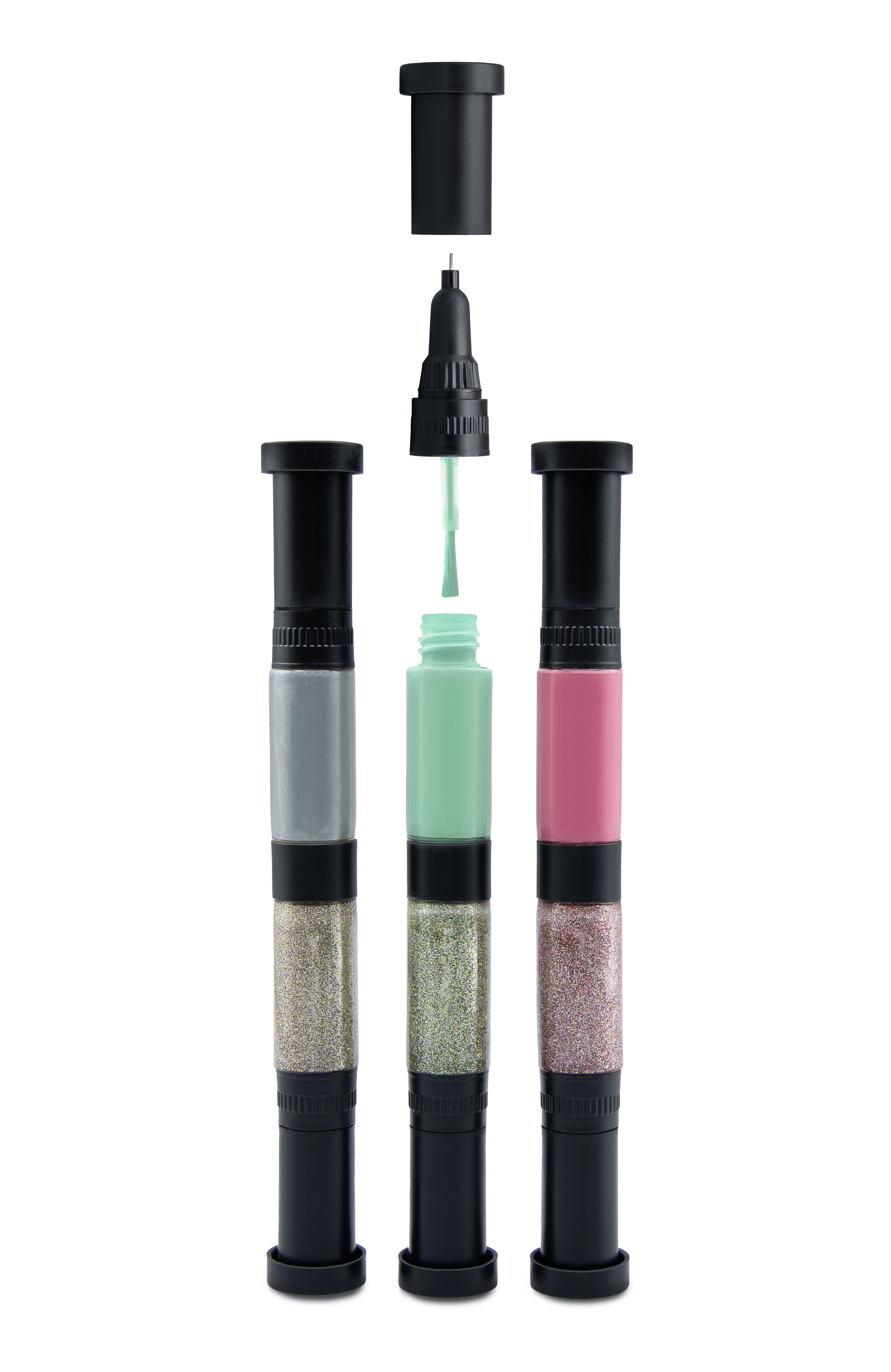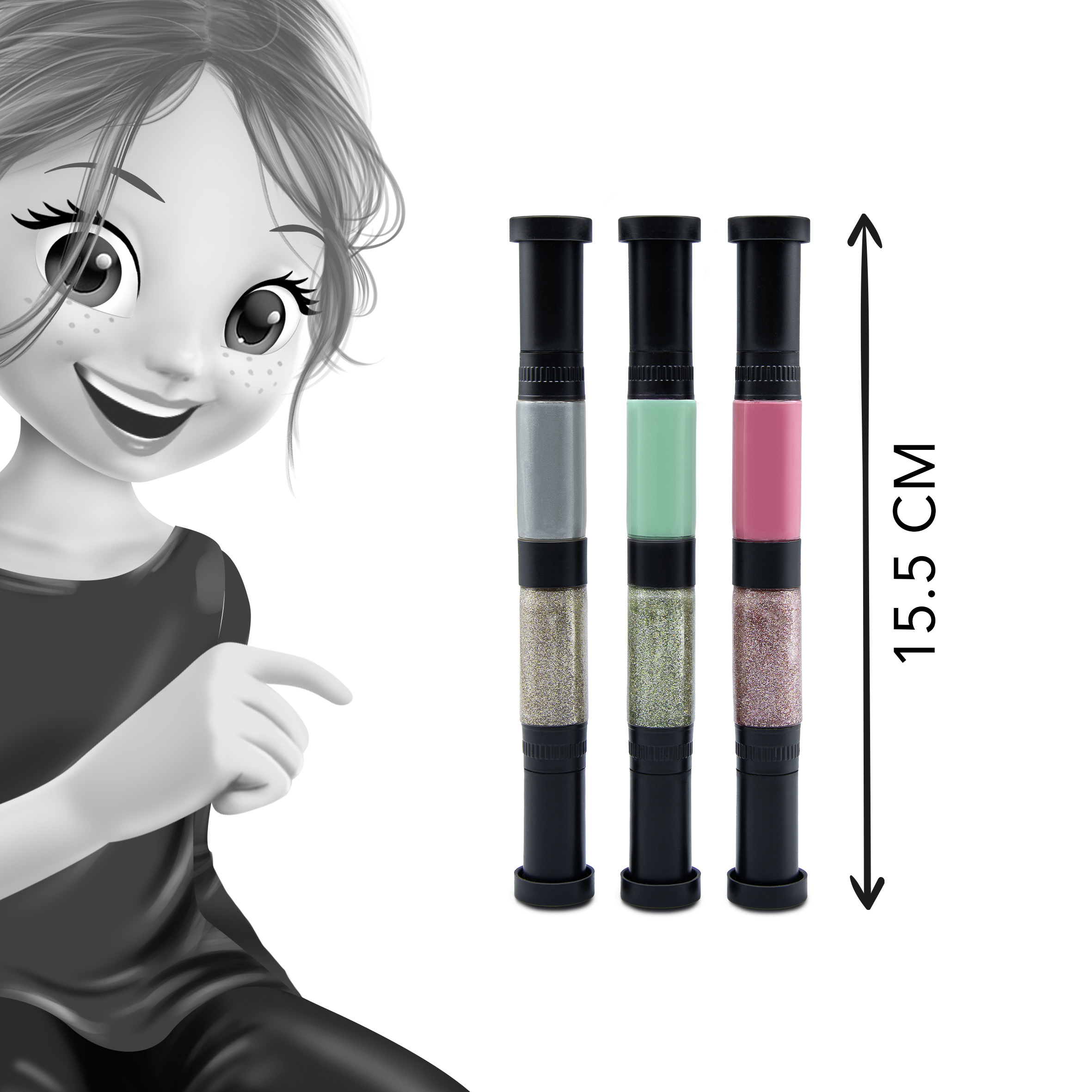 W zestawie znajdują się trzy dwukolorowe pisaki: różowy, zielony i srebrny w wersji standardowej i brokatowej. Każdy z nich ma pędzelek i pisak.
