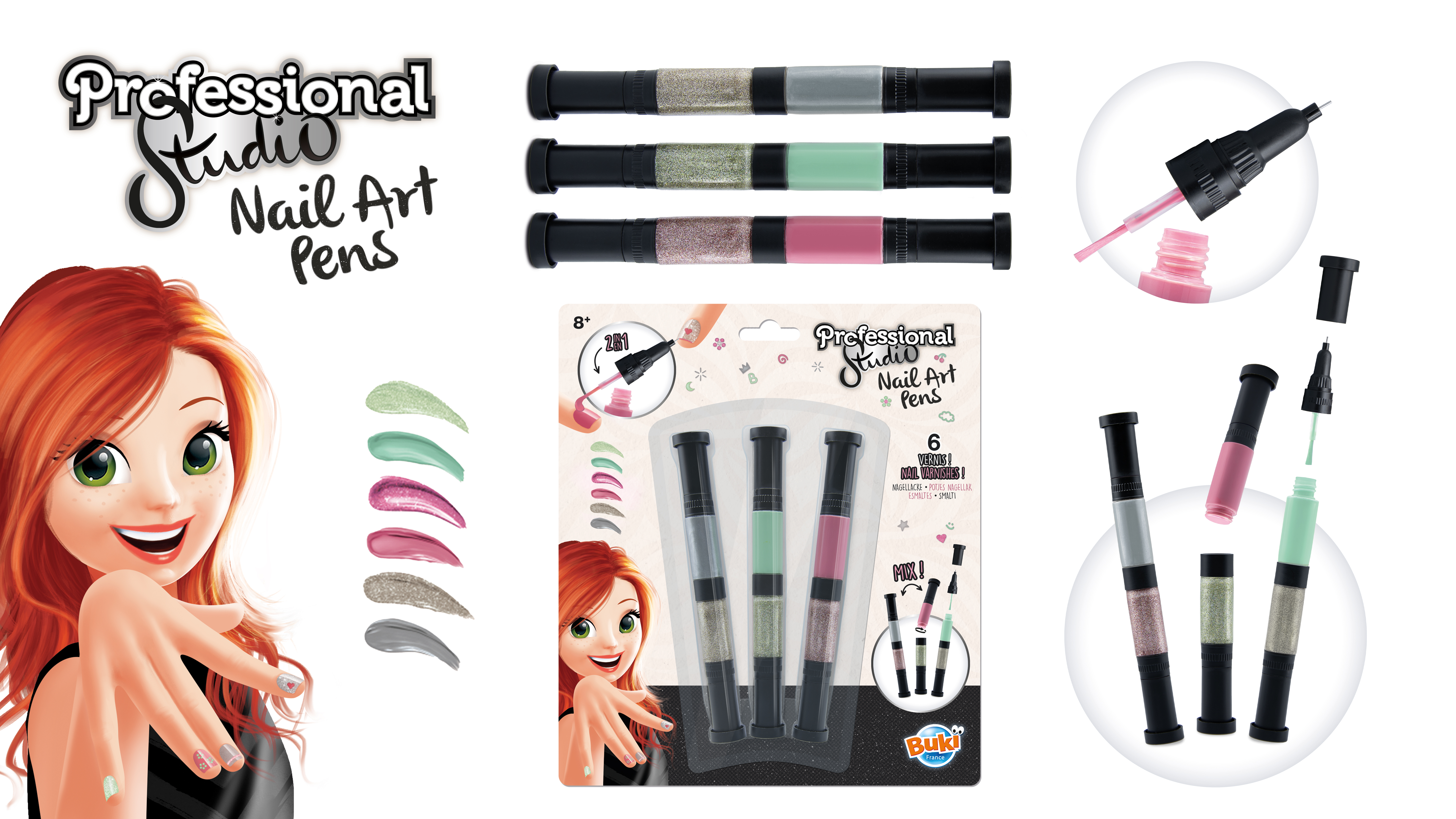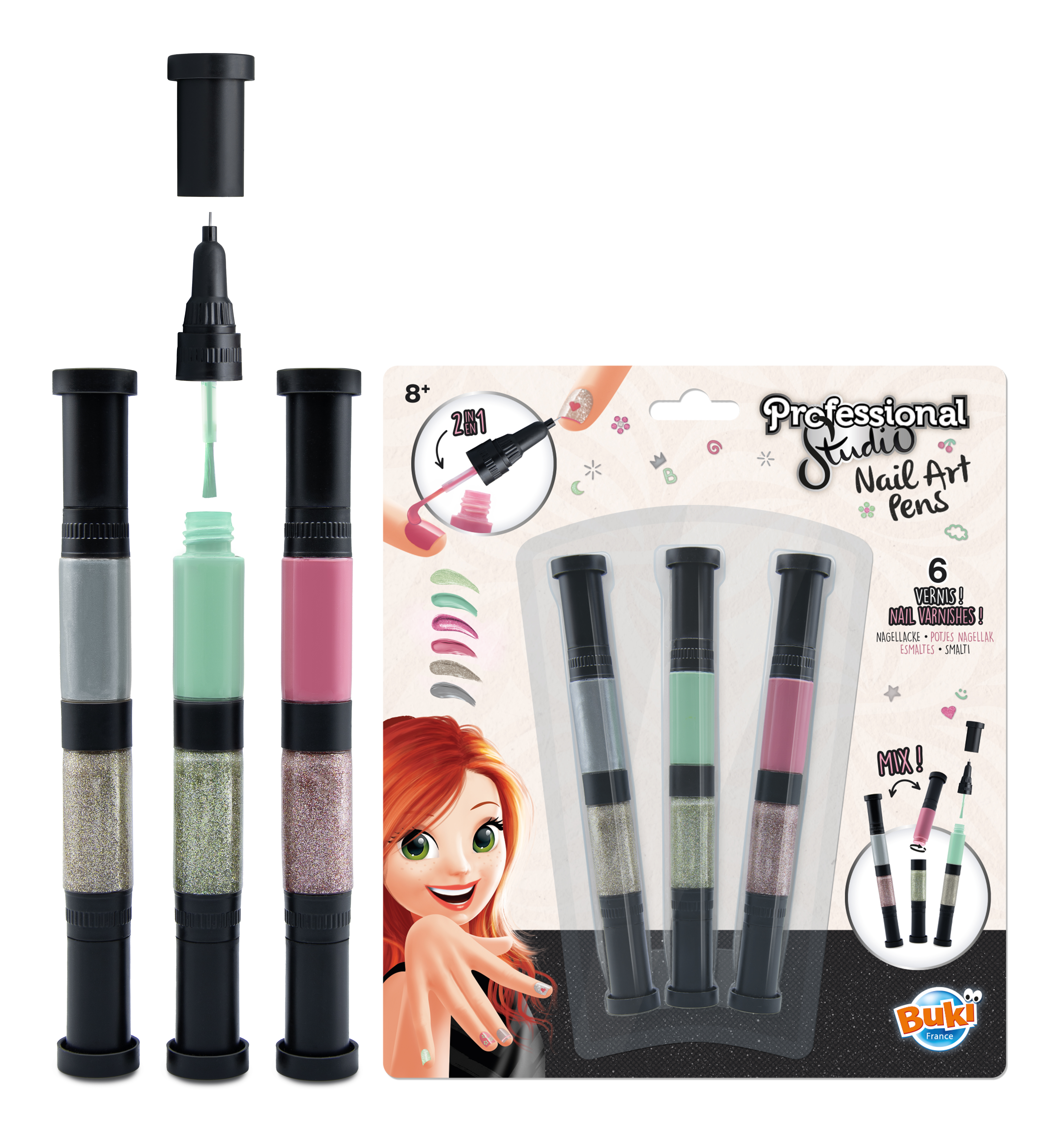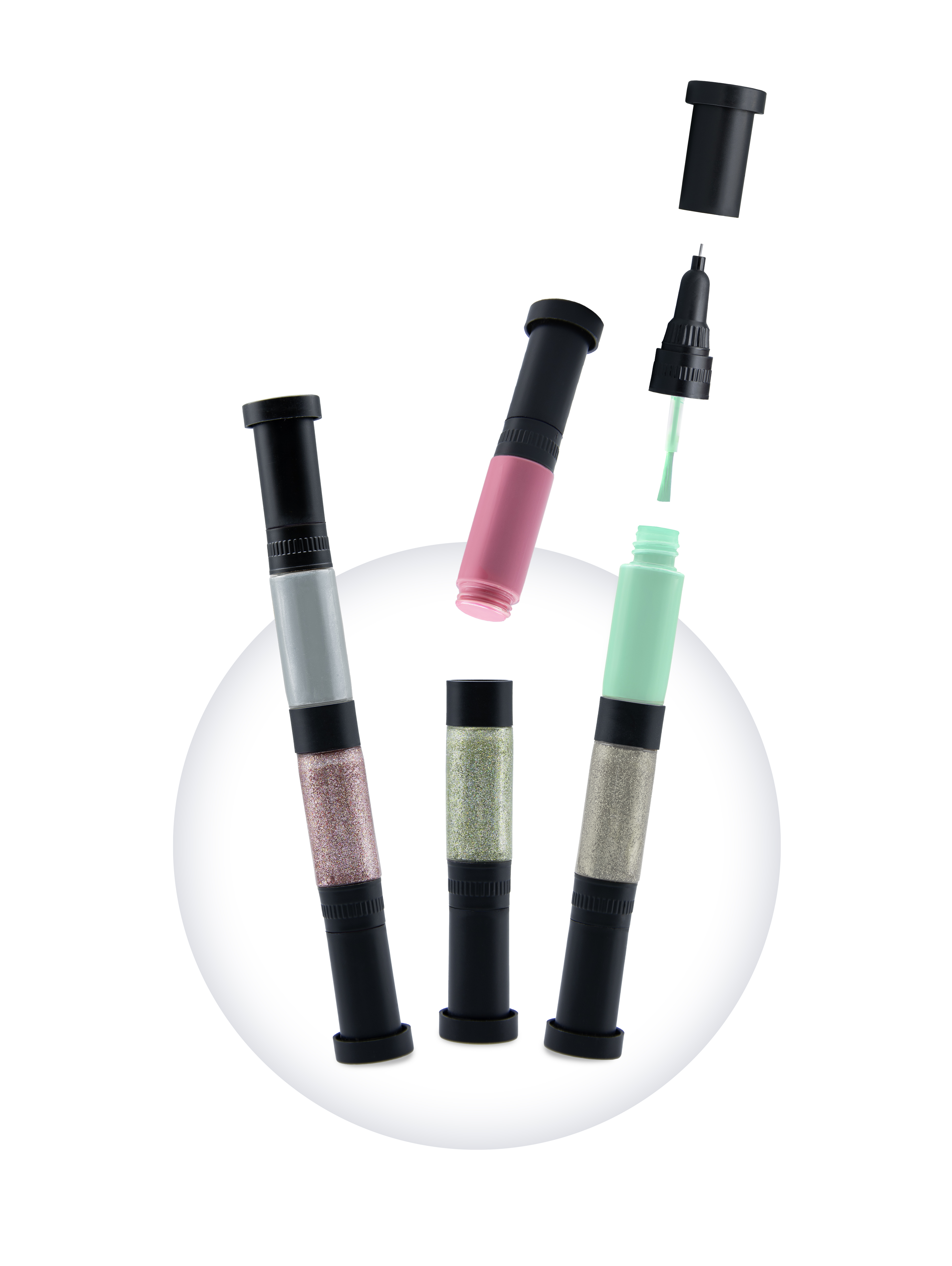 W zestawie znajdują się trzy dwukolorowe pisaki: różowy, zielony i srebrny w wersji standardowej i brokatowej. Każdy z nich ma pędzelek i pisak.