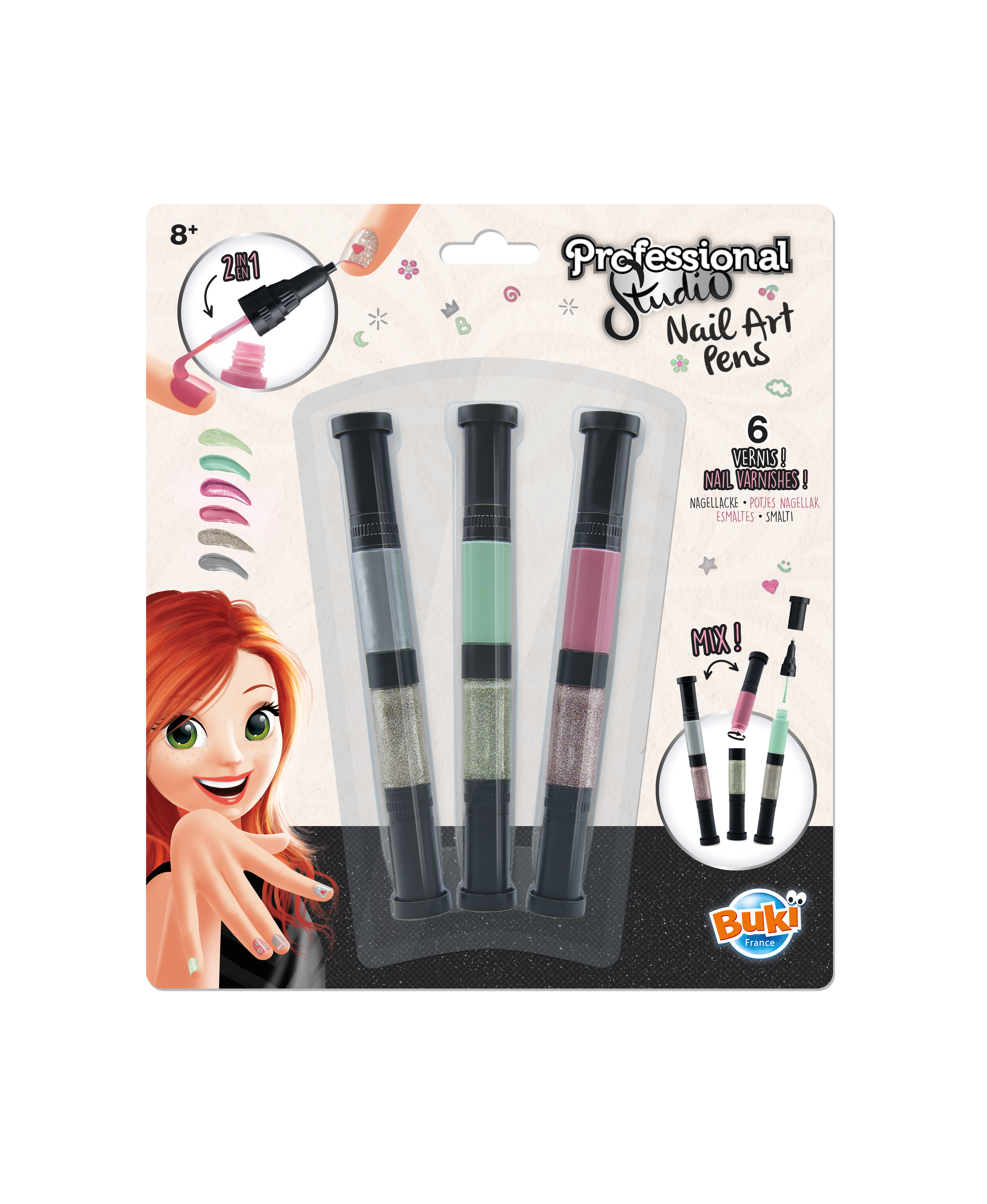 Mazaki do stylizacji paznokci 2 w 1: nałóż lakier na paznokcie końcówką z pędzelkiem, a następnie ozdób pisakiem.