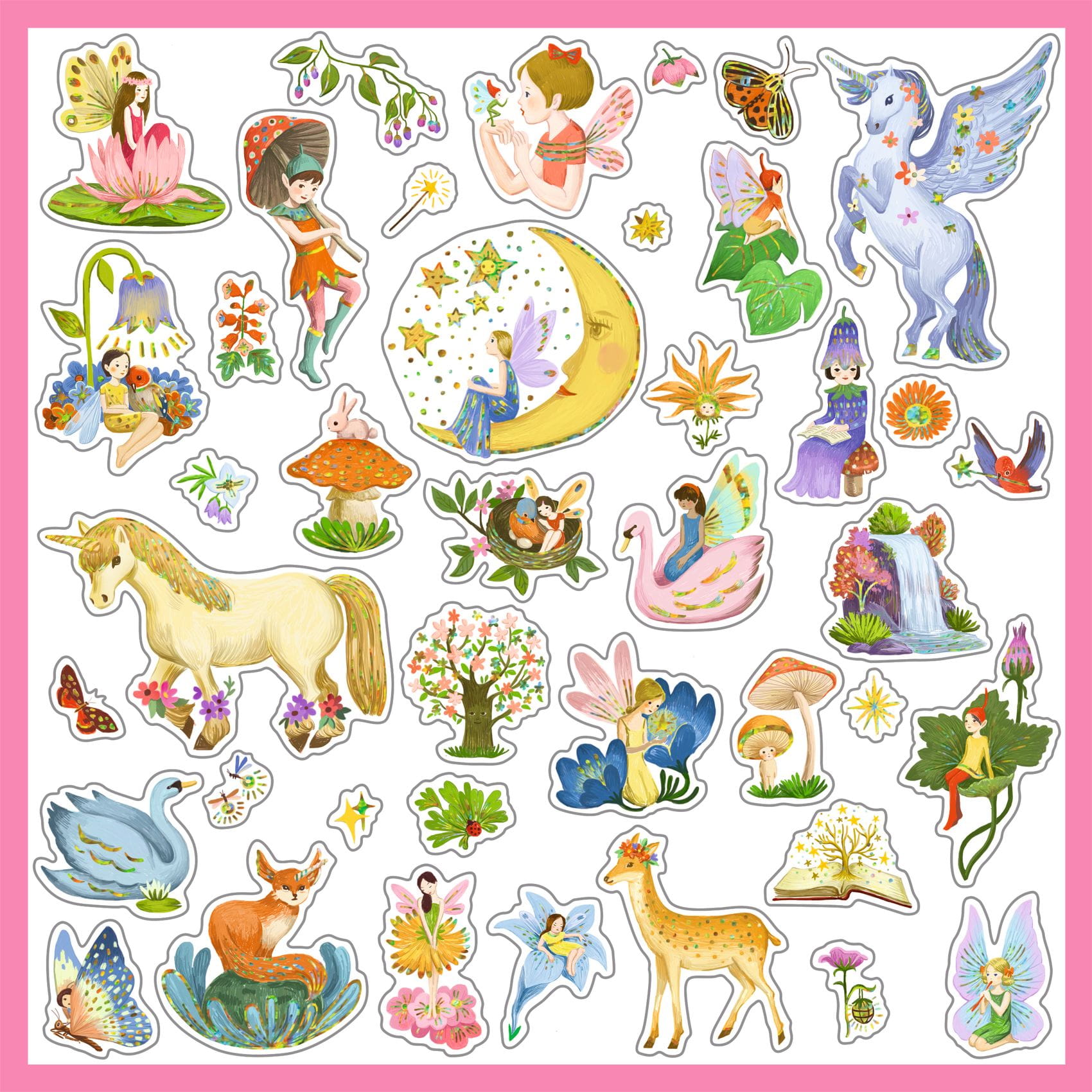 Zestaw 160 metalicznych naklejek o tematyce baśniowej: wróżki, jednorożce, elfy... Naklejki mogą ozdobić różne przedmioty, rysunki lub służyć do tworzenia własnych opowieści i baśni. 2 różne arkusze naklejek, każdy w 2 kopiach, aby móc ponownie użyć ulubionych postaci. Wykonane z papieru i kartonu posiadającego certyfikat FSC®.