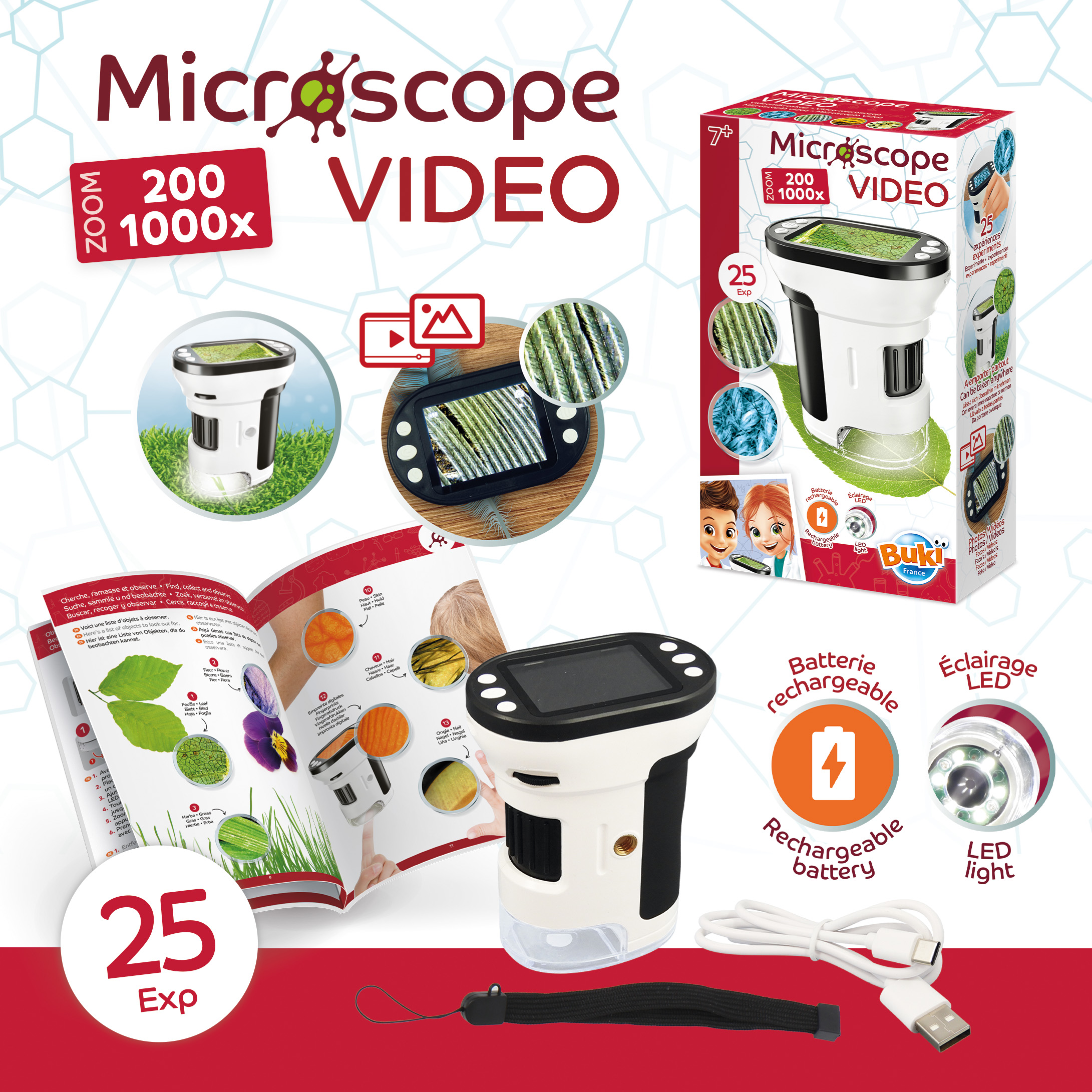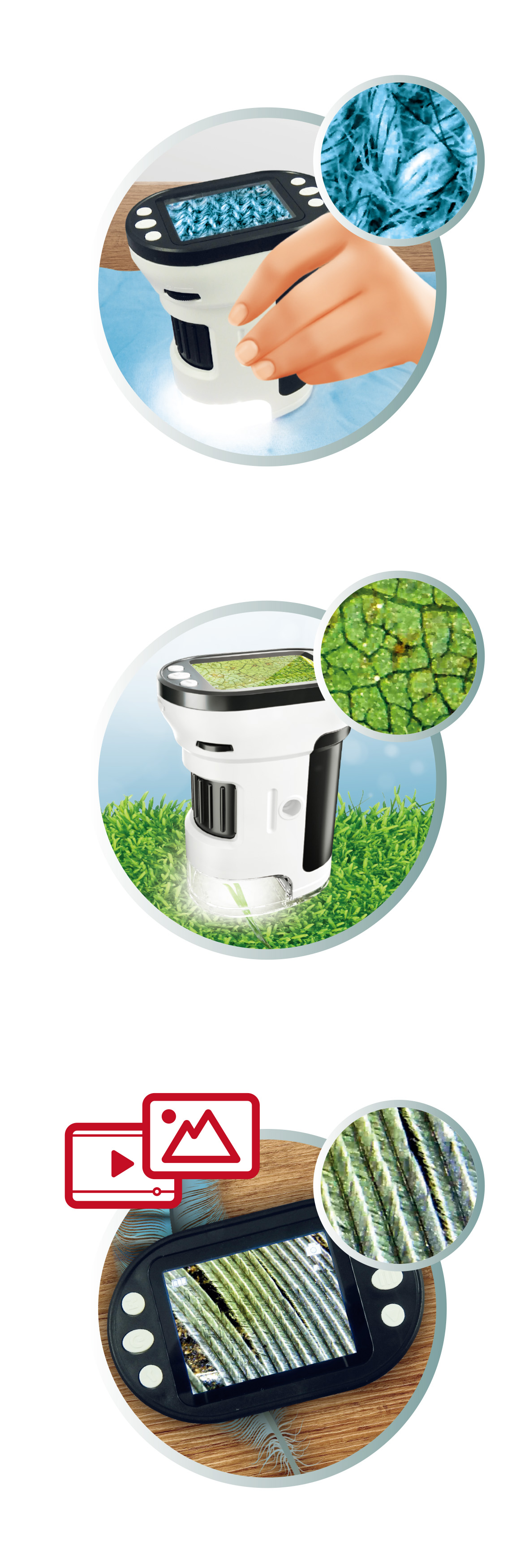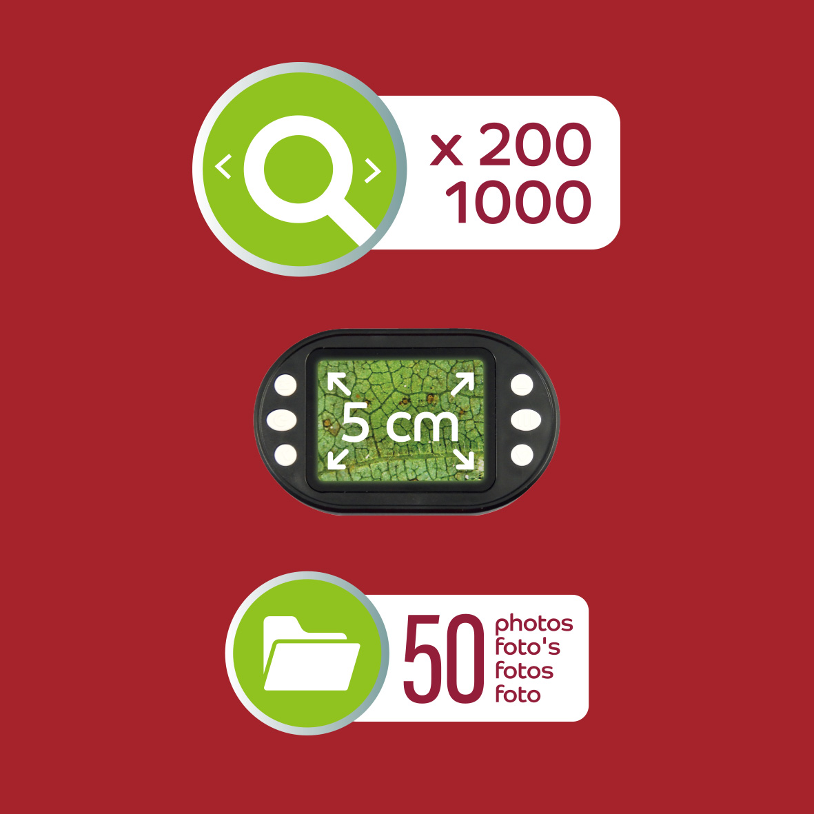 Obserwacje ułatwia powiększenie od 200x do 1000x, światełko LED i automatyczny fokus. Ekran o szerokości 5 cm pozwala na dokładne przyjrzenie się szczegółom różnych przedmiotów takich jak liście, mech, piasek itp. W instrukcji podano 25 przykładowych obiektów wartych obserwacji.