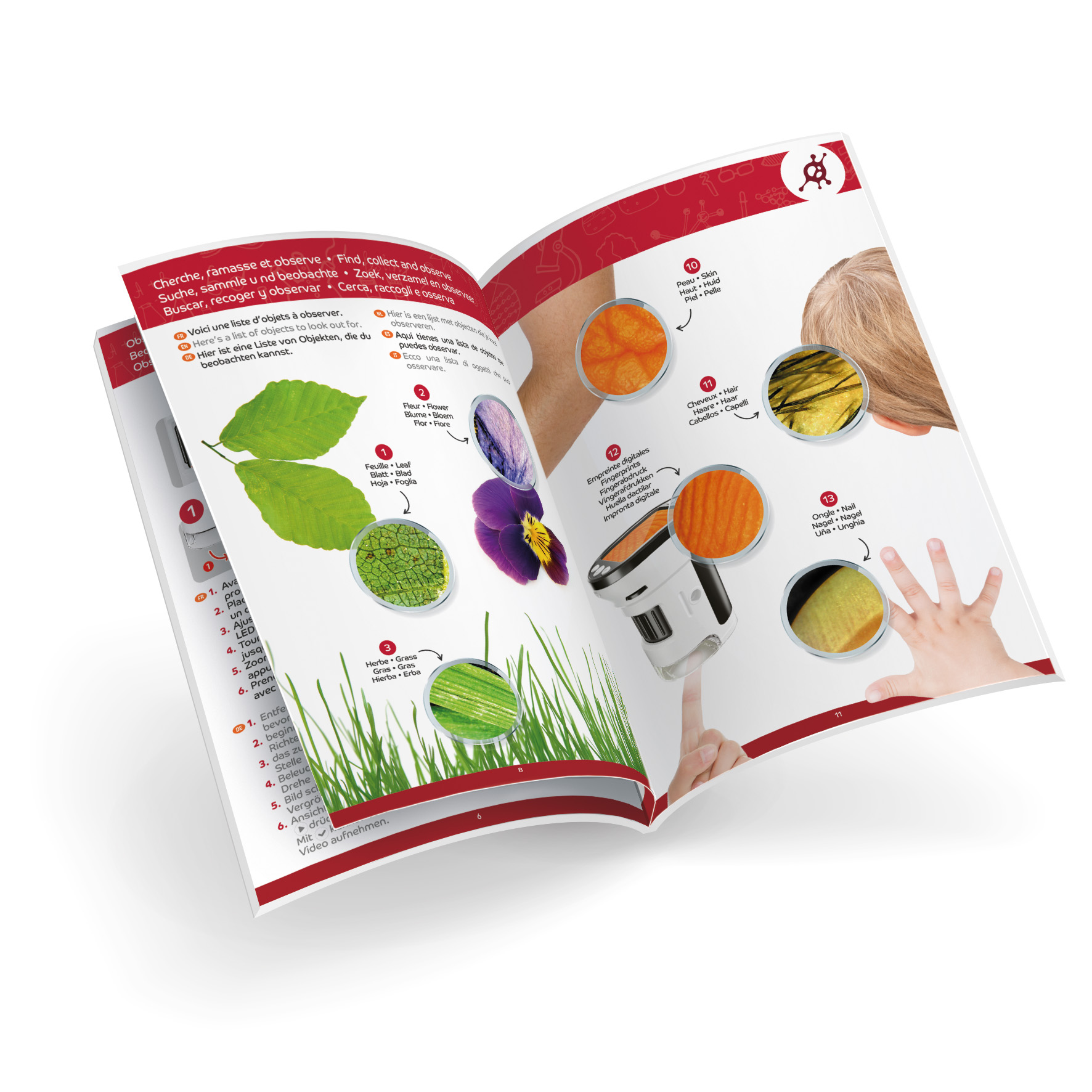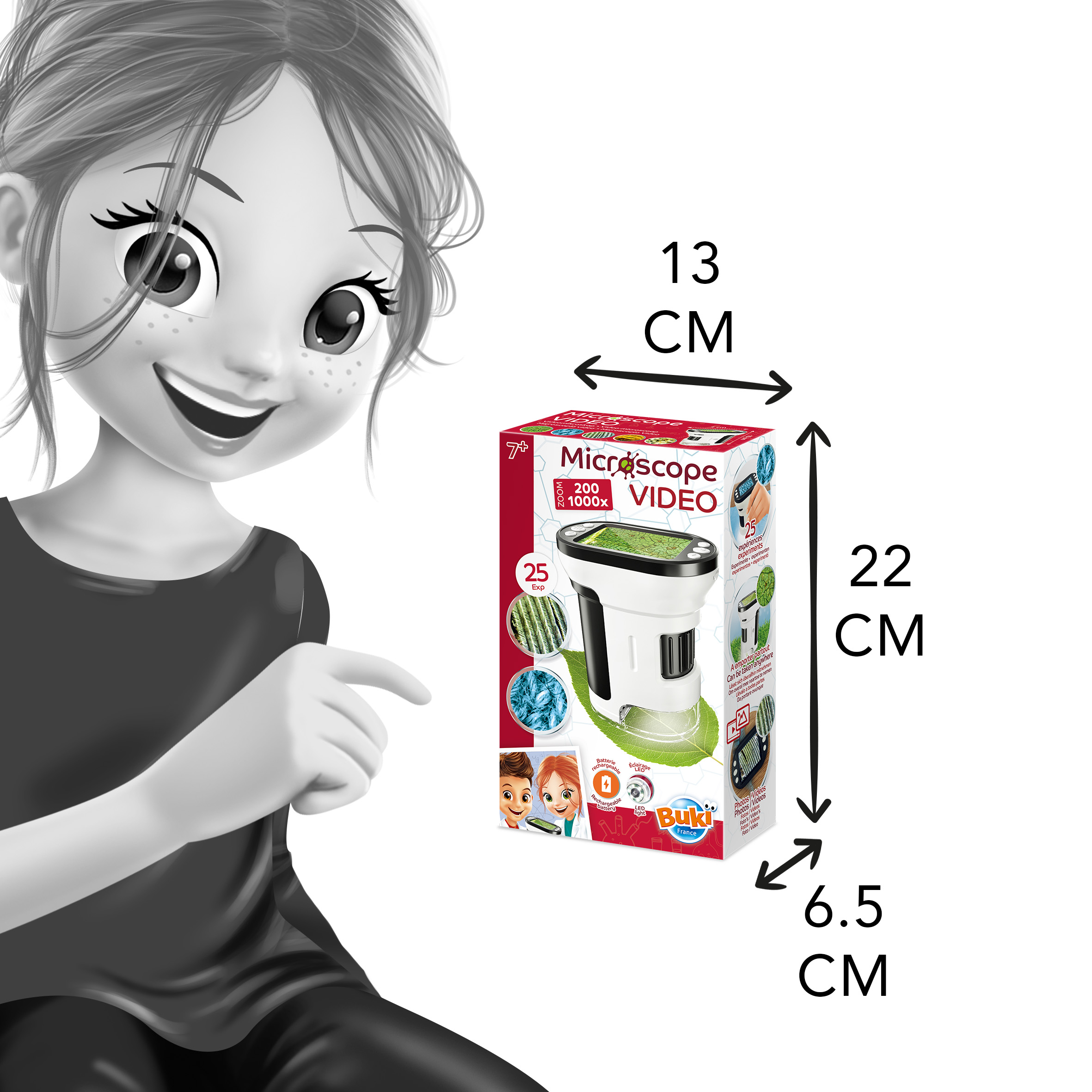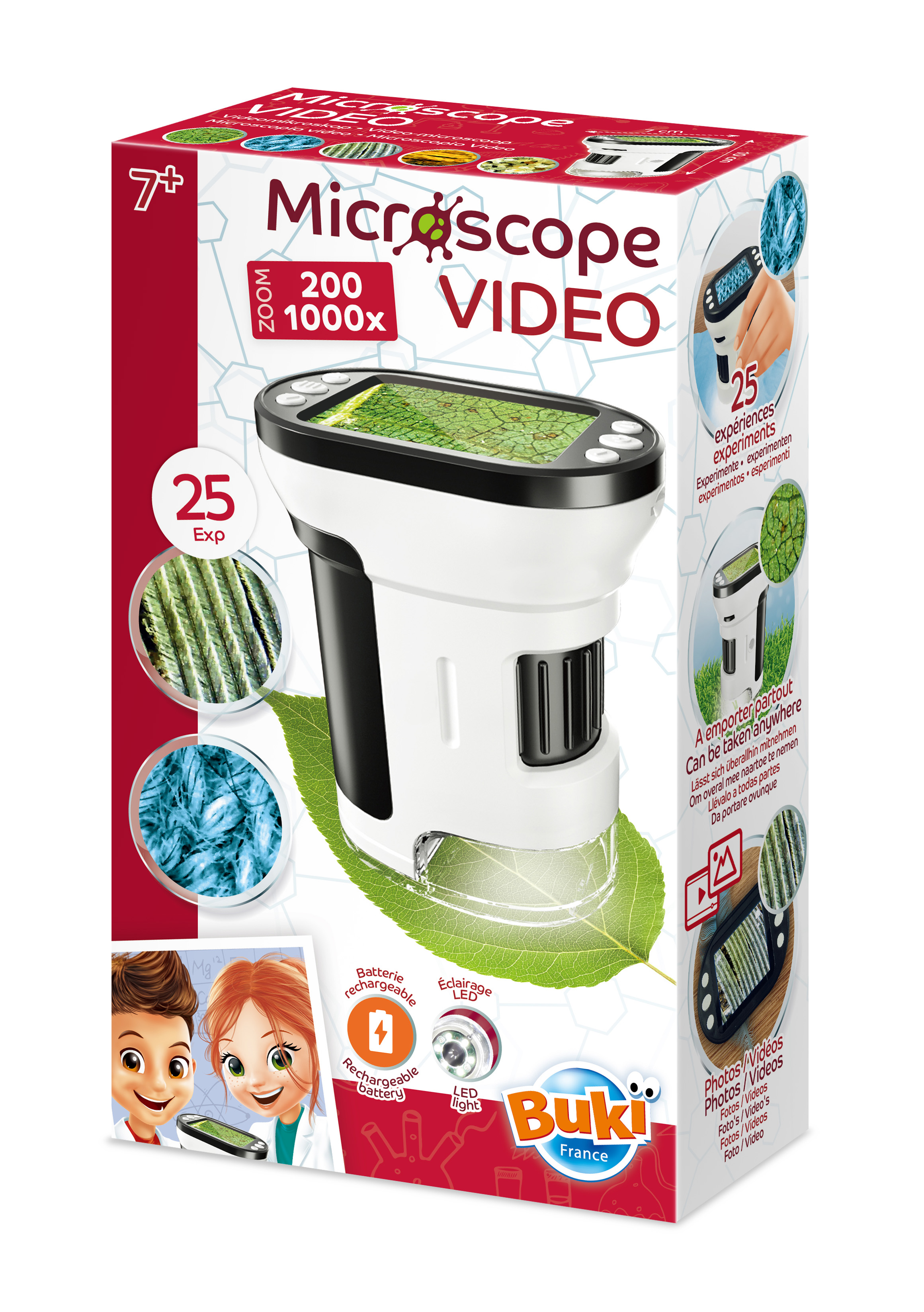 Obserwacje ułatwia powiększenie od 200x do 1000x, światełko LED i automatyczny fokus. Ekran o szerokości 5 cm pozwala na dokładne przyjrzenie się szczegółom różnych przedmiotów takich jak liście, mech, piasek itp. W instrukcji podano 25 przykładowych obiektów wartych obserwacji.