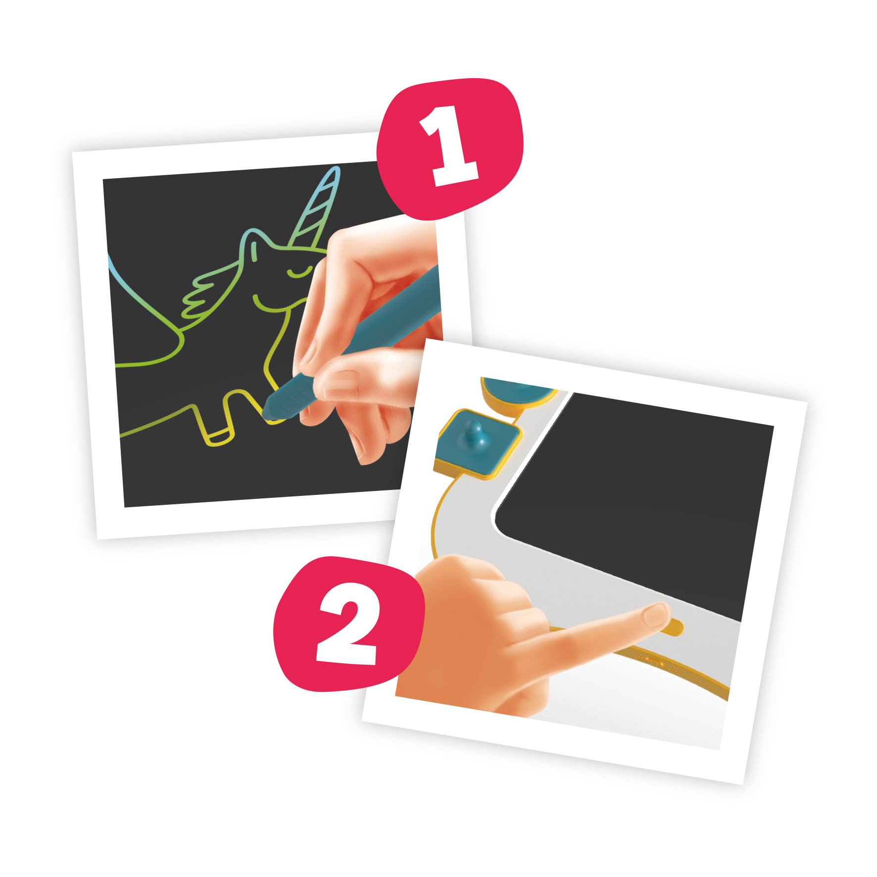 Rysowanie, pisanie i przybijanie pieczątek bez ryzyka pobrudzenia się. Zabawa może trwać bez końca: wystarczy nacisnąć przycisk kasowania, a tablet na nowo będzie pusty i gotowy na nowe obrazki. Ekran można również zablokować, aby nie stracić cennego rysunku.