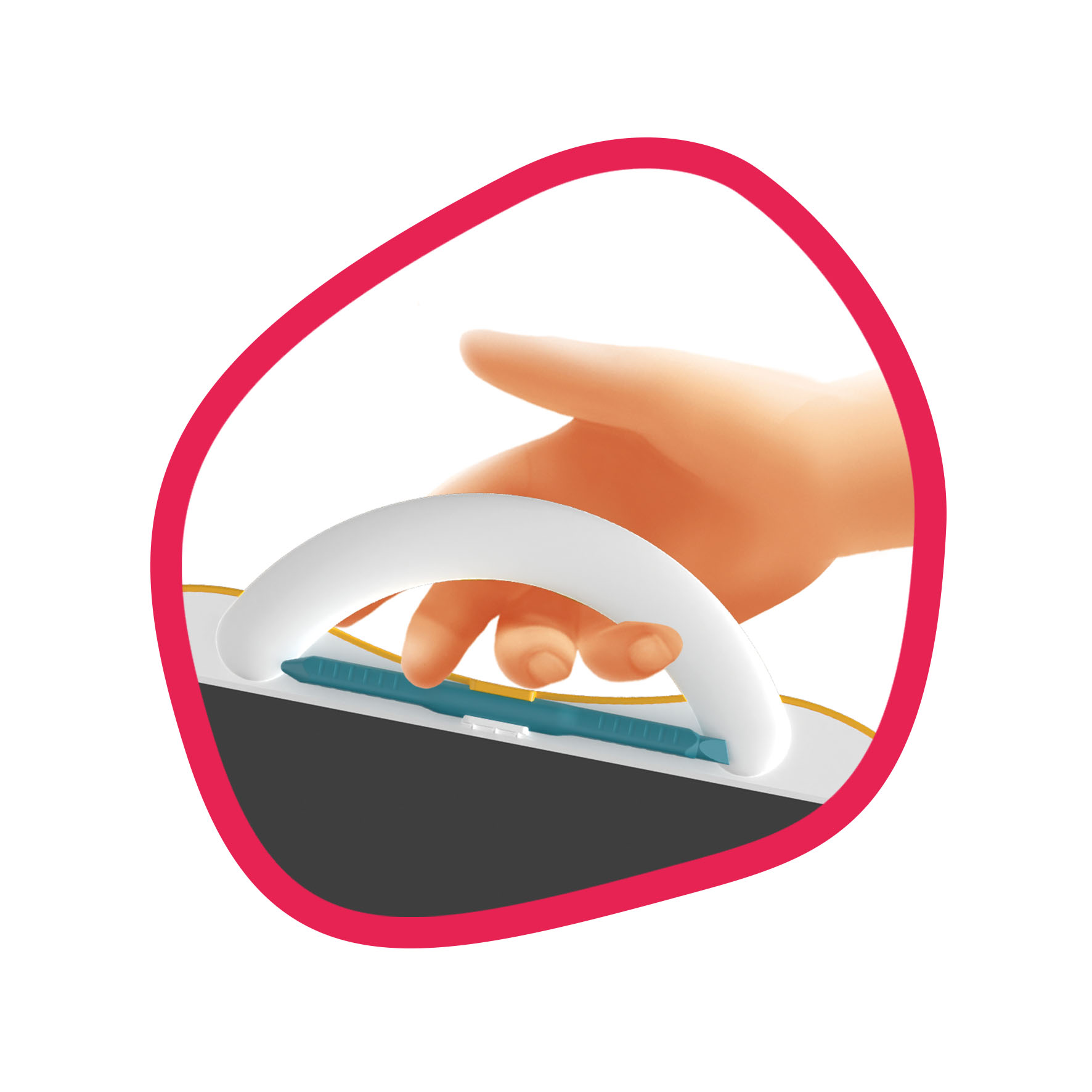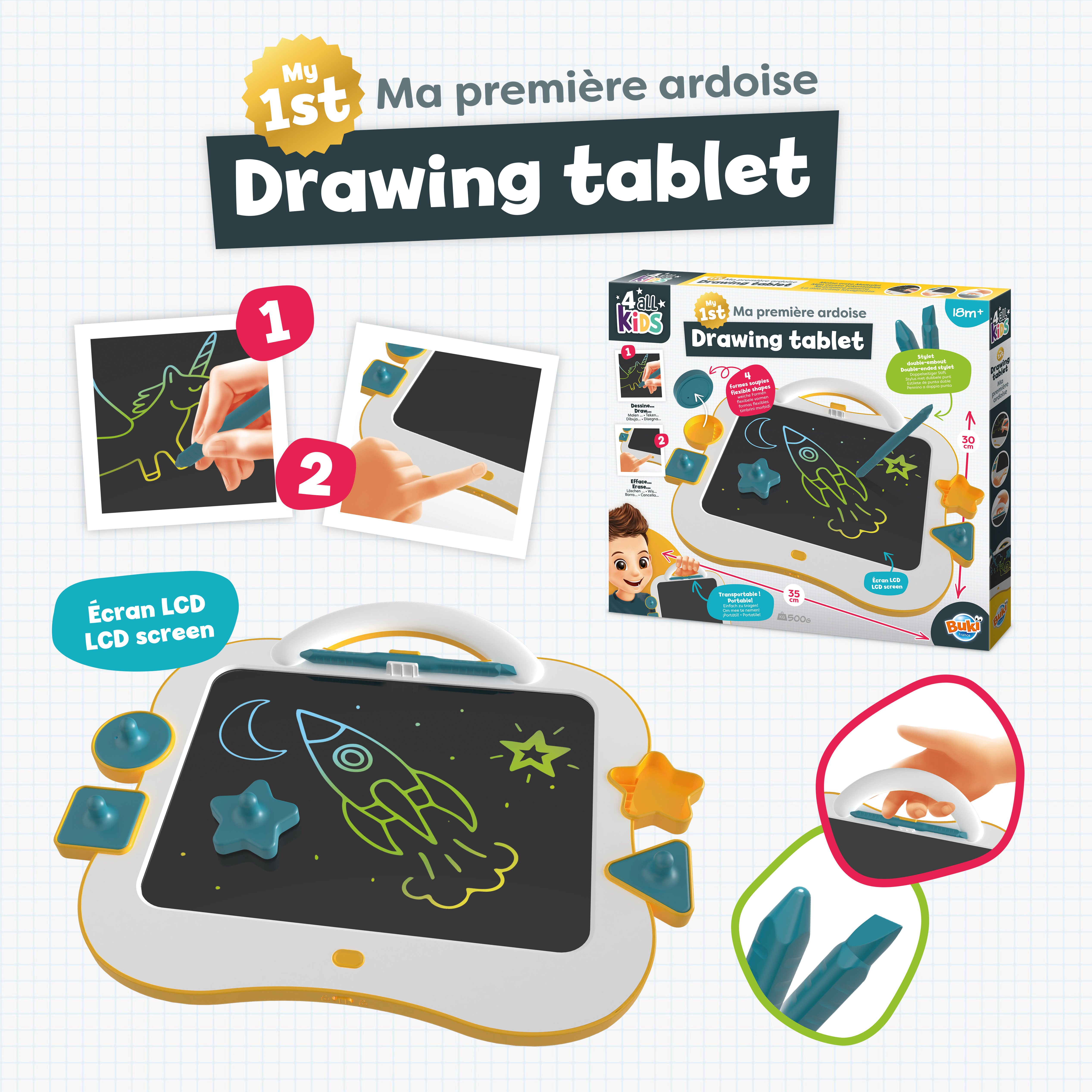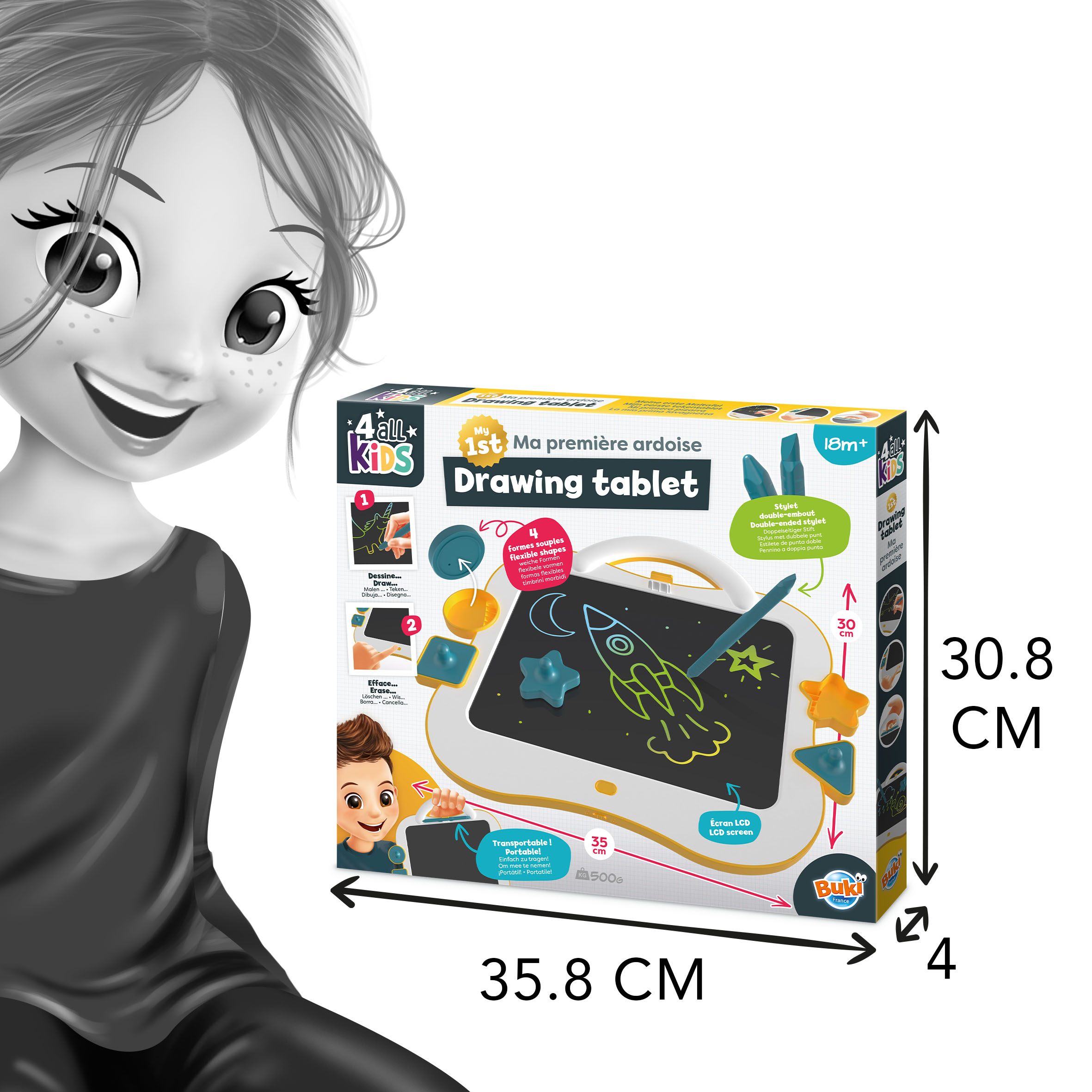 Tablet LCD do rysowania zaprojektowany specjalnie dla dzieci od 18. miesiąca życia. W zestawie znajduje się specjalny rysik oraz 4 silikonowe pieczątki w różnych kształtach, które można odbijać na ekranie.