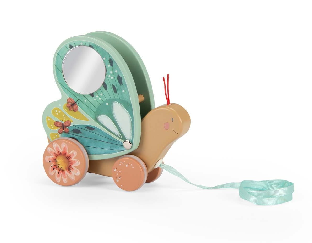 Drewniany motylek na kółkach do ciągnięcia z kolekcji Trzy Małe Króliczki czeka na wspólny spacer! Klasyczna zabawka dla małych dzieci w odsłonie od Moulin Roty. Wystarczy wziąć wstążkę do rączki, a motylek podąży za dzieckiem na swoich kółeczkach. Podczas jazdy skrzydełka motylka ruszają się, a dzwoneczek umieszczony pomiędzy nimi zaczyna dzwonić.