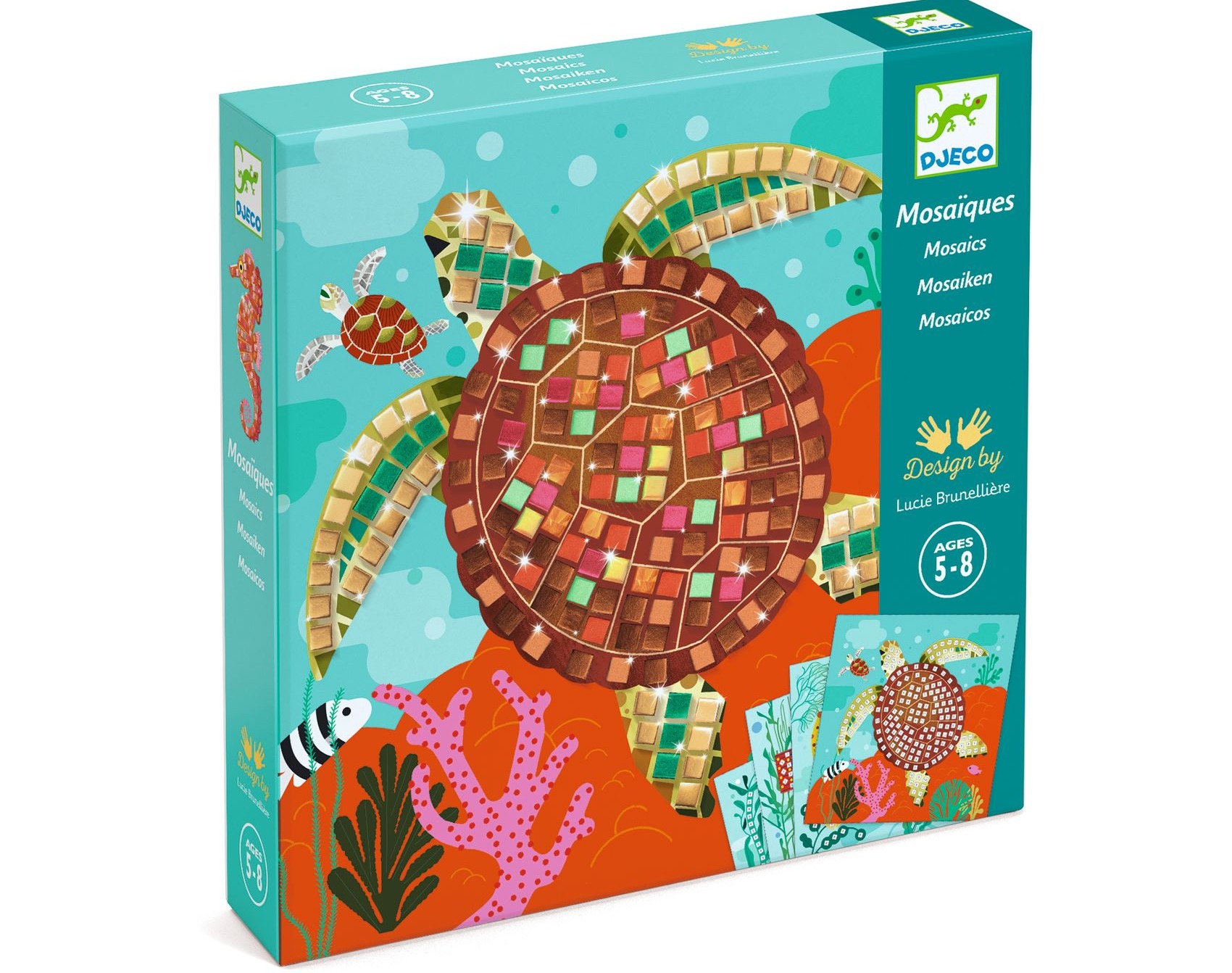 Zestaw do tworzenia mozaik z kolorowych, samoprzylepnych kwadratów. Plansze są oznaczone numerami, na podstawie których dzieci przyklejają odpowiednie elementy. Metaliczne kwadraciki ozdobią 4 plansze przedstawiające podwodny świat zwierząt.