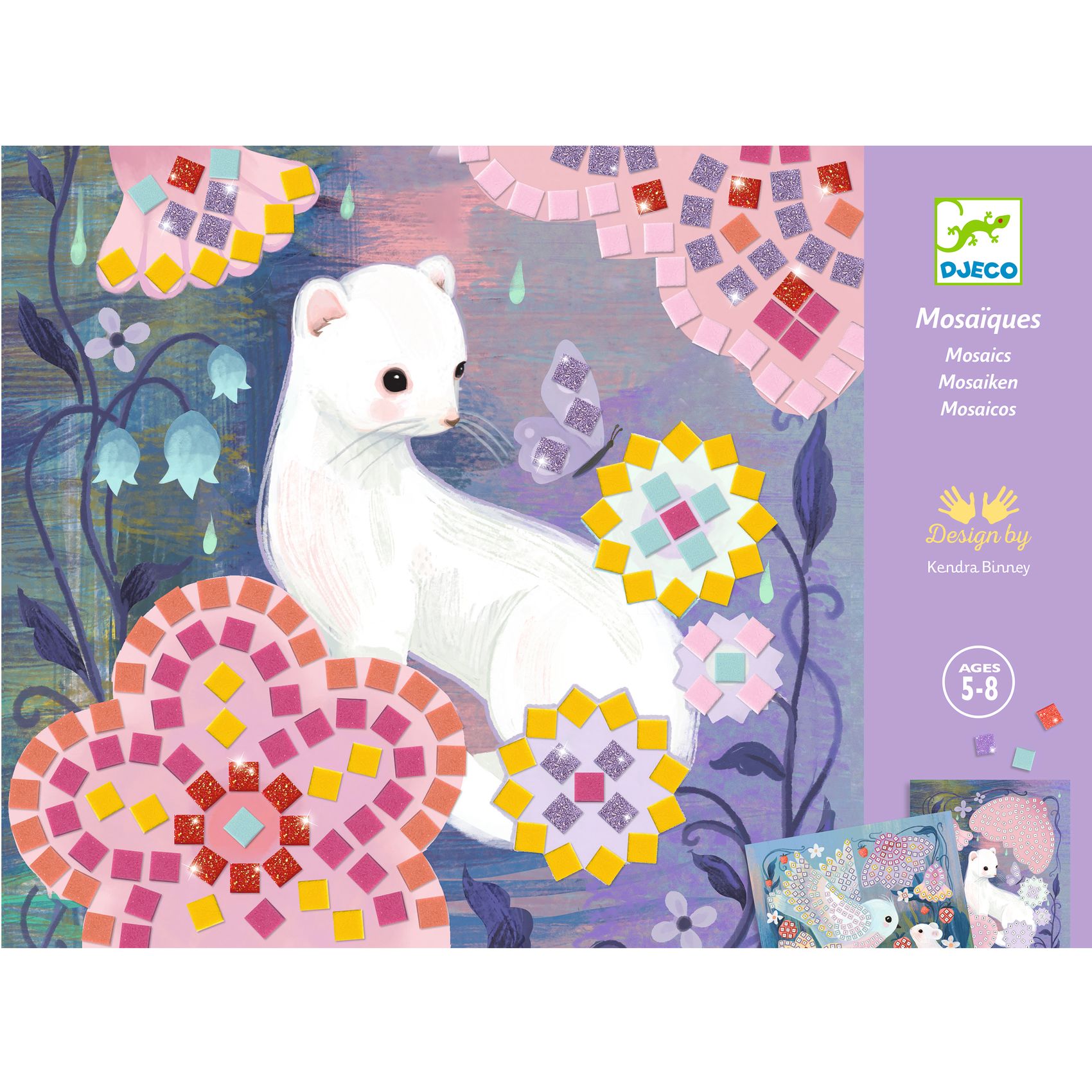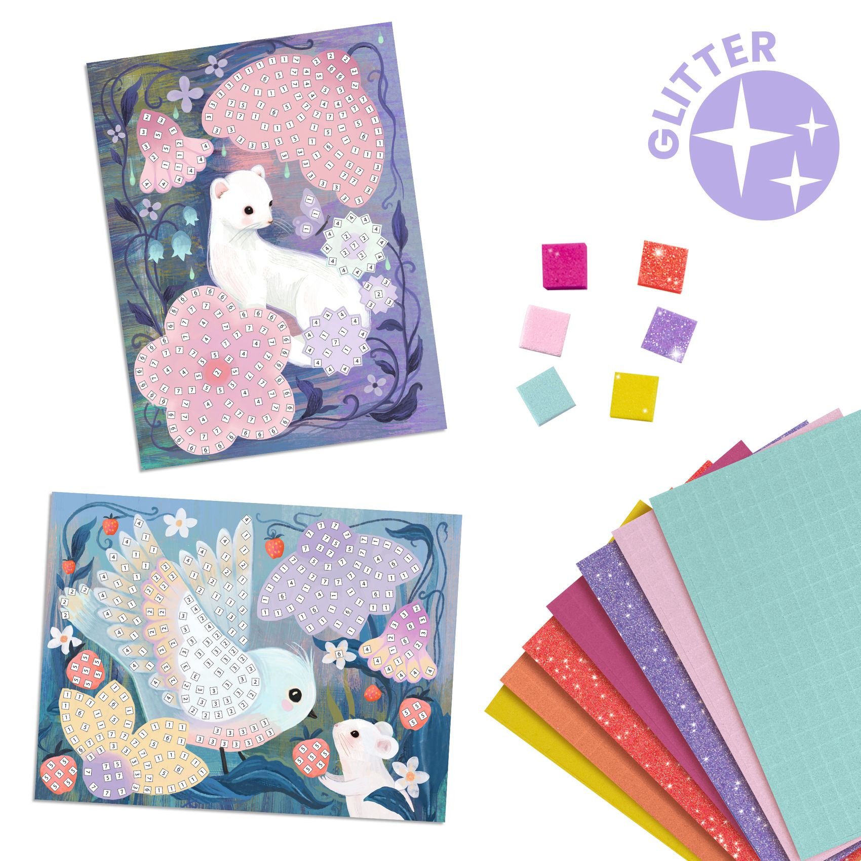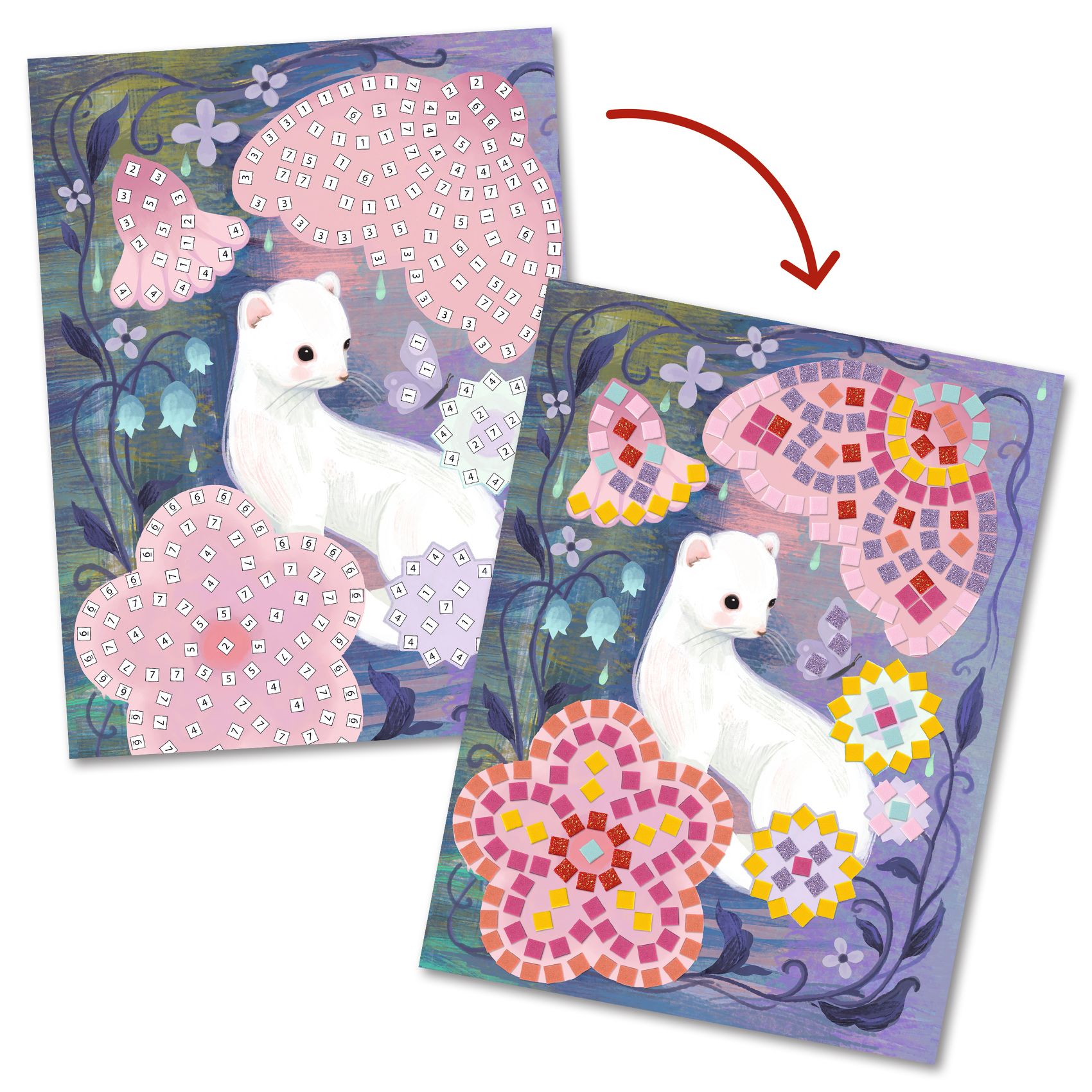 Zestaw artystyczny do tworzenia mozaik. Przepięknie ilustrowane plansze posiadają specjalnie oznakowane pola, na które przykleja się odpowiednie elementy. Każdy arkusz z naklejkami jest oznaczony liczbą. Grafiki przedstawiają leśne zwierzątka w bajecznej scenerii w odcieniach fioletu i różu.