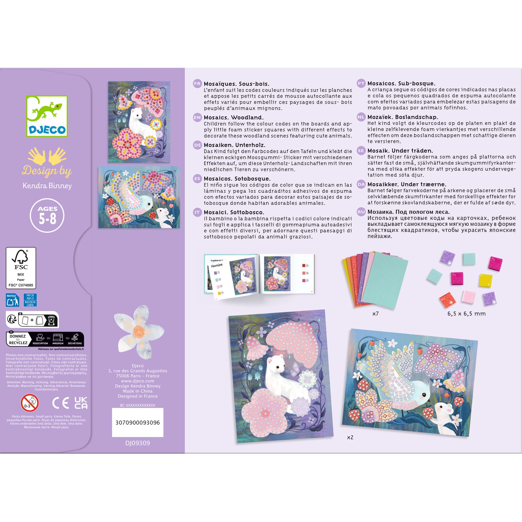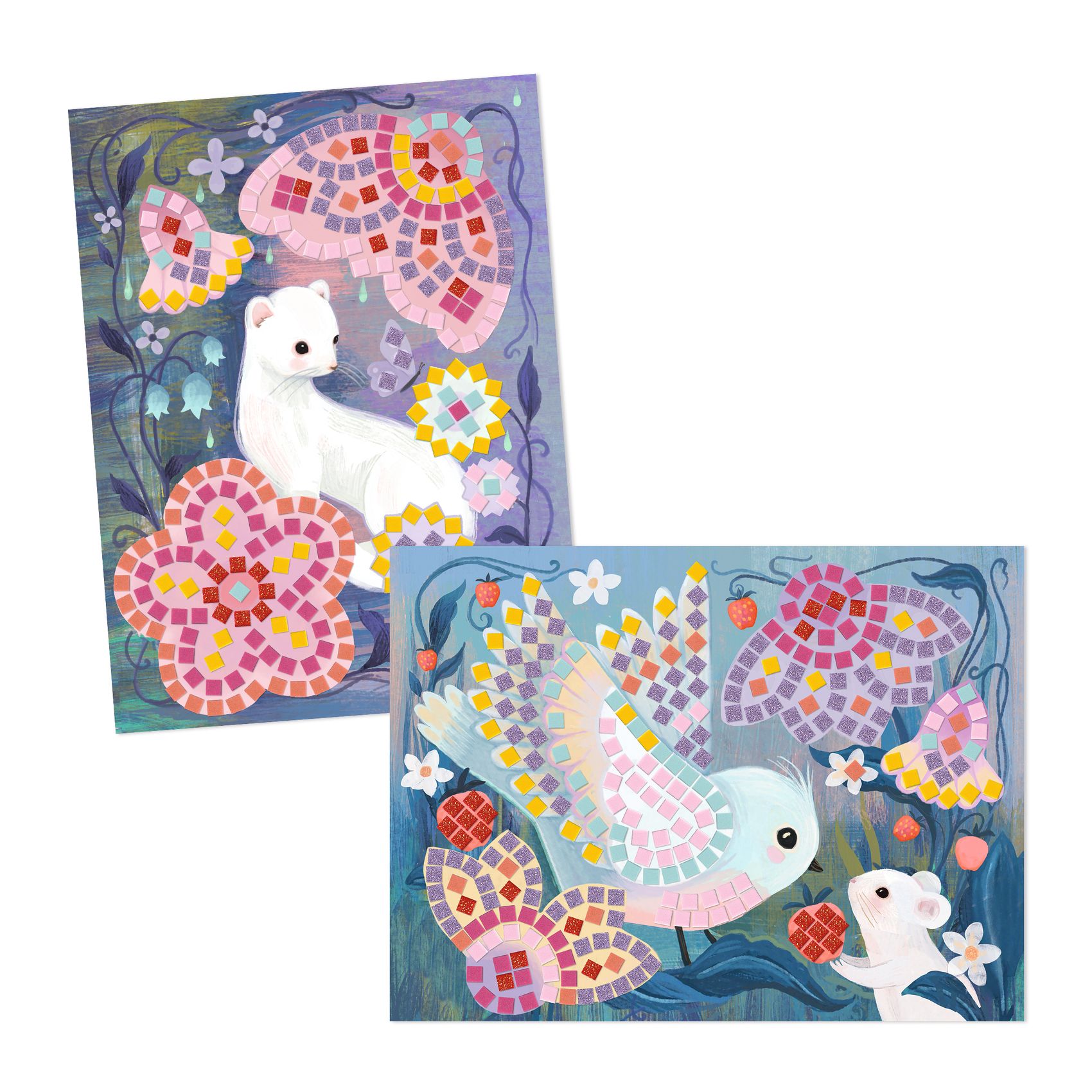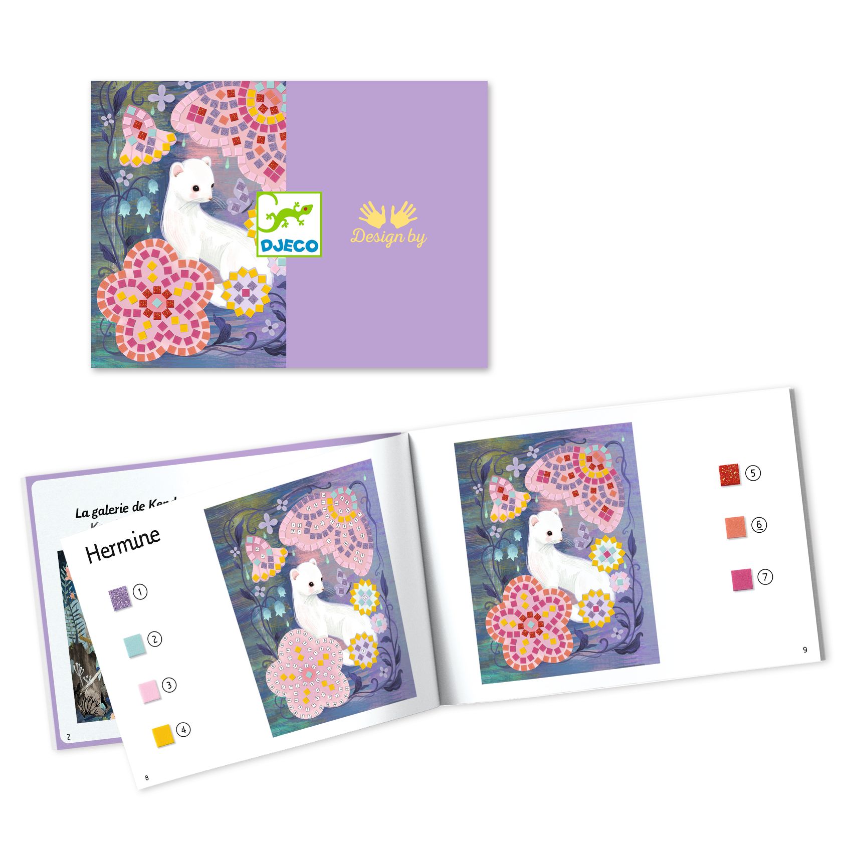 Zestaw artystyczny do tworzenia mozaik. Przepięknie ilustrowane plansze posiadają specjalnie oznakowane pola, na które przykleja się odpowiednie elementy. Każdy arkusz z naklejkami jest oznaczony liczbą. Grafiki przedstawiają leśne zwierzątka w bajecznej scenerii w odcieniach fioletu i różu.