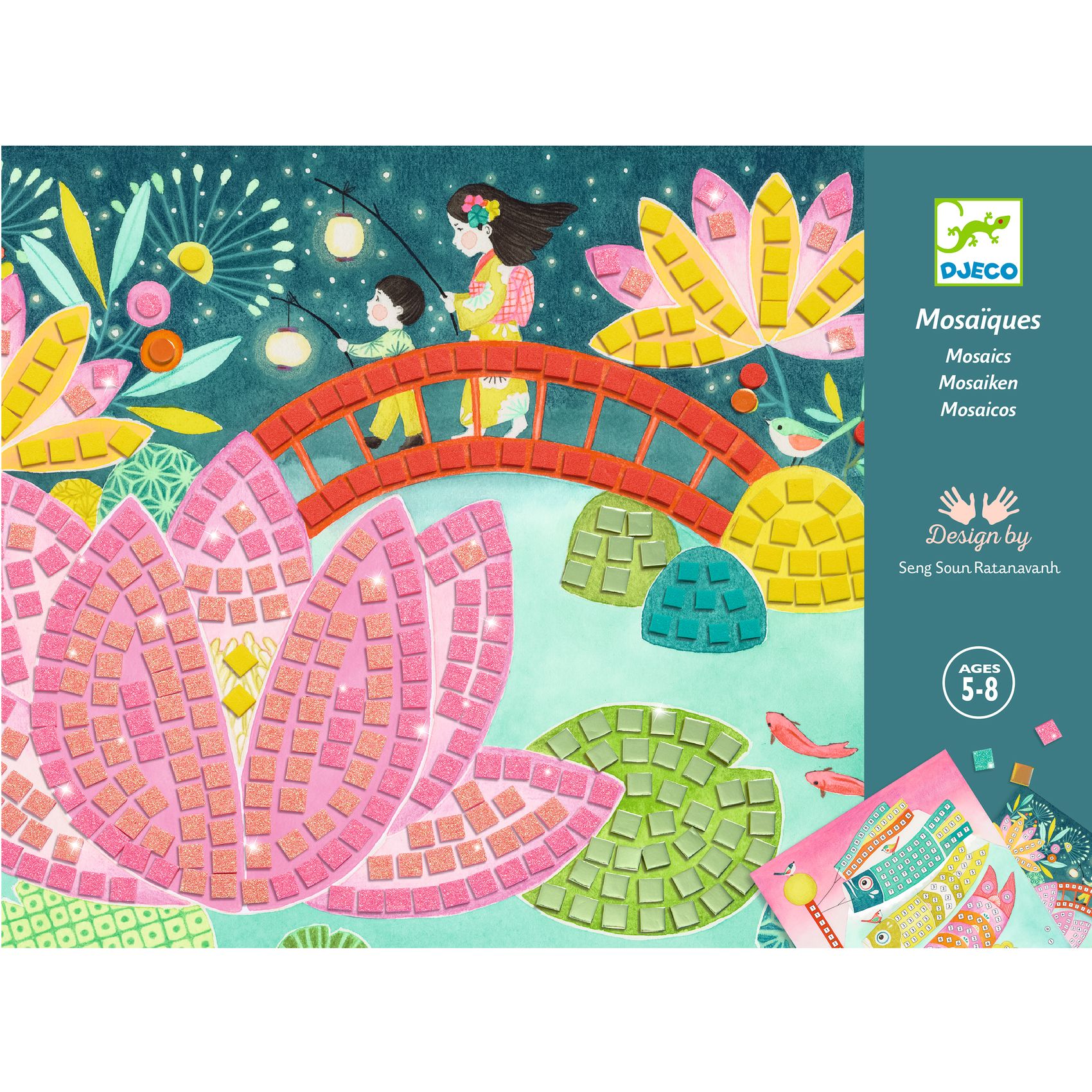 Zadanie artystyczne polegające na wyklejaniu obrazków kolorowymi kwadracikami. Stworzone mozaiki to małe dzieła sztuki, które mogą stanowić piękną ozdobę dziecięcego pokoju. Zestaw zawiera 2 grafiki w japońskim stylu. Niektóre kwadraciki do wyklejania są pokryte brokatem, co nadaje dodatkowego kunsztu obrazkom.