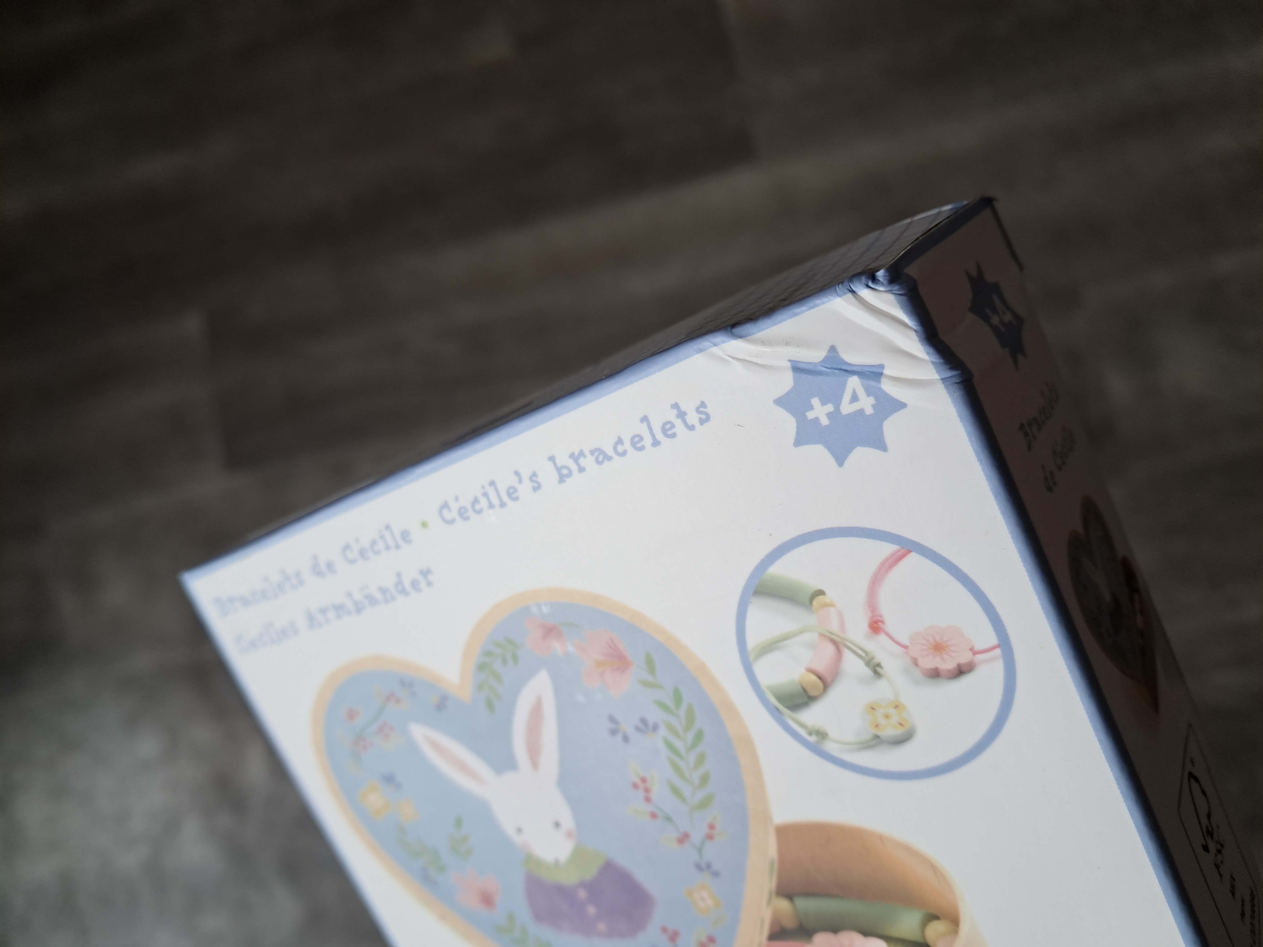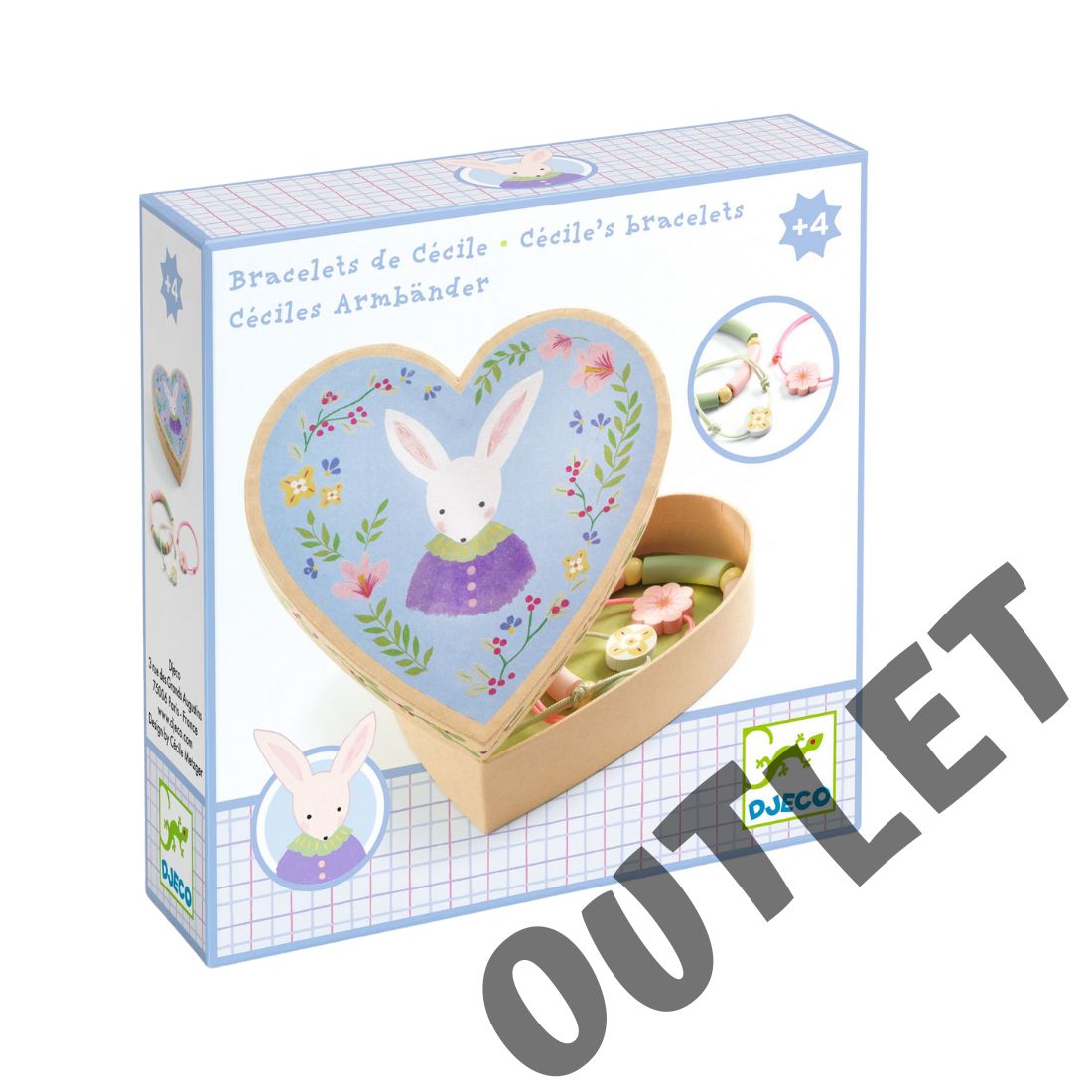 Prześliczne pudełeczko w kształcie serca skrywa trzy bransoletki dla małej modnisi. Ilustrowane wizerunkiem uroczego króliczka, będzie stanowić prawdziwą skrzynię skarbów. Wykonane z grubego kartonu. Dwie bransoletki na sznurku mają regulowany rozmiar od 10 do 18 cm w obwodzie. Koraliki na trzeciej bransoletce są drewniane.
