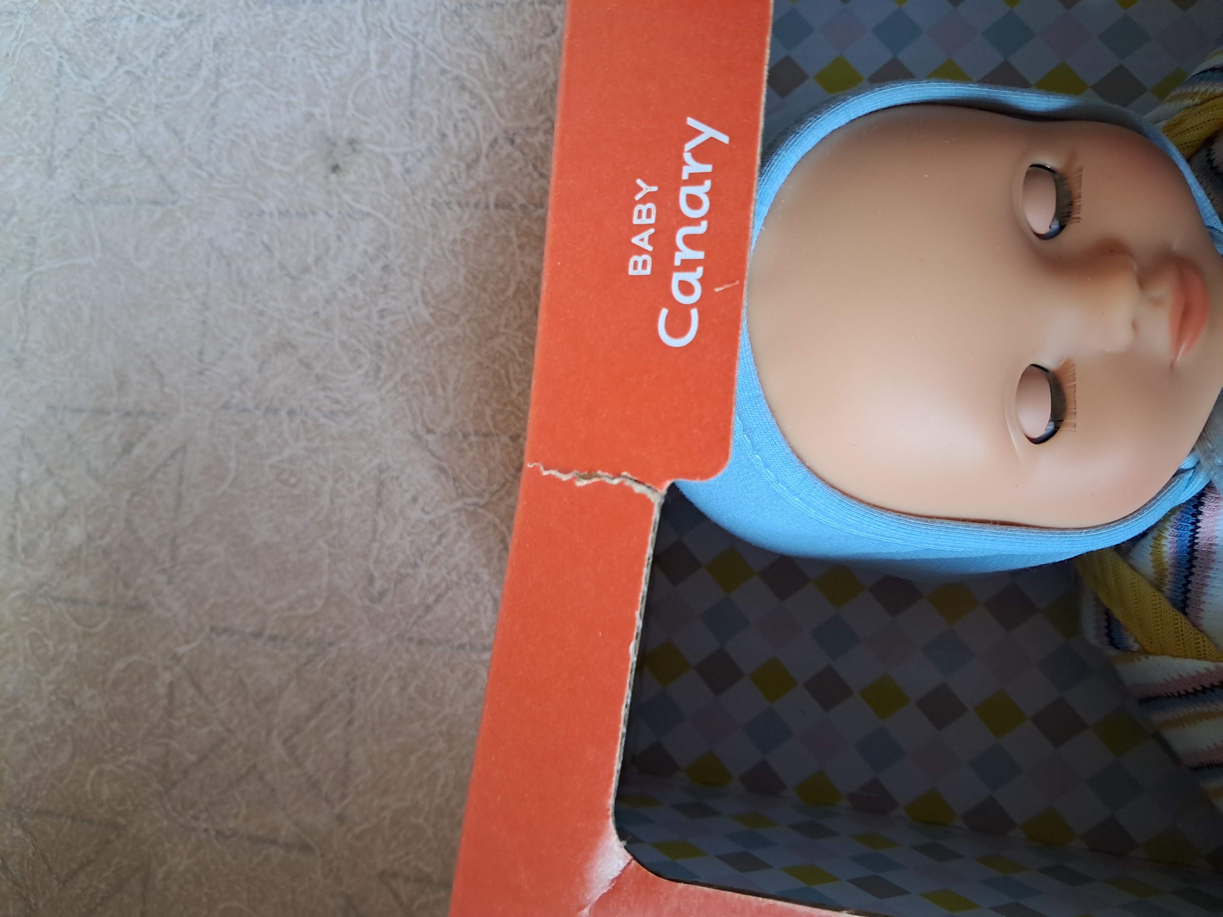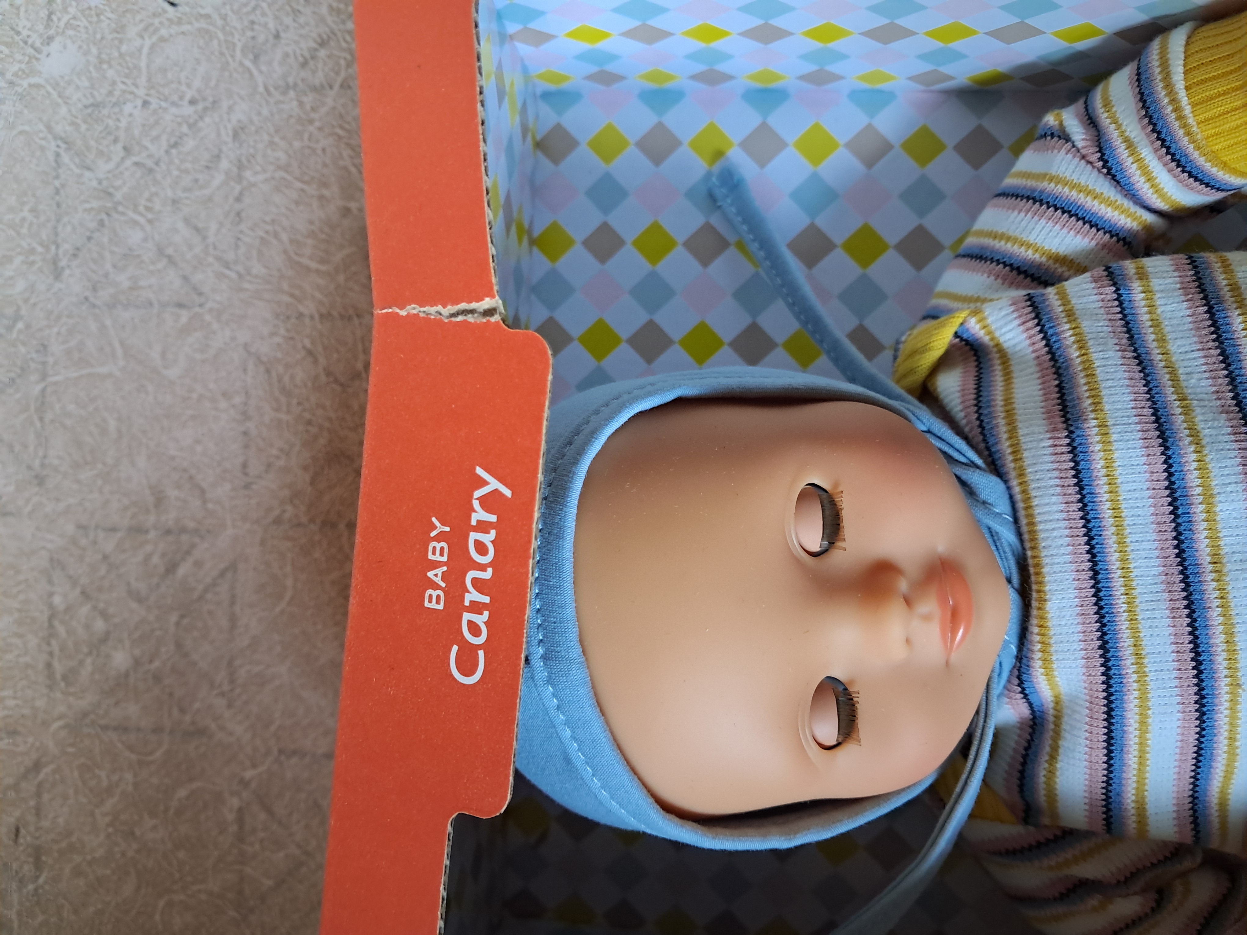 Z pięknymi niebieskimi oczami i eleganckim strojem, lalka Canary to
