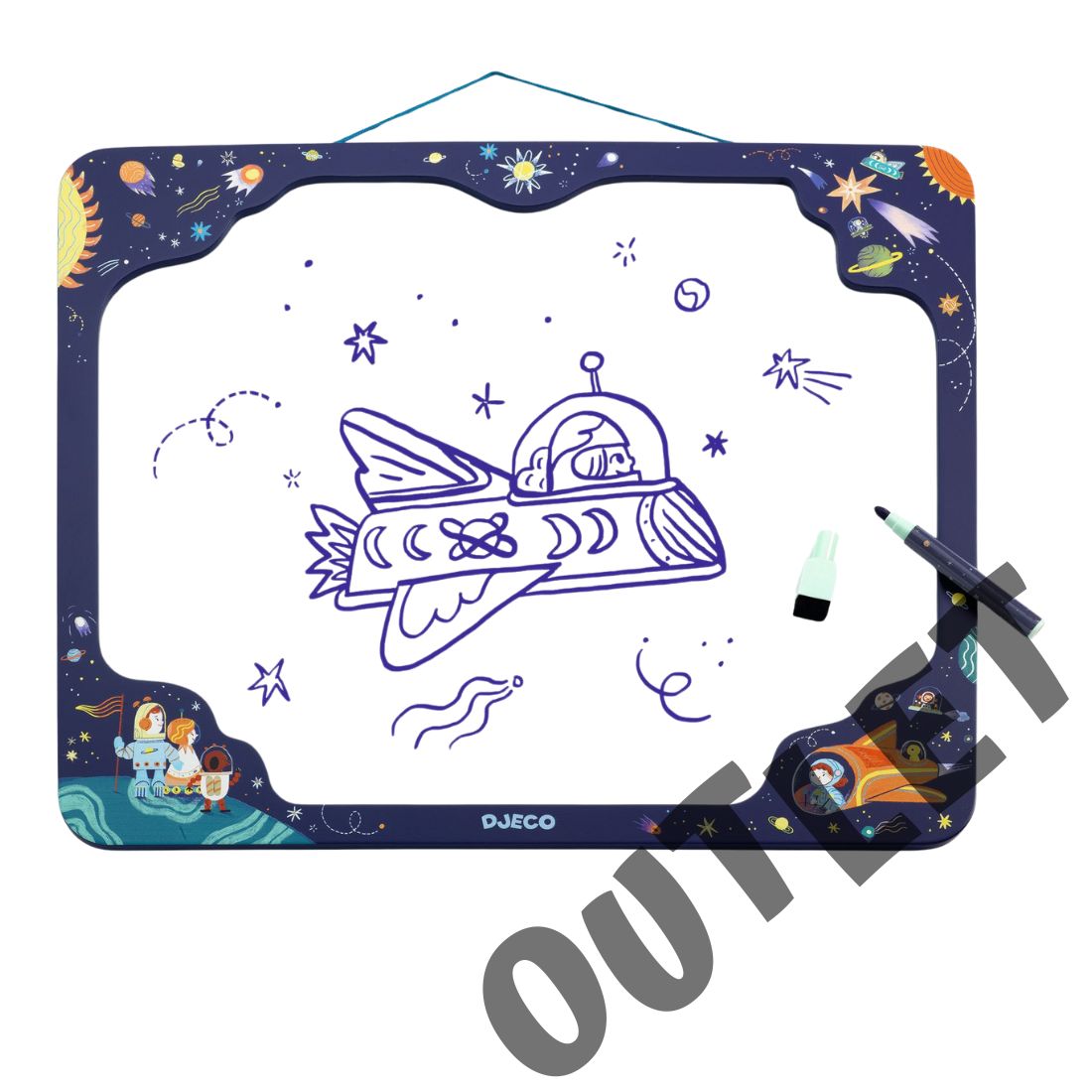 Tablica magnetyczna suchościeralna w ozdobnej ramce to funkcjonalna i praktyczna ozdoba dzięcięcego pokoju. Można jej używać do zapisywania notatek, rysowania lub wieszania zdjęć. Otaczająca ją drewniana ramka jest ozdobiona rysunkami z kosmicznym motywem.