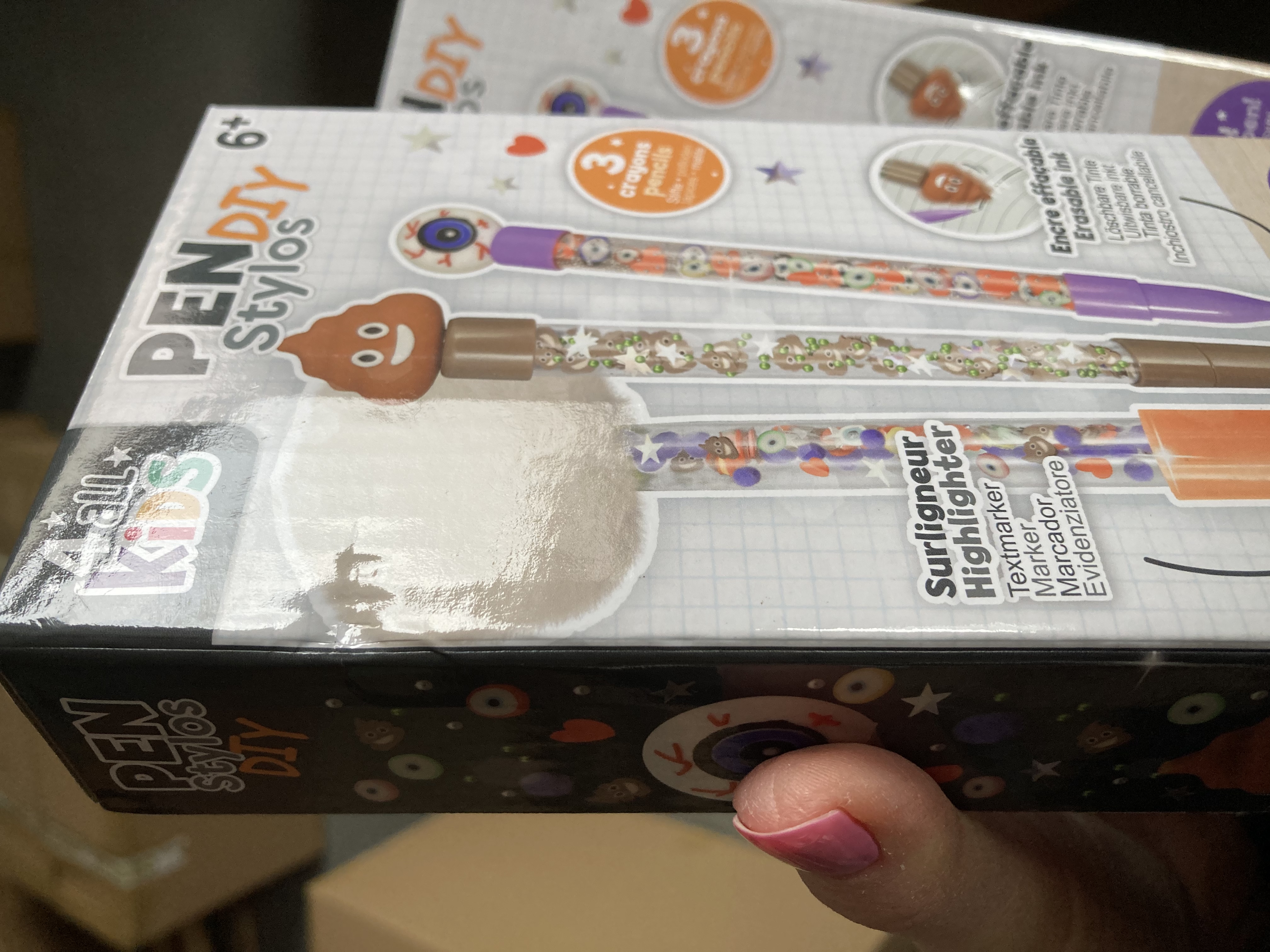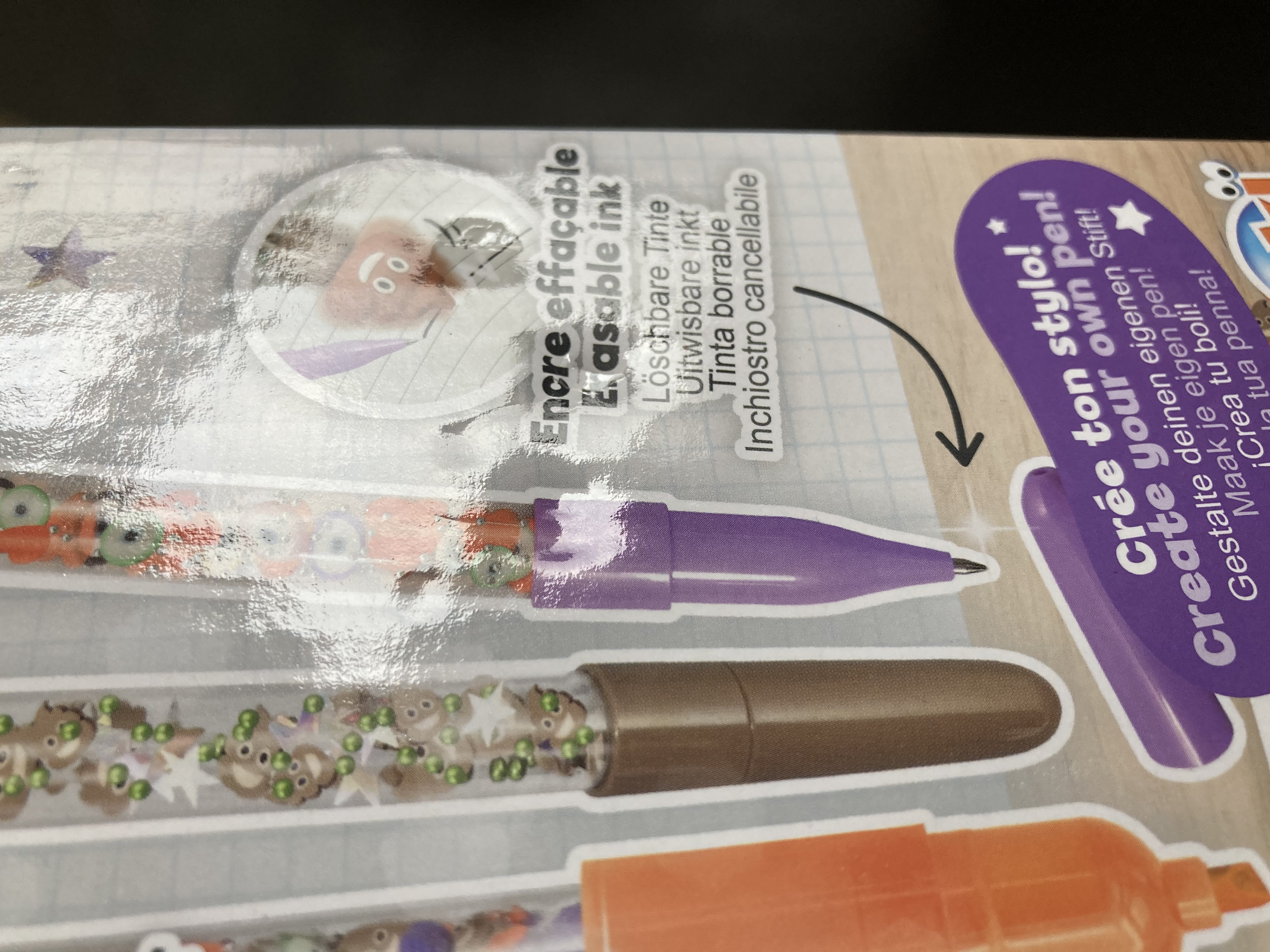 Długopisy posiadają zmywalne tusze, które można wymazać załączonymi figurkami w kształcie kupki i oka. W zestawie znajdują sie dwa rodzaje zapasowych wkładów (niebieskie i czarne).