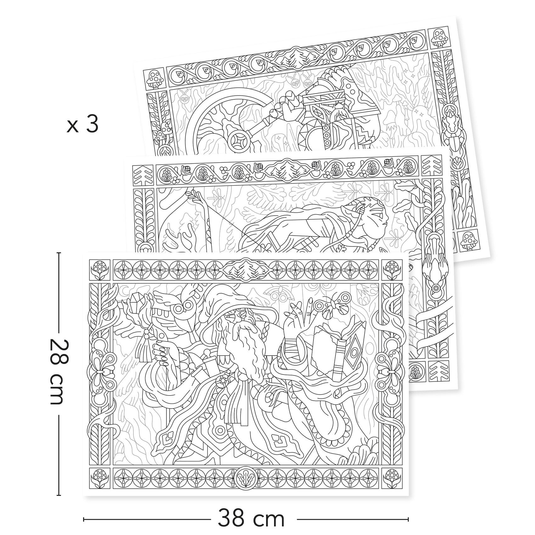 Zestaw 3 dużych kolorowanek w formie obrazów dla starszych dzieci i dorosłych! Kolorowanka przedstawia postacie z mitów i legend o magicznych mocach. Kolorystyka z białym tłem i czarnymi liniami.
