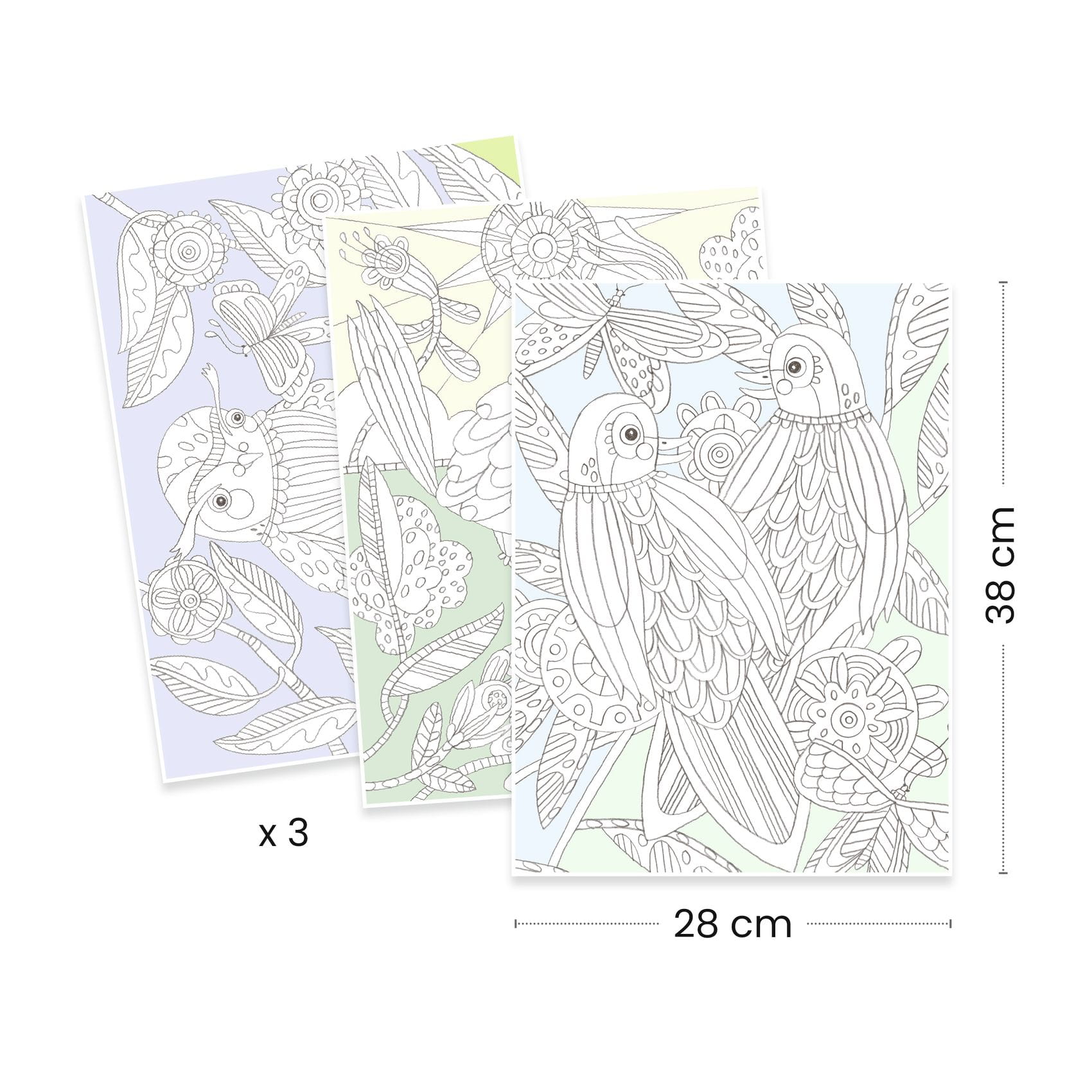 Zestaw 3 dużych kolorowanek w formie obrazów dla starszych dzieci i dorosłych! Zanurz się w świecie kolorowych ptaków. Tło arkuszy jest w dwóch odcieniach, z białymi elementami motywów do pokolorowania.