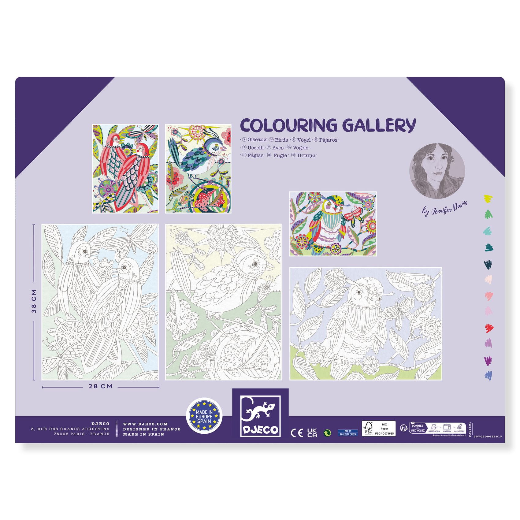 Arkusze są zapakowane w ozdobną teczkę, w której można bezpiecznie przechowywać swoje dzieła. Każdy obraz będzie unikatowy, w zależności od wizji autora. Kolorowanki zostały wyprodukowane w Hiszpanii z papieru i kartonu posiadającego certyfikat FSC®.