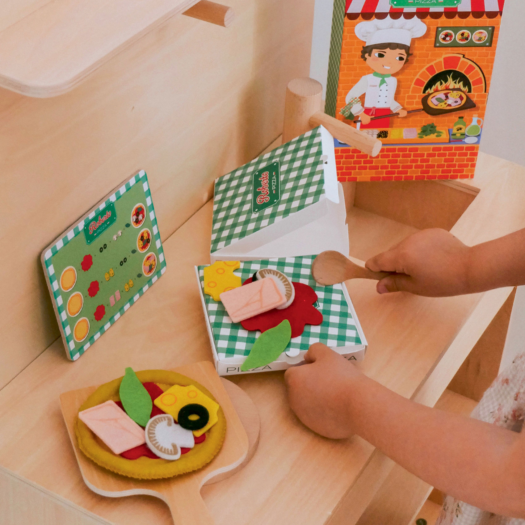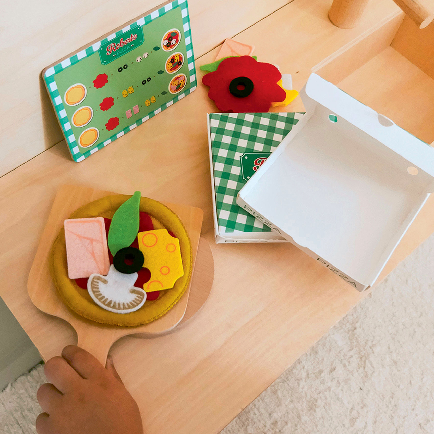 Zestaw do odgrywania ról to 2 bazy do pizzy wykonane z zamszu, filcowe dodatki spożywcze, pudełka na pizzę z dowozem, drewniana łopata podajnik, piecyk oraz menu.