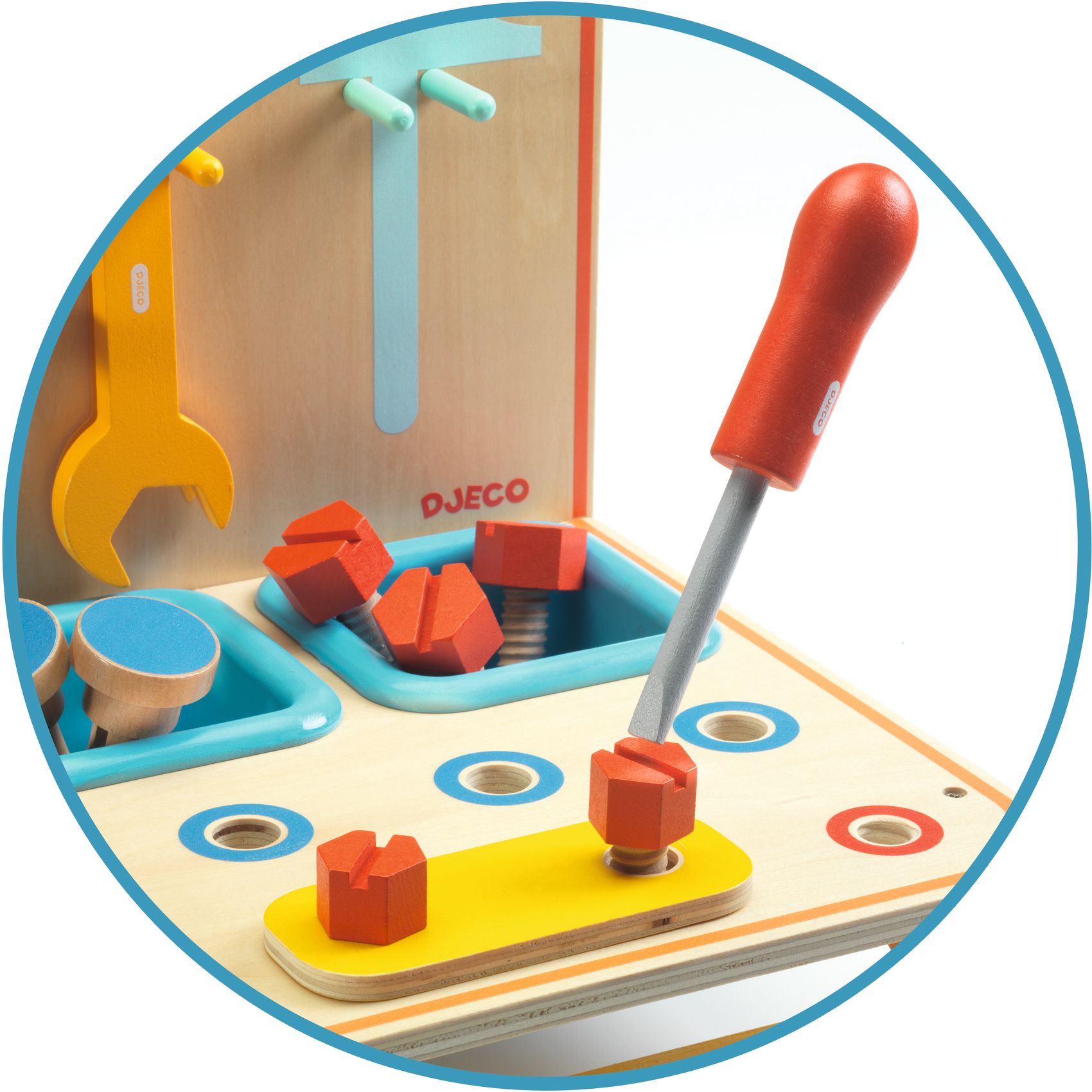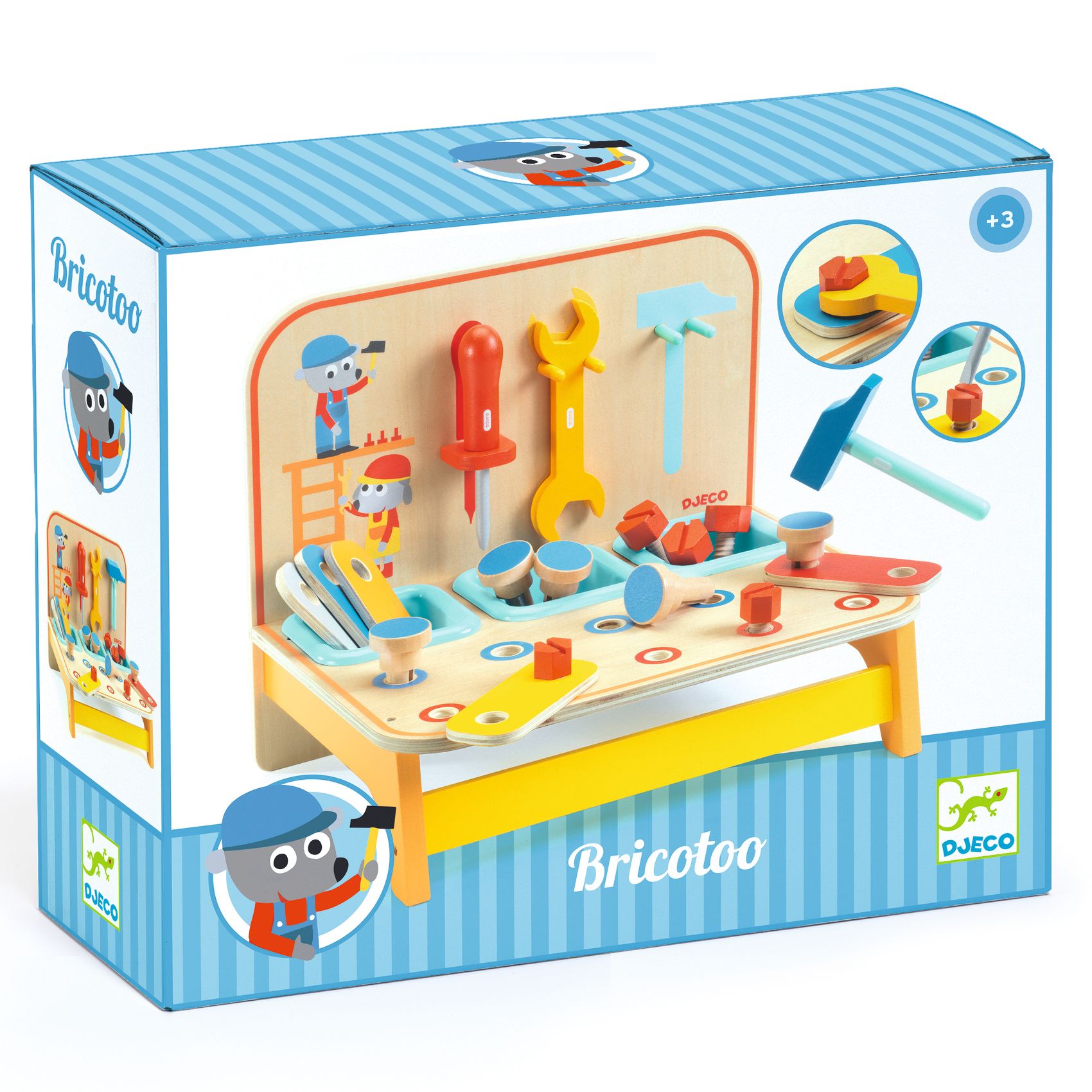 Stół warsztatowy ze wszystkimi niezbędnymi akcesoriami dla małych majsterkowiczów. Każde narzędzie ma specjalnie dopasowany rozmiar do małych rączek, dzięki czemu jest łatwe w obsłudze dla dzieci. Na stole znajdują się 3 głębokie przegródki, w których dzieci mogą sortować i porządkować drobne akcesoria. Pełny zestaw mini stołu warsztatowego zawiera 18 elementów.