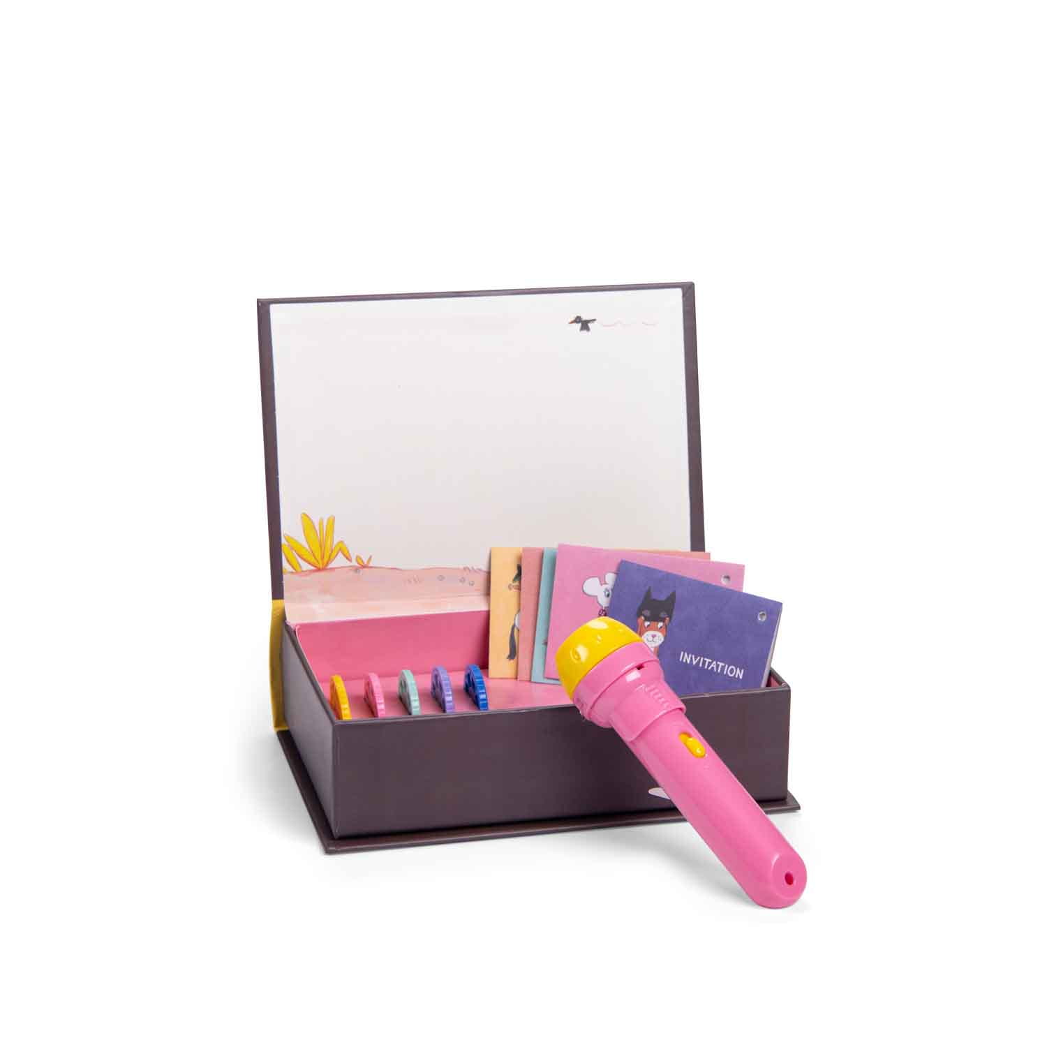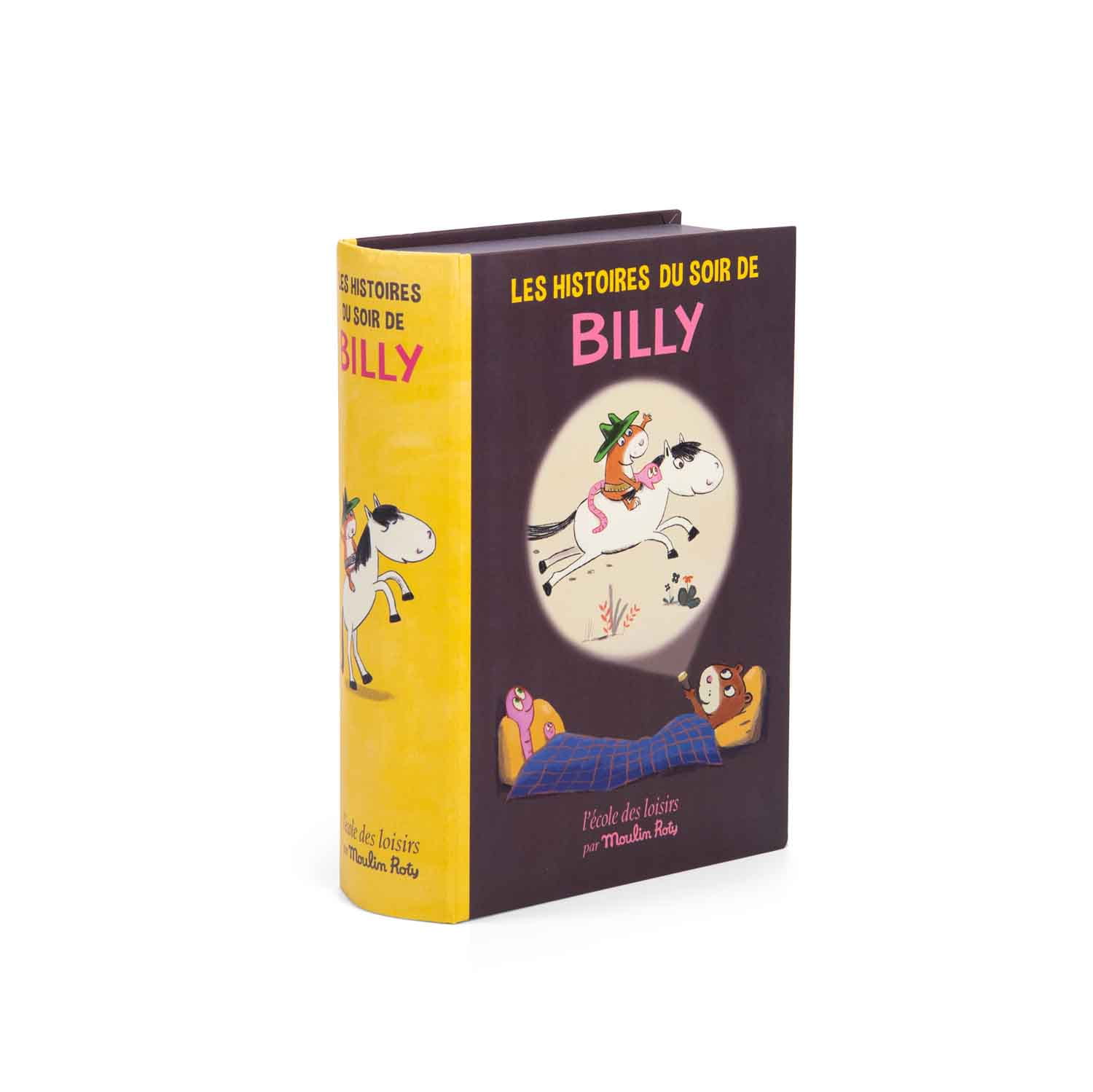 To piękne pudełko zaprojektowane jako książka ukrywa lampkę do projekcji 5 opowieści oesołych przygodach BILLY'EGO. Zanurz się w 5 różnych historyjkach dzięki flagowemu produktowi Moulin Roty. Łatwo to działa: włóż historyjkę do lampki, włącz, a obrazy wyświetlą się na ścianie lub suficie. Zestaw zawiera również karty z zaproszeniem na występy w formie mini-kopert z tajnymi wiadomościami.