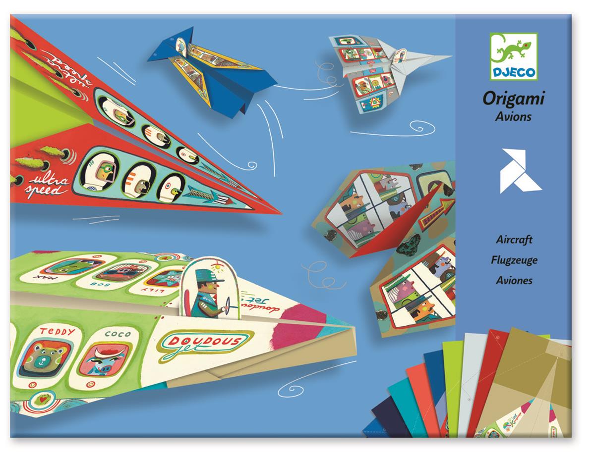 Zestaw ORIGAMI: do zrobienia 20-tu samolotów.  Zestaw zawiera: 20kartek origami z zaznaczonymi liniami do składania i wzorami samolotów, 20naklejek z postaciami pilotów książeczka instruktażowa obrazkowa "krok pokroku"