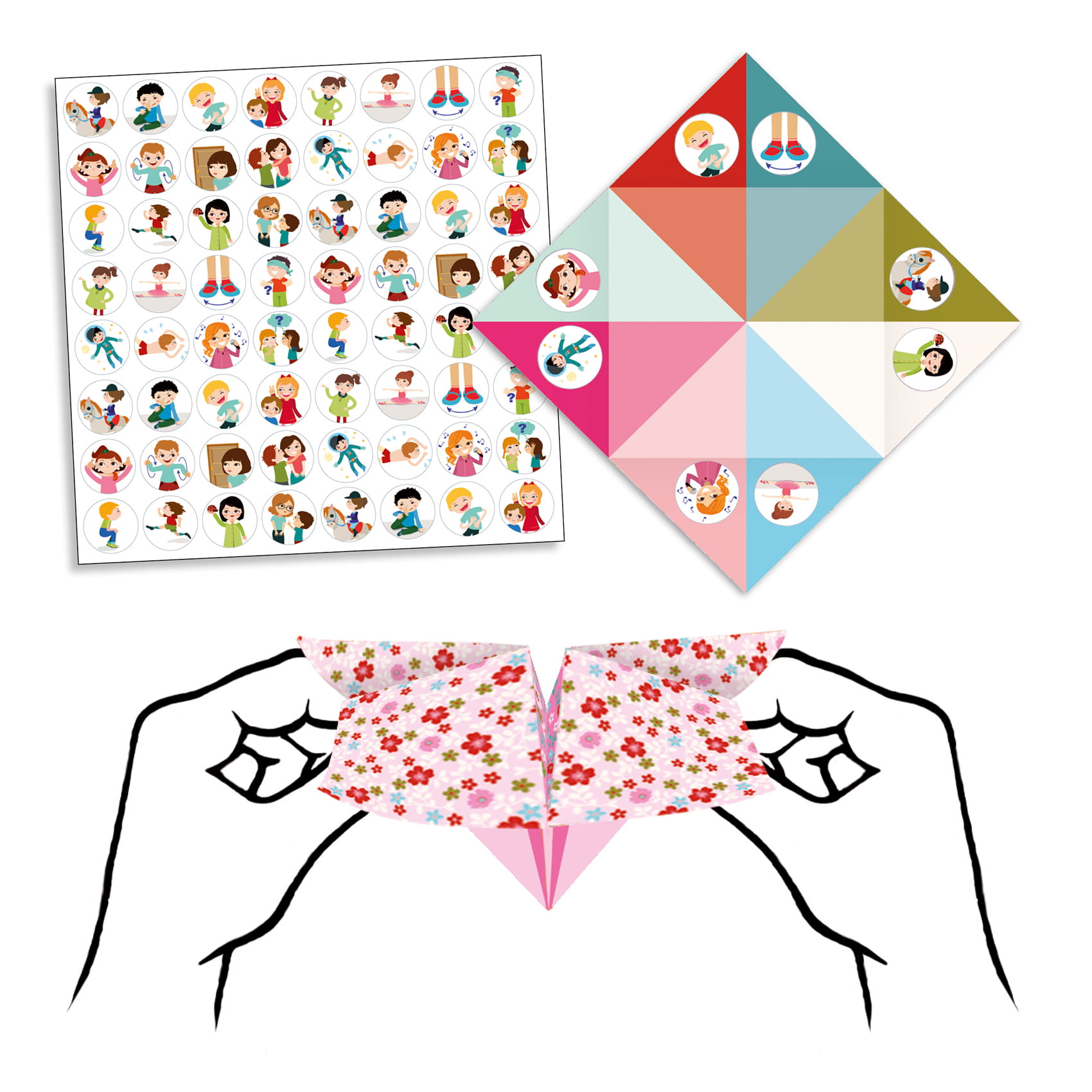 zawiera: 24 kartki origami (6 wzorów), 3 arkusze naklejek z zabawnymi