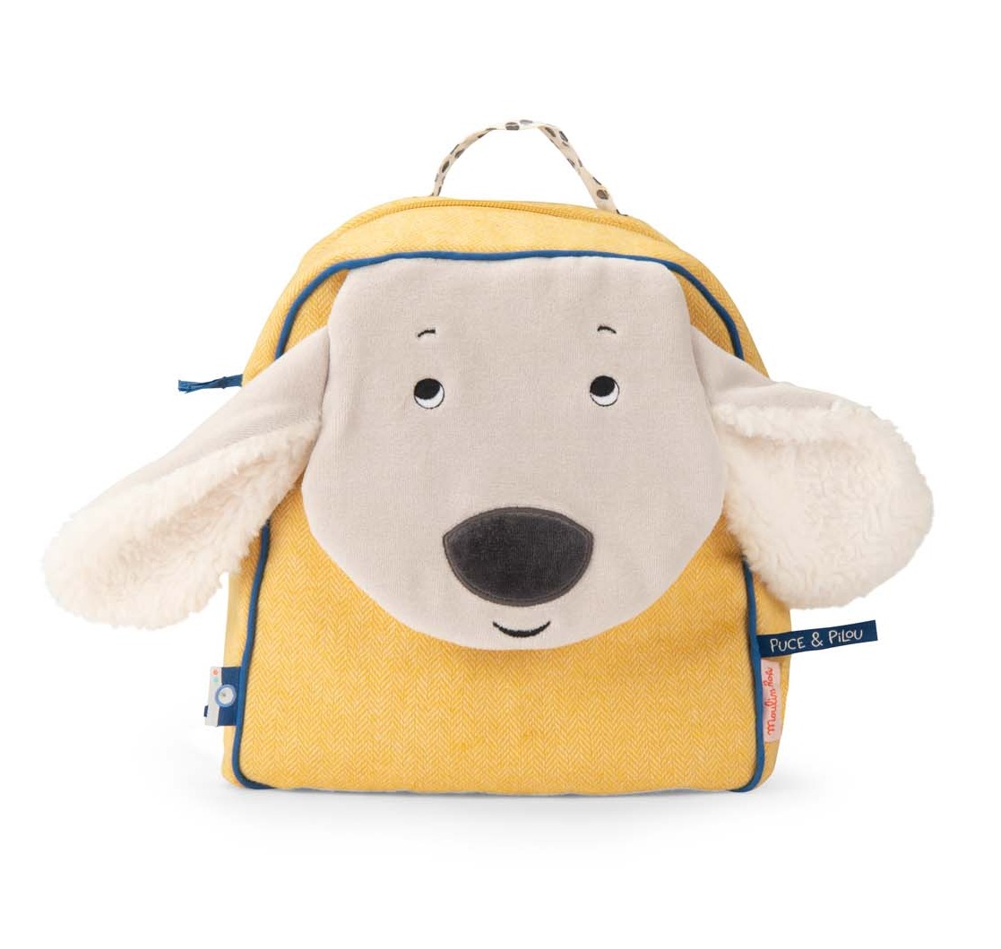 Żółty plecaczek z klapą w kształcie uroczej buźki pieska Pilou z puszystymi uszami, pochodzący z kolekcji Puce & Pilou. Plecak jest praktyczny i wytrzymały, zapinany na zamek błyskawiczny z regulowanymi szelkami. Posiada jedną przegrodę główną i kieszeń z przodu. Na froncie można wygrawerować imię dziecka. Wykonany z żółtego materiału w delikatną jodełkę.