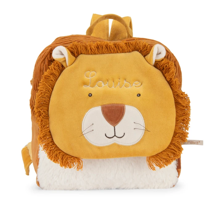 Brązowy plecaczek z klapą w kształcie uroczej buźki lwa Mamba z frędzelkową grzywą, pochodzący z kolekcji La Foret Mawa. Oprócz komory głównej pod klapą z przodu znajduje się mięciutka kieszonka pokryta białym futerkiem. Plecak jest praktyczny i wytrzymały, zapinany na zamek błyskawiczny z regulowanymi szelkami.