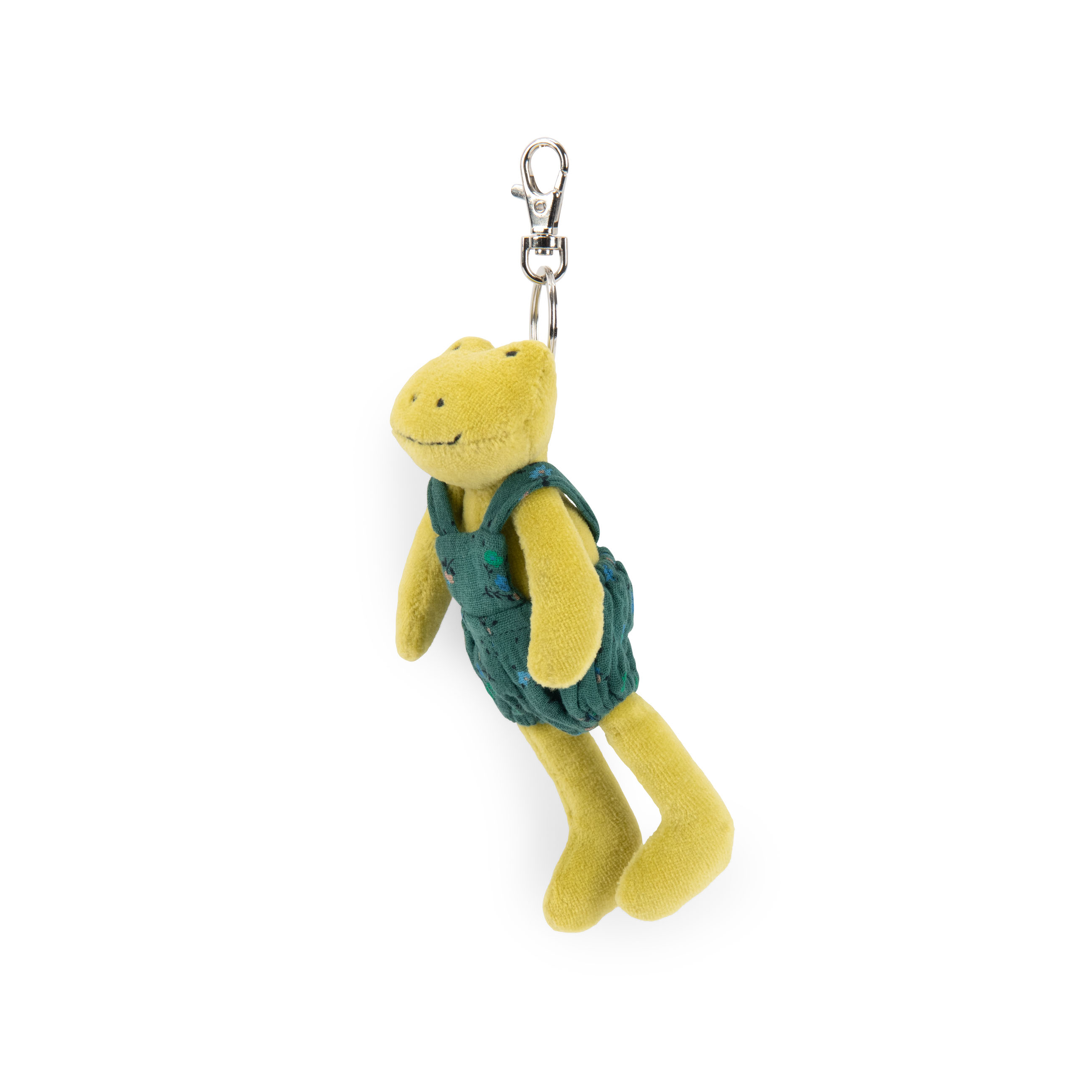 przywieszkę do plecaka lub torebki. Ubrana jest w ciemnozielone ogrodniczki.