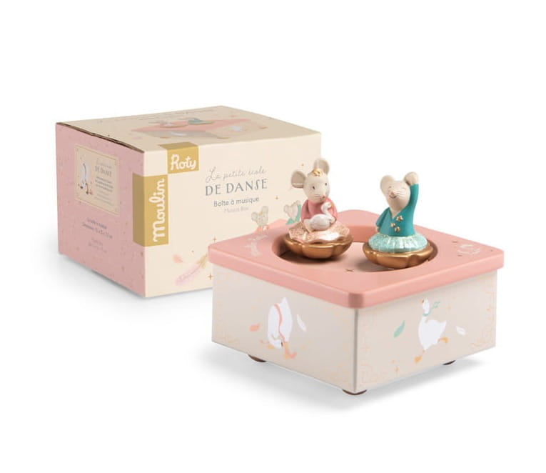 Myszki z kolekcji MAŁA SZKOŁA TAŃCA szykują się do występu! Są gotowe pokazać swój układ choreograficzny każdemu ciekawemu maluszkowi. Drewniana pozytywka od Moulin Roty wydaje delikatną melodię, po nakręceniu metalowego uchwytu. W tym samym czasie figurki myszek wykonane z żywicy zaczynają swój popisowy taniec, wirując wokół własnej osi na wierzchu pozytywki. Zabawka może służyć jako pomoc w usypianiu maluszków lub dawać radość starszym dzieciom, które samodzielnie mogą ją nakręcać i obserwować ruch myszek. Zabawka jest pomalowana na piękne pastelowe barwy. Idealne wyposażenie dziecięcego pokoju. Powierzchnię pozytywki można czyścić delikatną i wilgotną ściereczką.