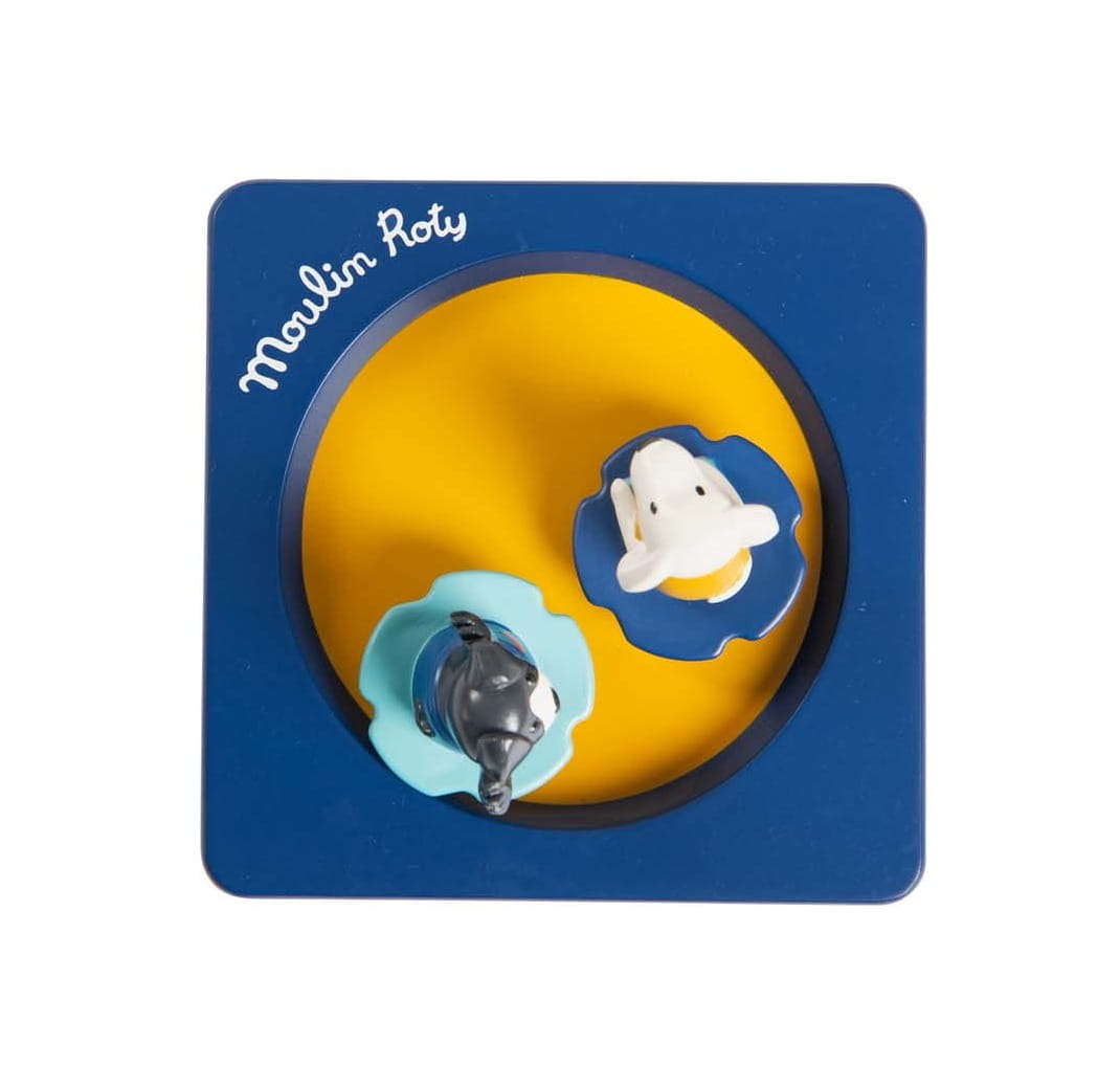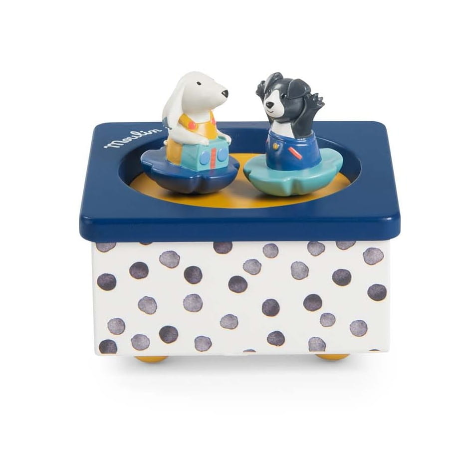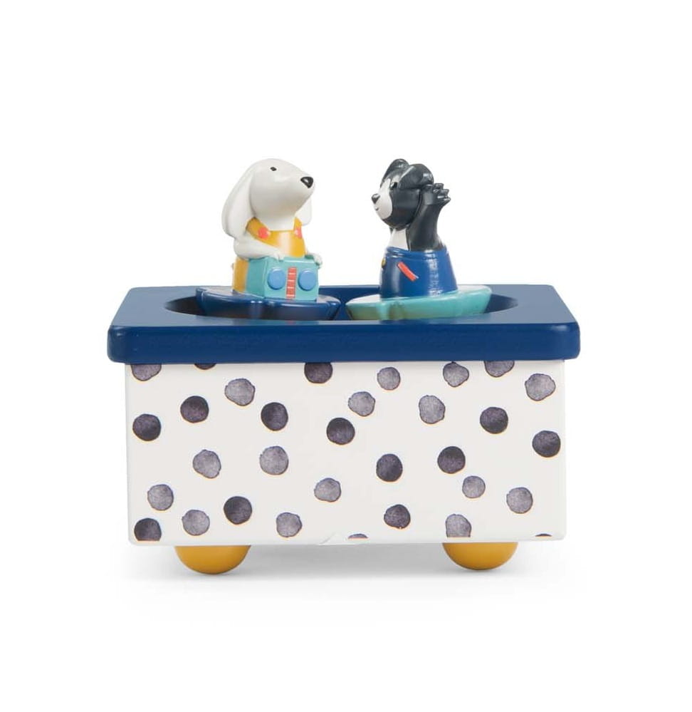 Pozytywka z serii PUCE & PILOU ma formę drewnianej skrzyneczki. Pozytywkę nakręca się za pomocą metalowego uchwytu - wówczas zaczyna grać delikatna melodyjka, a 2 figurki zwierzątek umieszczone na wierzchu pozytywki zaczynają wirować wokół własnej osi. Pozytywka jest utrzymana w charakterystycznej dla kolekcji kolorystyce granatowo-żółtej, boki są białe w czarne kropki. Idealne wyposażenie dziecięcego pokoju.