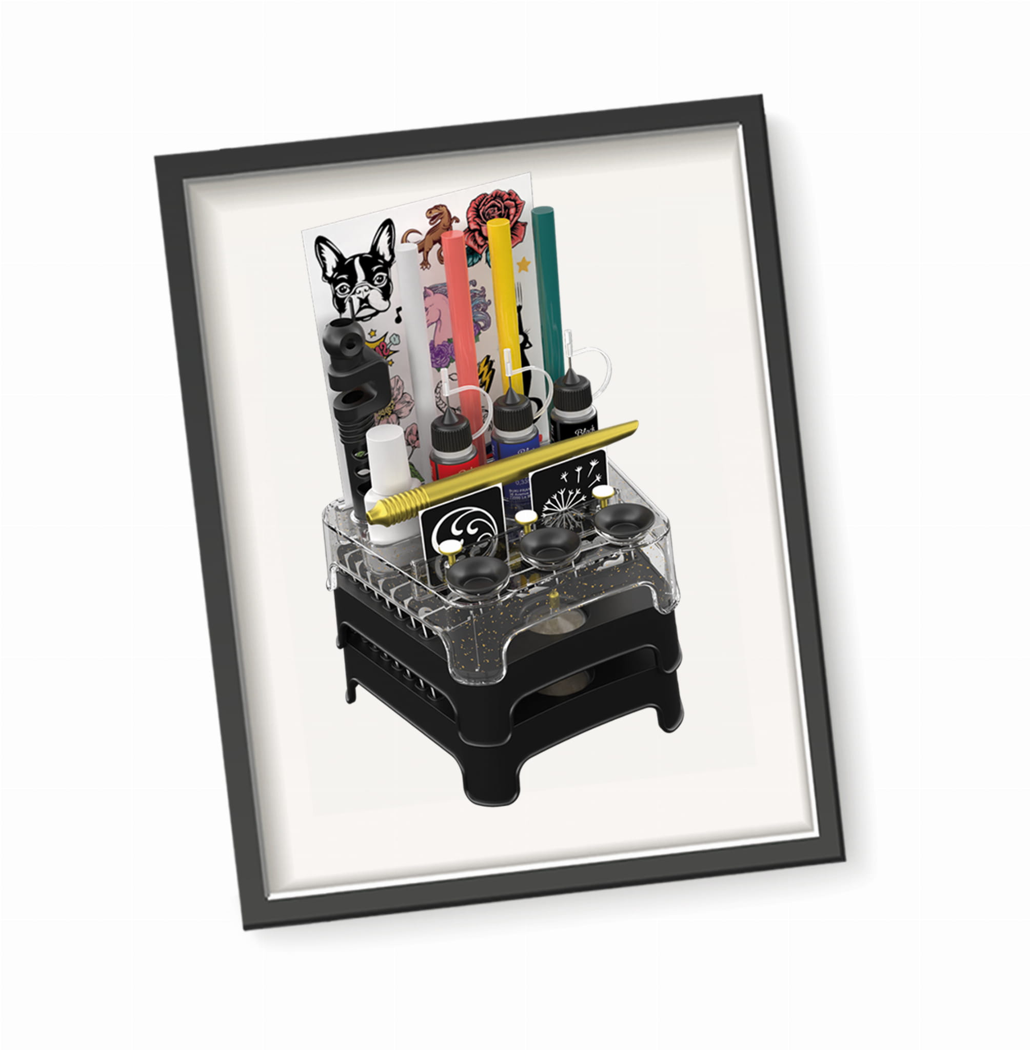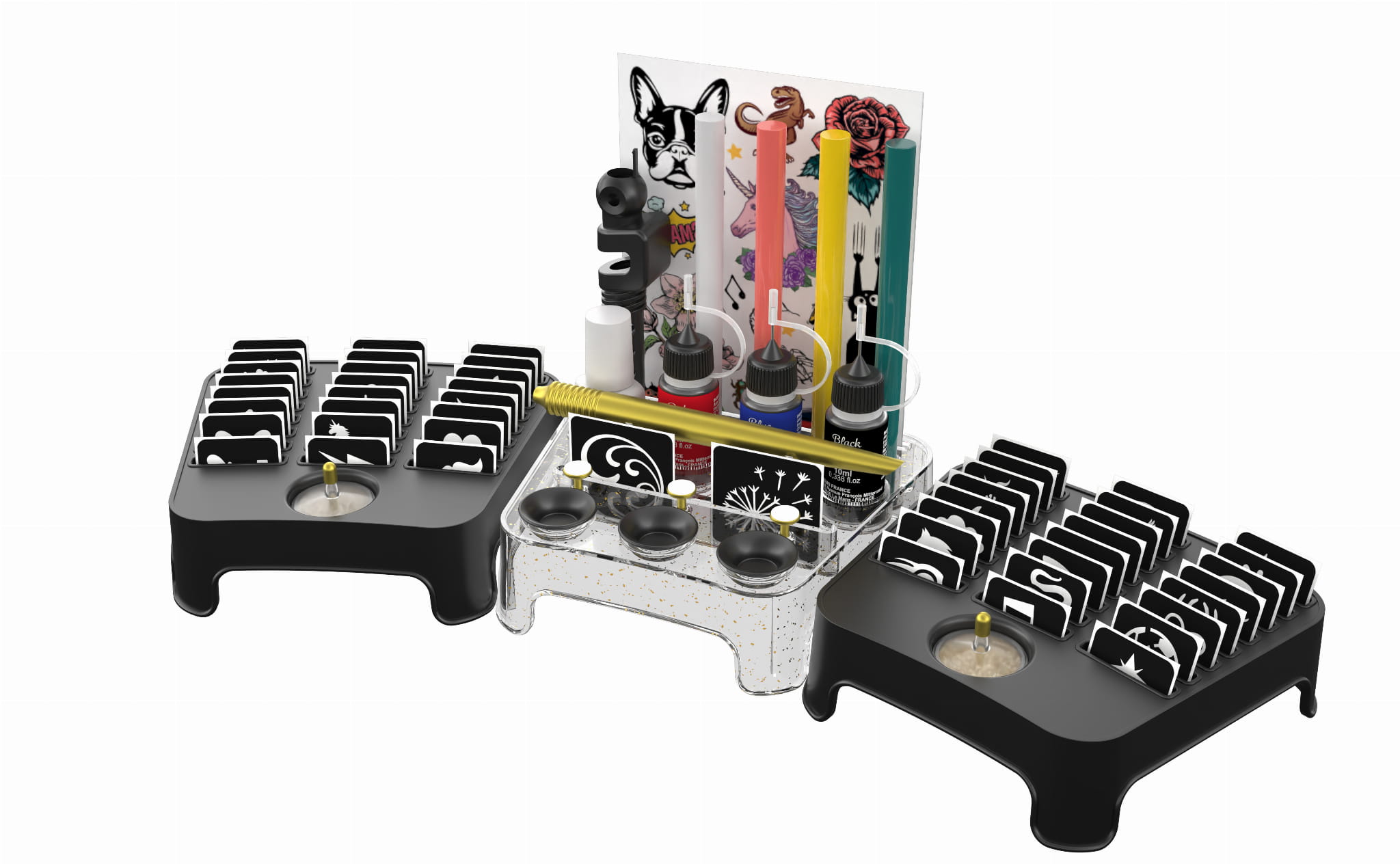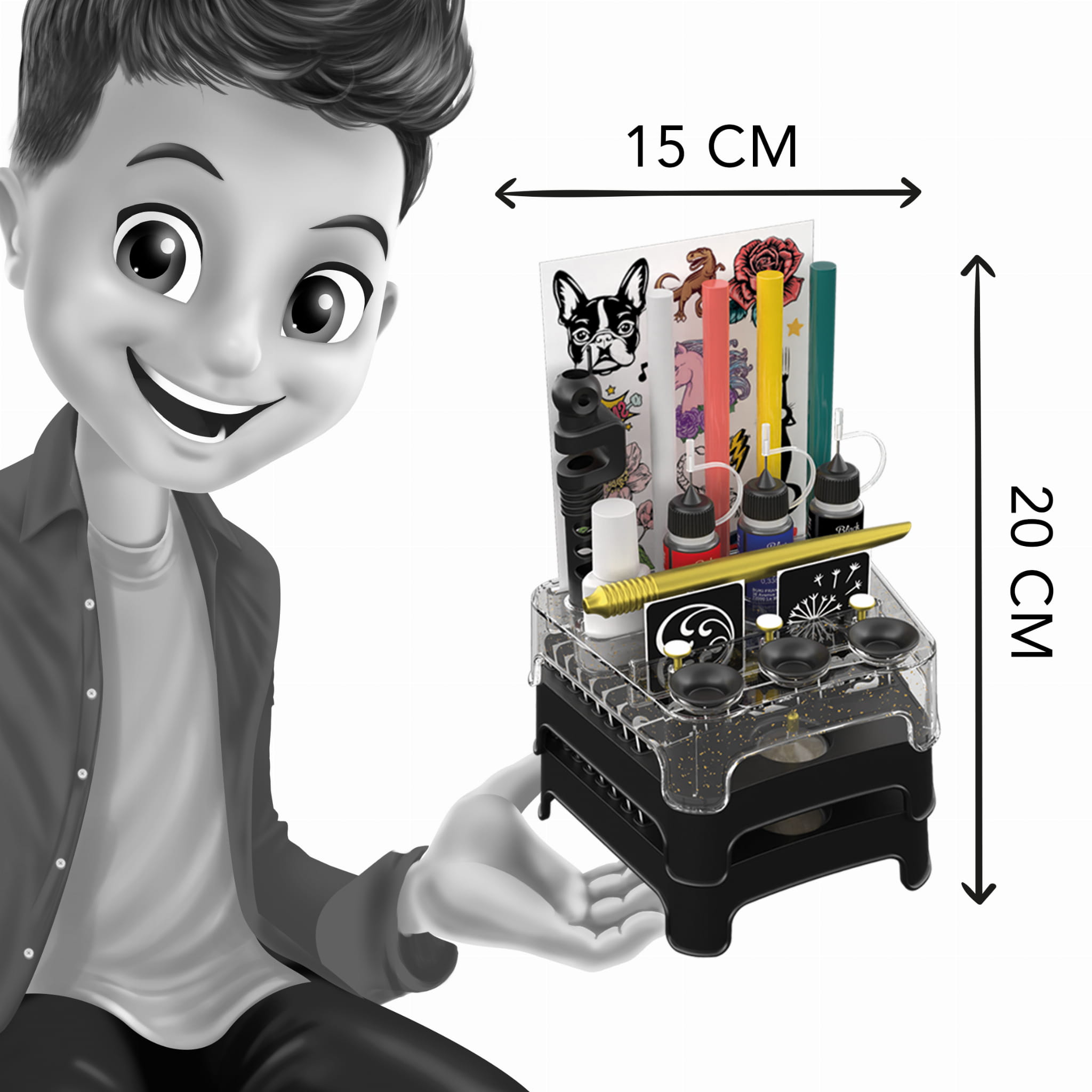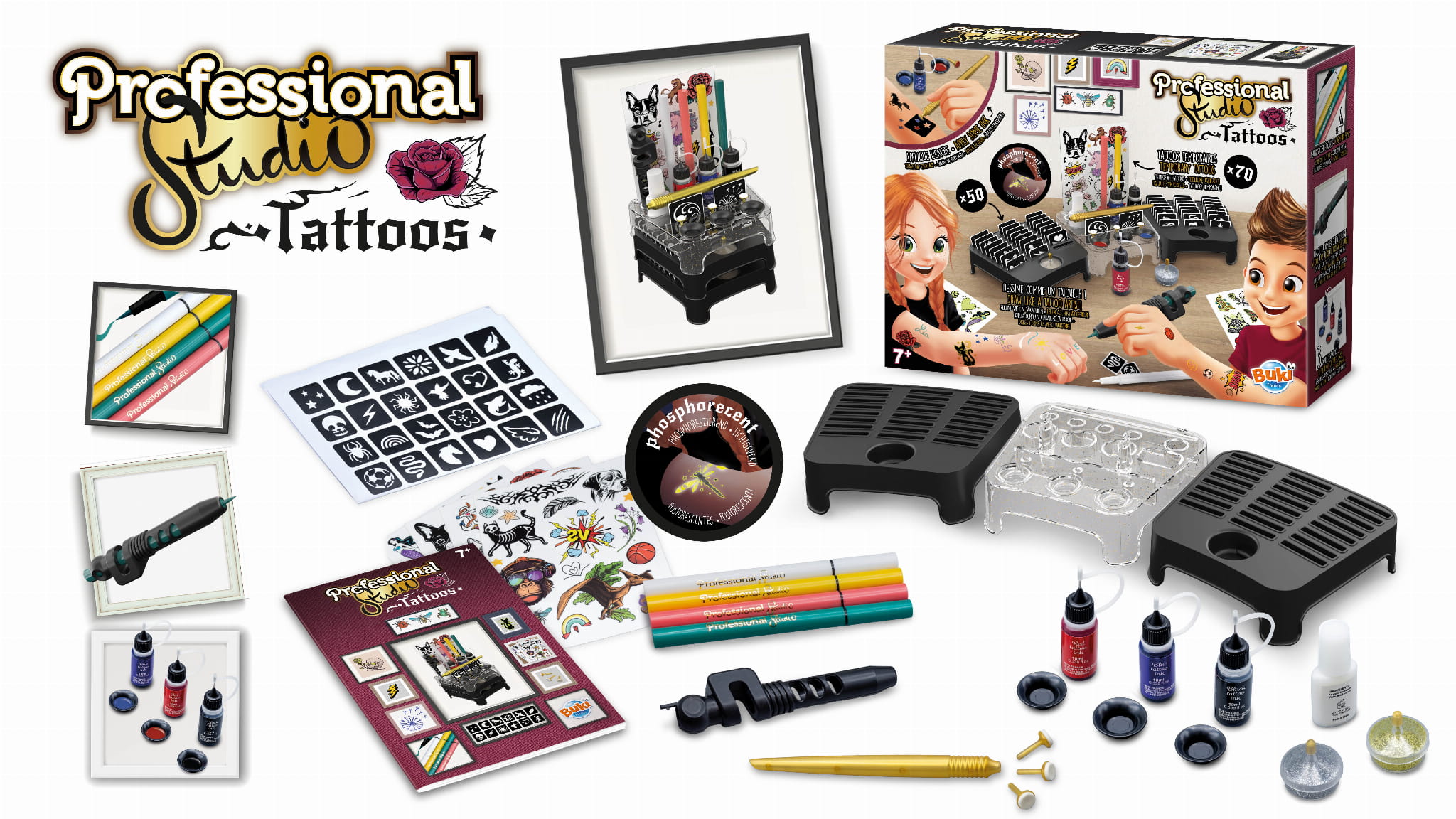 Wielorazowe wzory tatuaży należy umieścić na skórze i pokolorować załączonymi tuszami za pomocą narzędzi imitujących prawdziwe maszynki do robienia tatuaży.