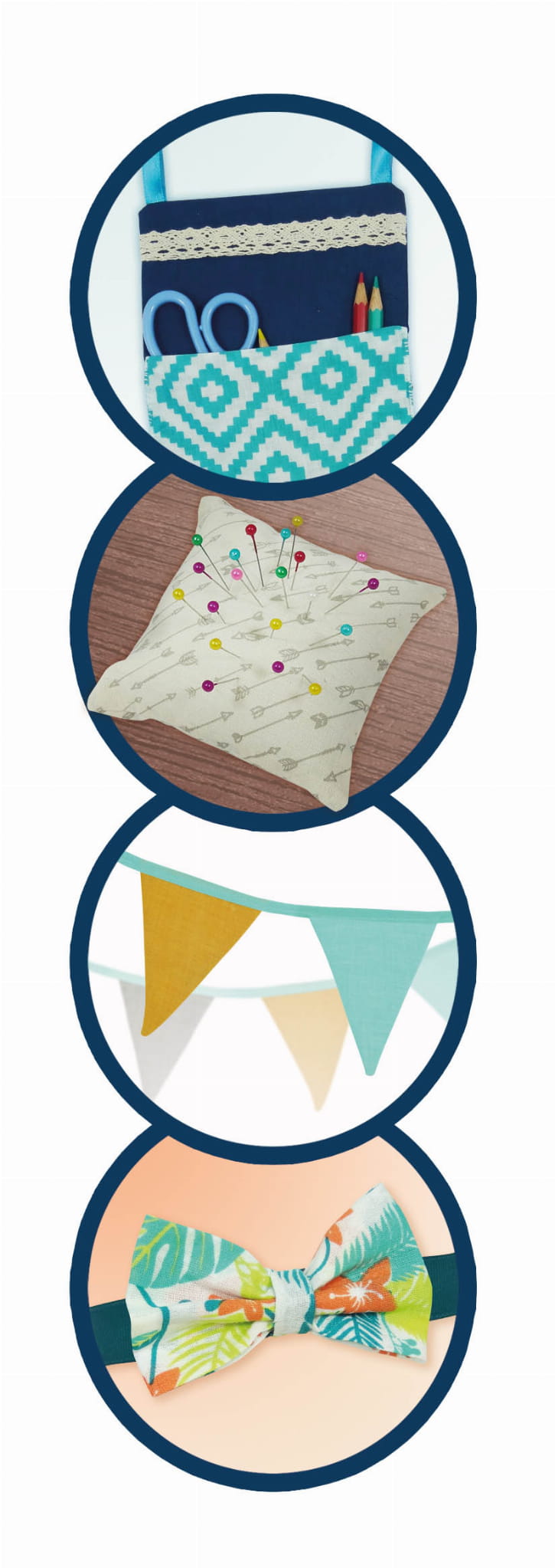 Naucz się szyć i stwórz cztery projekty: chorągiewki, poduszeczkę na szpilki, muszkę i wiszącą kieszonkę-przybornik do przechowywania drobiazgów.