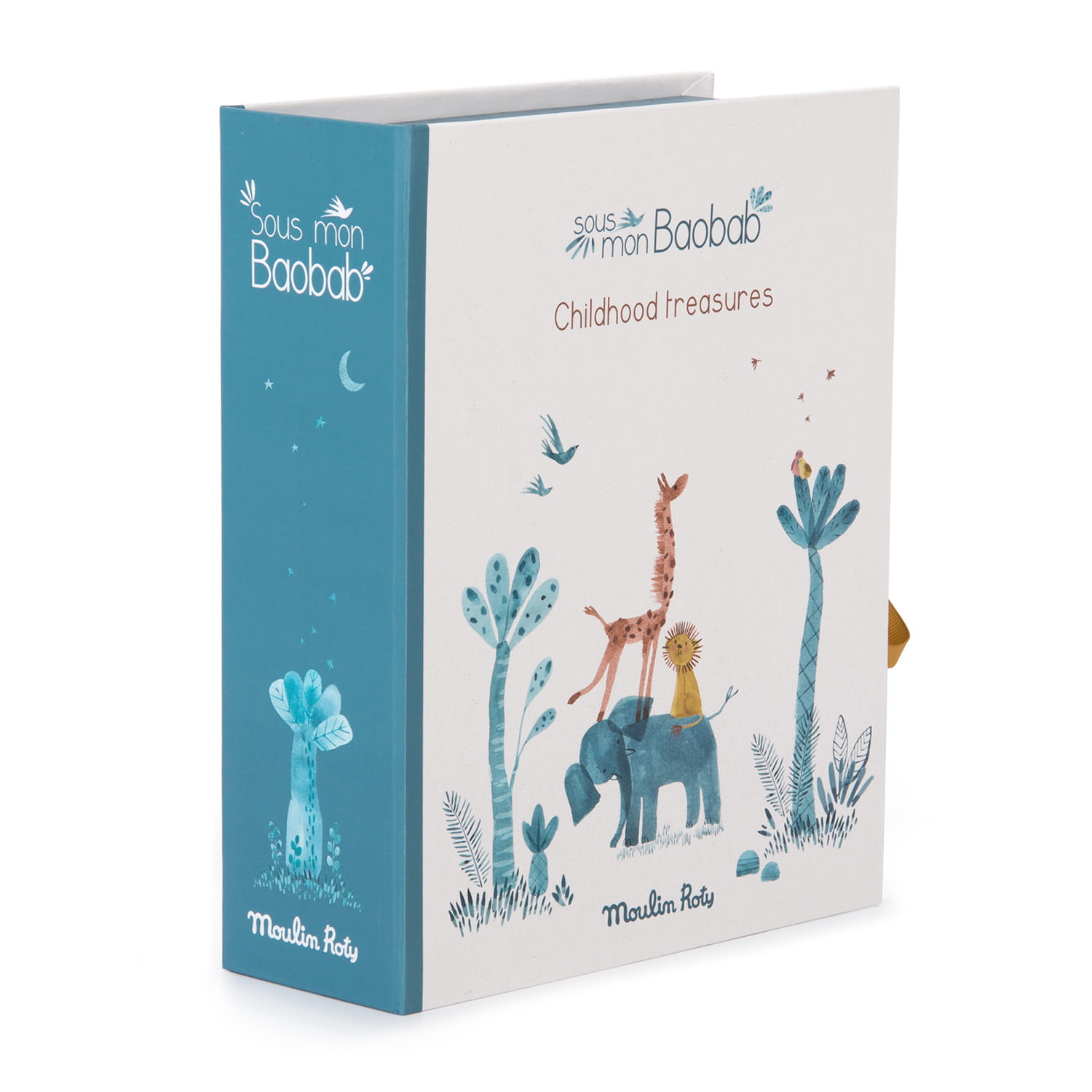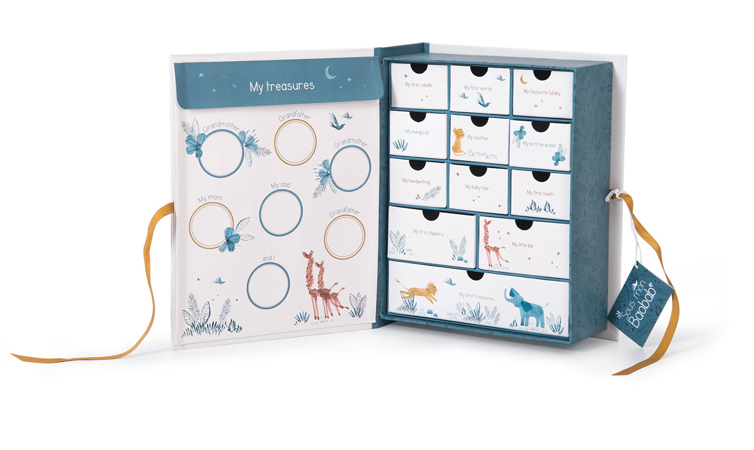 Pudełko prezentowe w odcieniach pełnych słodyczy i delikatności gamy "Pod moin BAOBABEM"Przedstawia się jako książka zawierająca małe szuflady przeznaczone na wszystkie cuda dzieciństwa: pierwsze pasmo włosów, pierwsze buciki, pierwsze pamiatki? i drzewo genealogiczne do uzupełnienia na tylnej okładce. Mała koperta w kształcie tektury umożliwia wpisanie imienia dziecka.