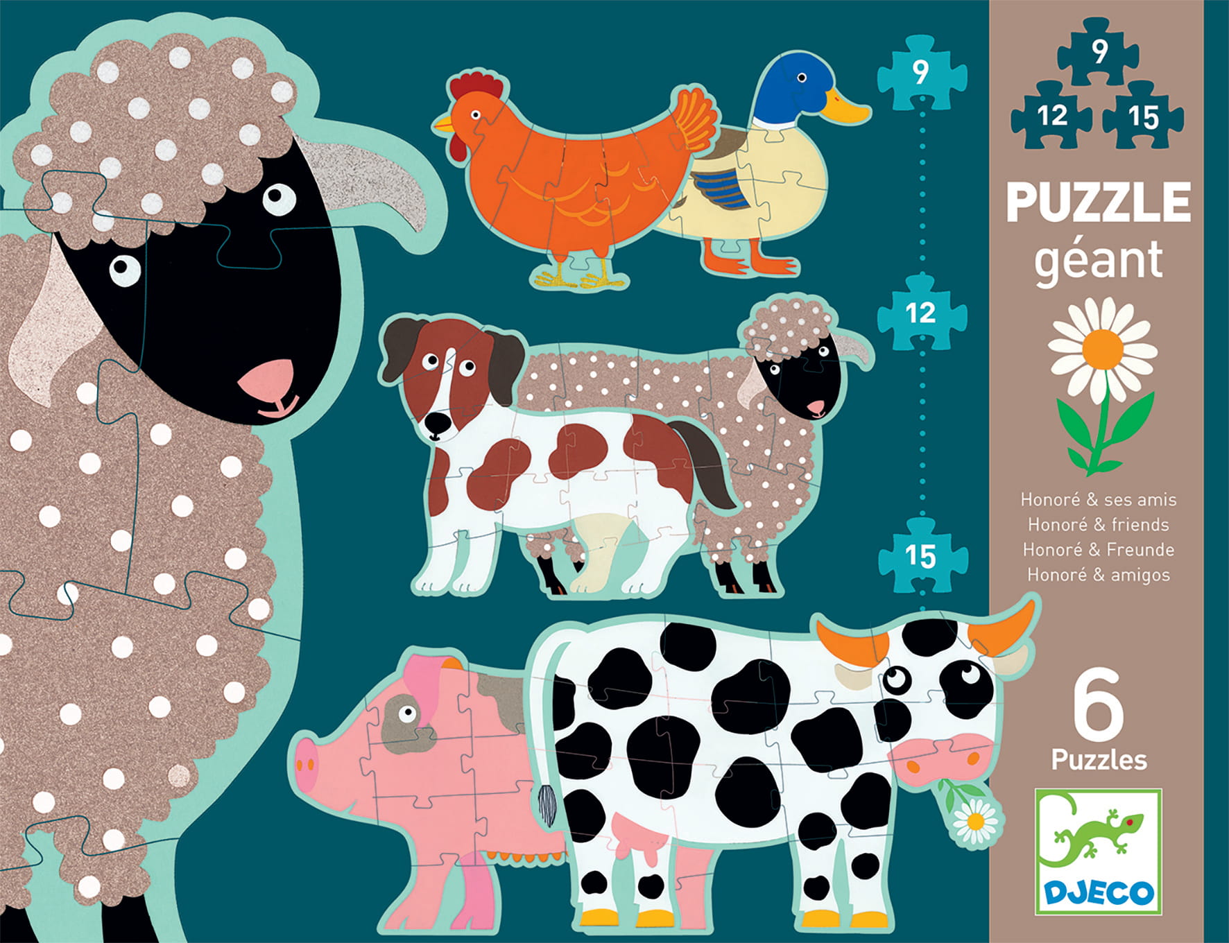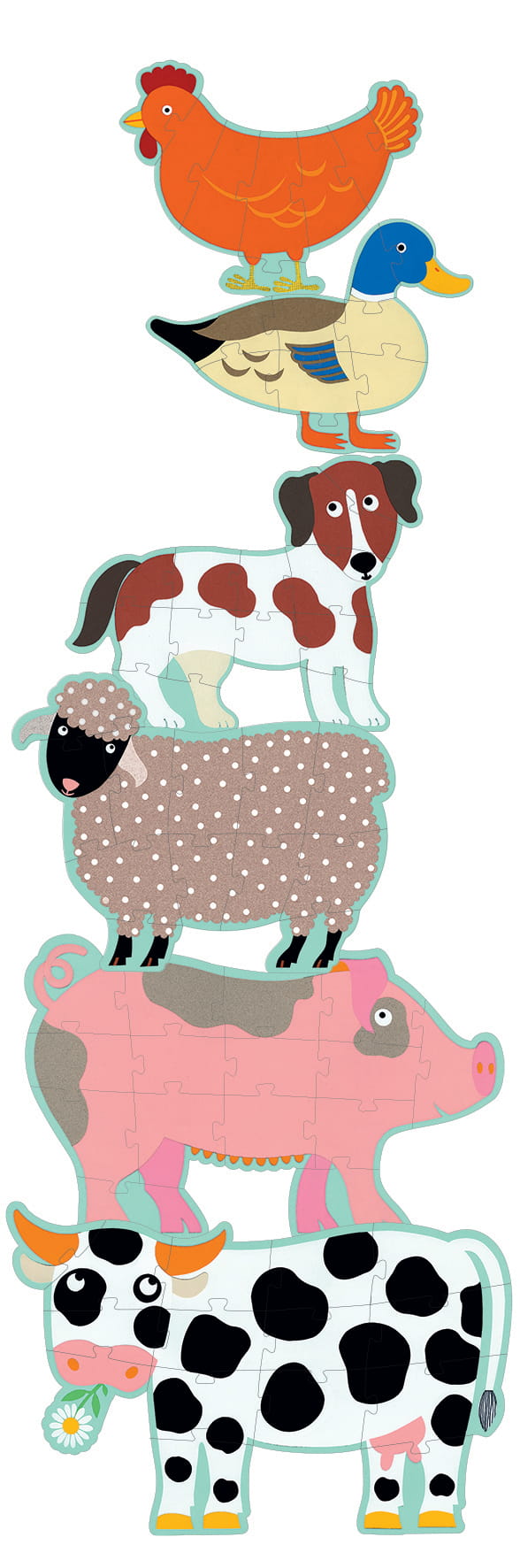 Tekturowe puzzle składajace się z 6 zwierzątek 9, 12 lub 15 elemetowych.