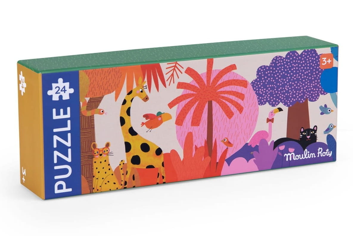 Kolorowy świat Les Toupitis zaprasza do zabawy! Przepięknie ilustrowane puzzle w żywych kolorach przedstawiają dżunglę, w której mieszkają zabawne zwierzątka takie jak zebra, żyrafa lub słoń. 24 elementy są łatwe do chwycenia przez małe rączki dziecka. Barwna układanka idealnie nadaje się do nauki kolorów.