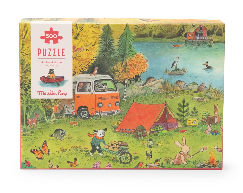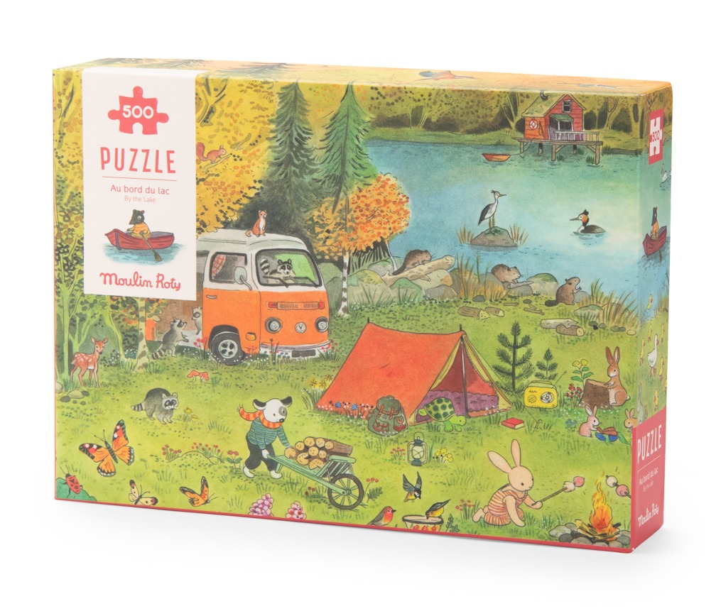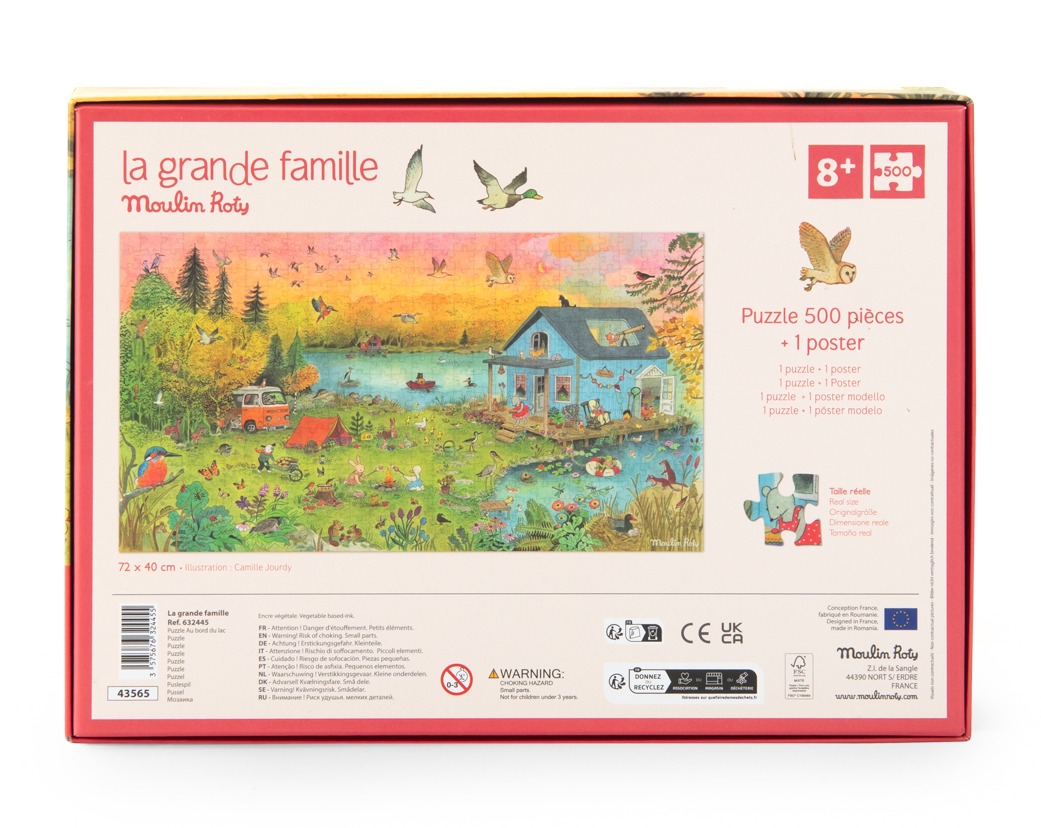 Bajecznie ilustrowane puzzle z kolekcji La Grande Famille przedstawiają sielski obrazek wakacyjnego wieczoru nad jeziorem. Bohaterowie serii spędzają wolny czas nad wodą przy zachodzącym słońcu.