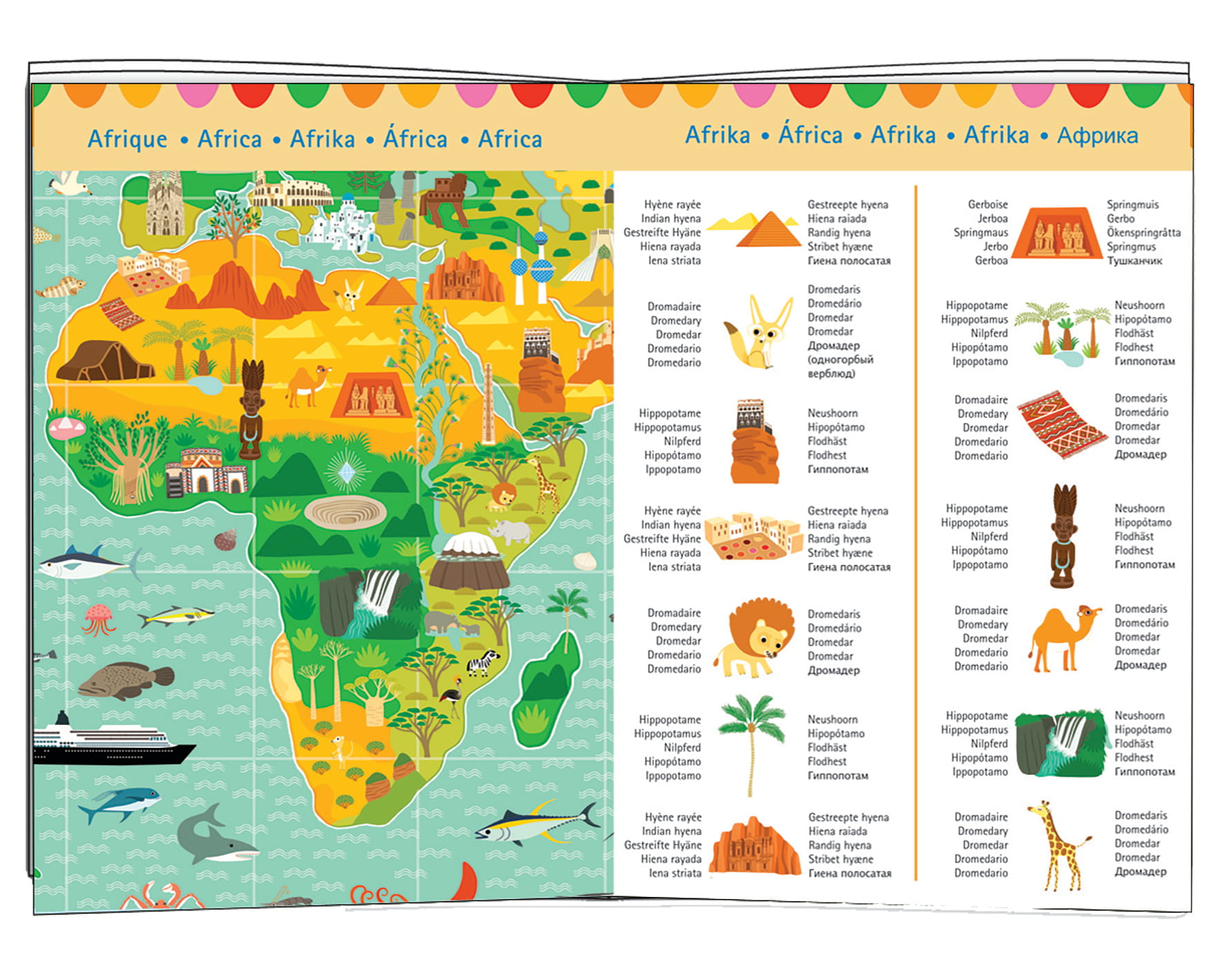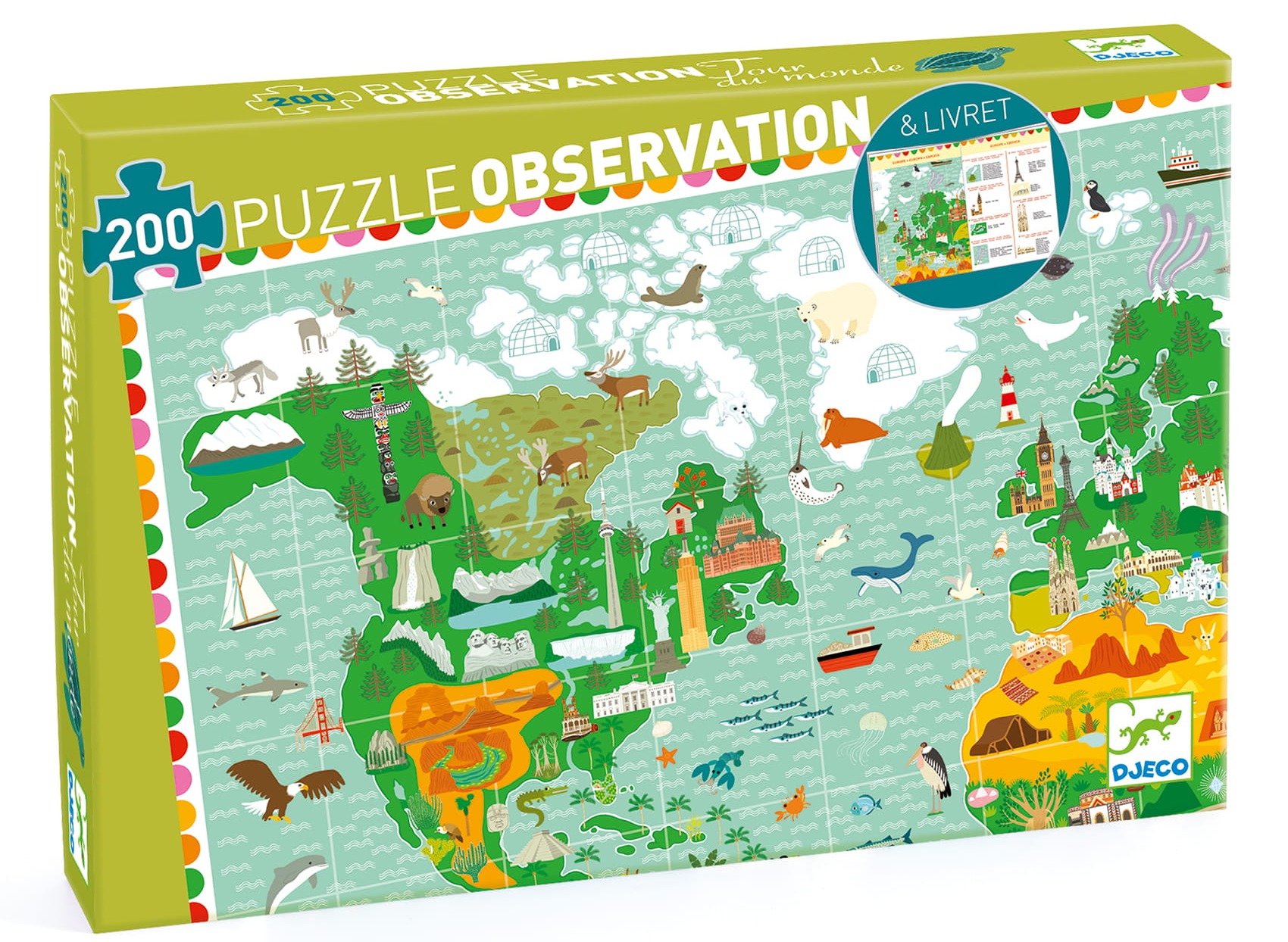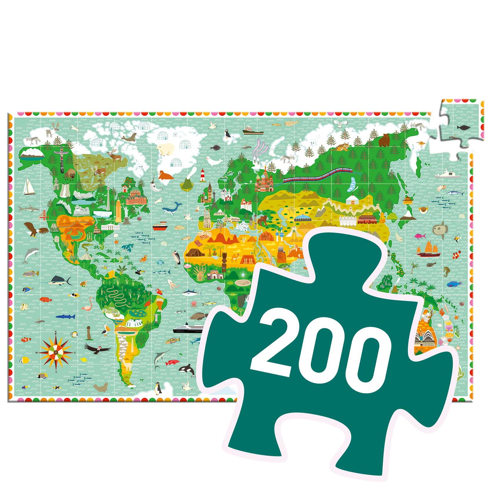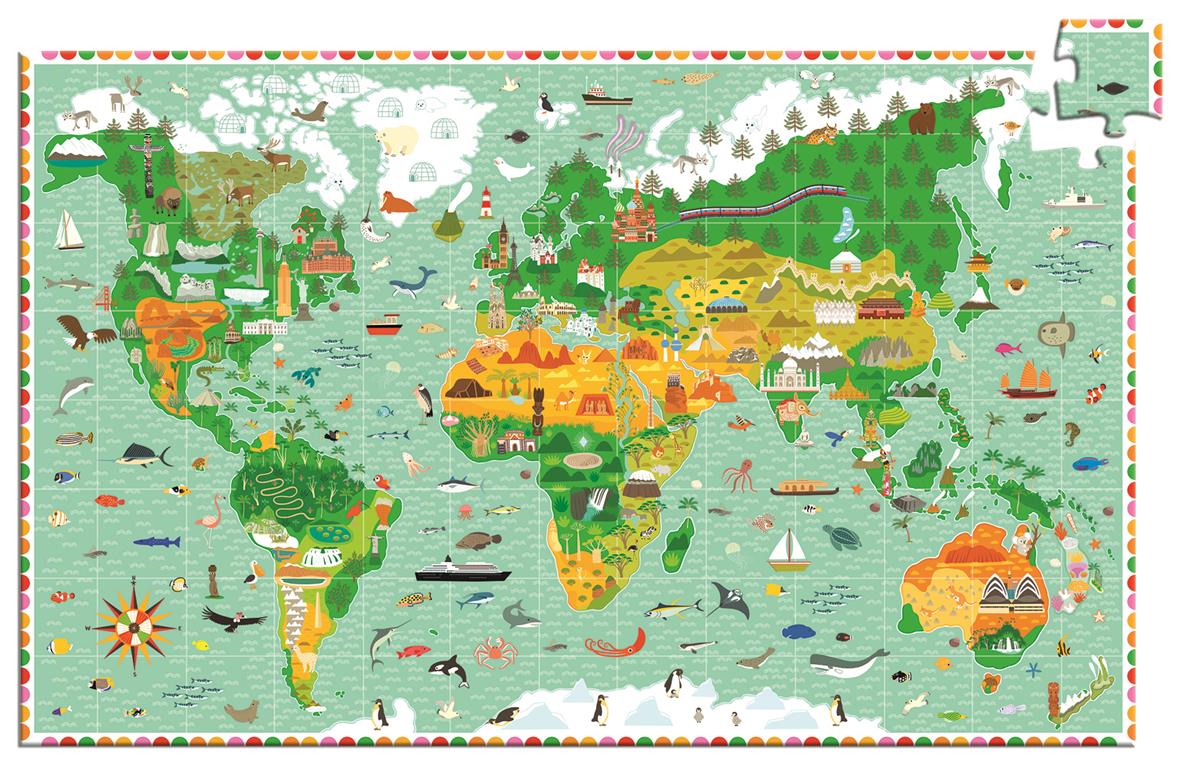 Tekturowe puzzle 200 elementowe, przedstawiające mapę świata wraz z charakterystycznymi dla danego regionu budowlami oraz zwierzętami żyjącymi nalądach i oceanach. Do puzzli dołączona jest książeczka w 6 wersjach językowych. Walory edukacyjne: rozwój koncentracji, spostrzegawczości, wyobraźni.