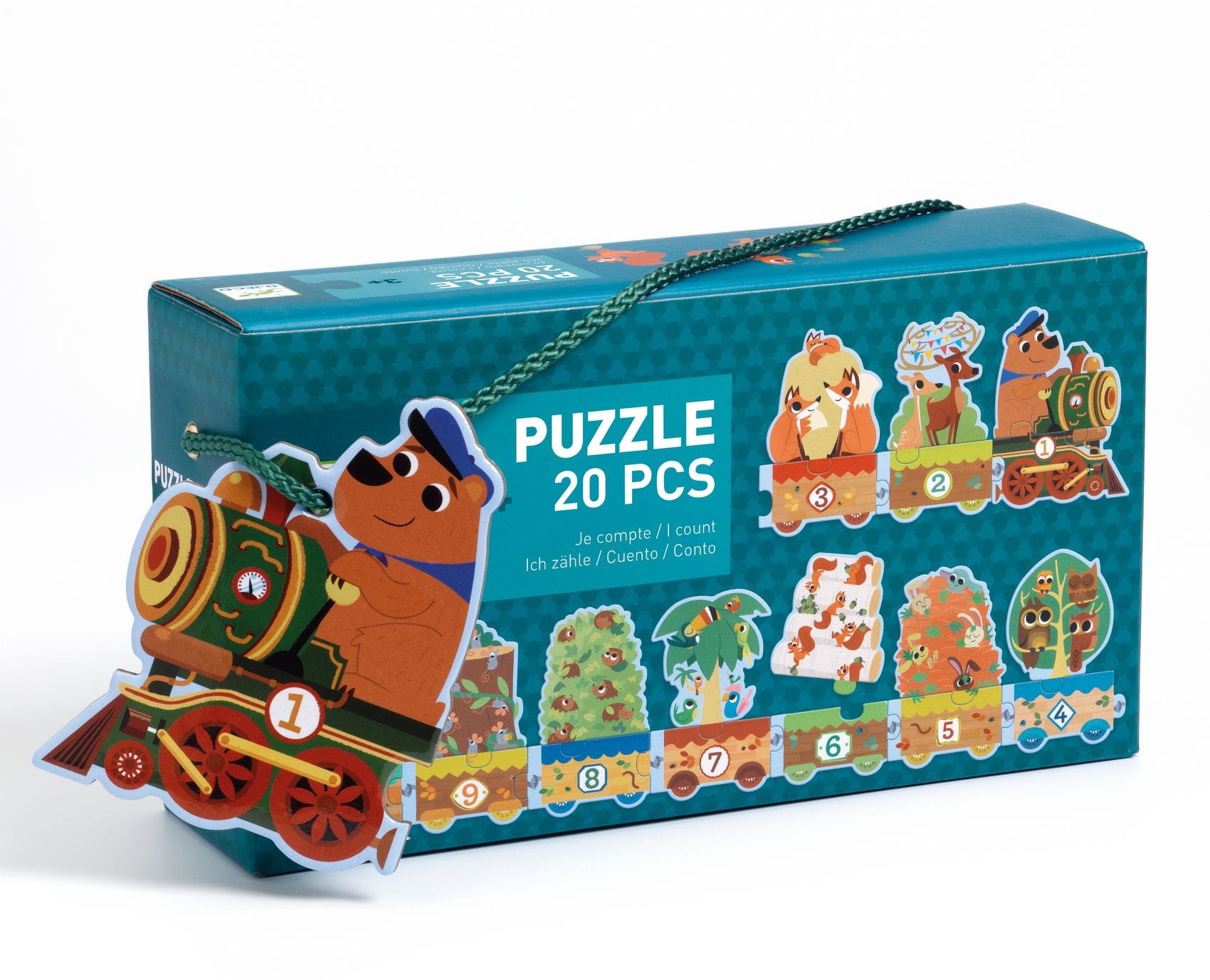 Leśny pociąg rusza w podróż! Pomóż zwierzątkom ustawić się w odpowiedniej kolejności. Puzzle w kształcie pociągu składające się z 20 elementów. Zadaniem dziecka jest ułożyć liczby i leśne zwierzątka we właściwej kolejności od 1 do 10. Idealny wstęp do nauki liczenia. Układanka ma aż 102 cm długości! Puzzle zapakowane w poręczne pudełko ze sznurkiem, które można zabrać ze sobą wszędzie. Wyprodukowane z papieru i kartonu posiadającego certyfikat FSC®.