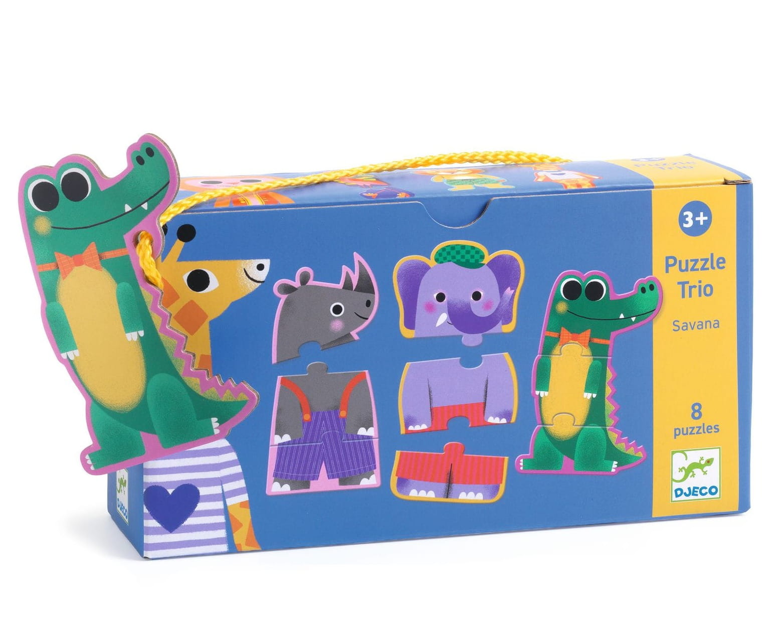 Zabawne, edukacyjne puzzle dla najmłodszych z wizerunkami uroczych zwierzątek, ubranych w różne elementy garderoby. Każde zwierzątko składa się z 3 elementów. Zabawa uczy spostrzegawczości i koncentracji. Zestaw zapakowany w kolorowe pudełko ze sznurkiem, łatwe w transporcie. Puzzle wykonane z papieru i kartonu posiadającego certyfikat FSC®.