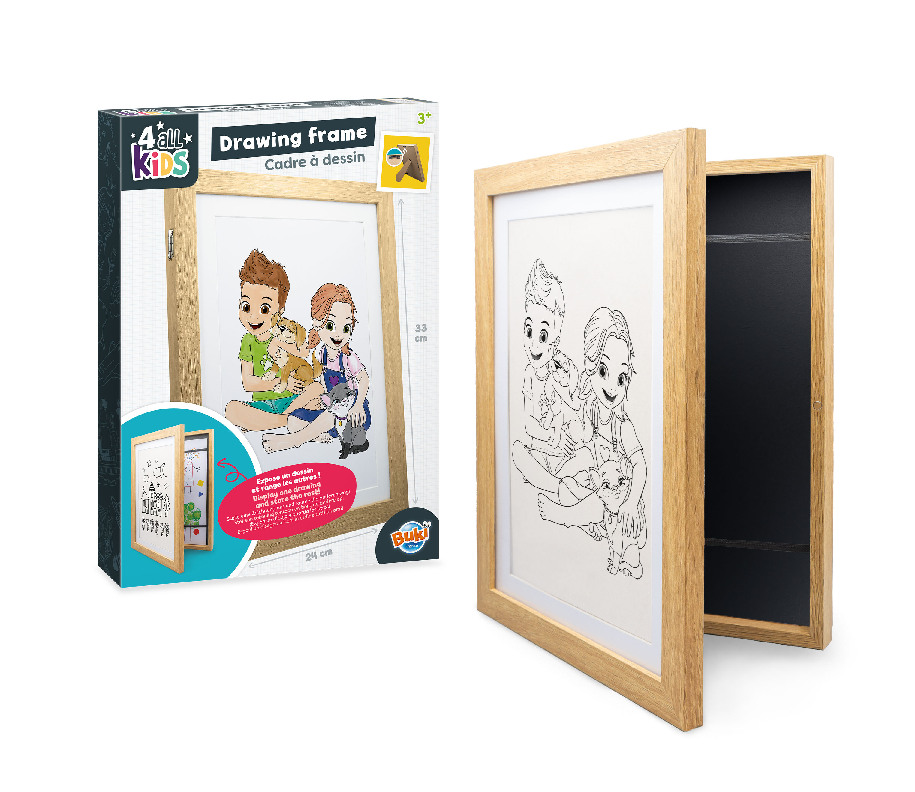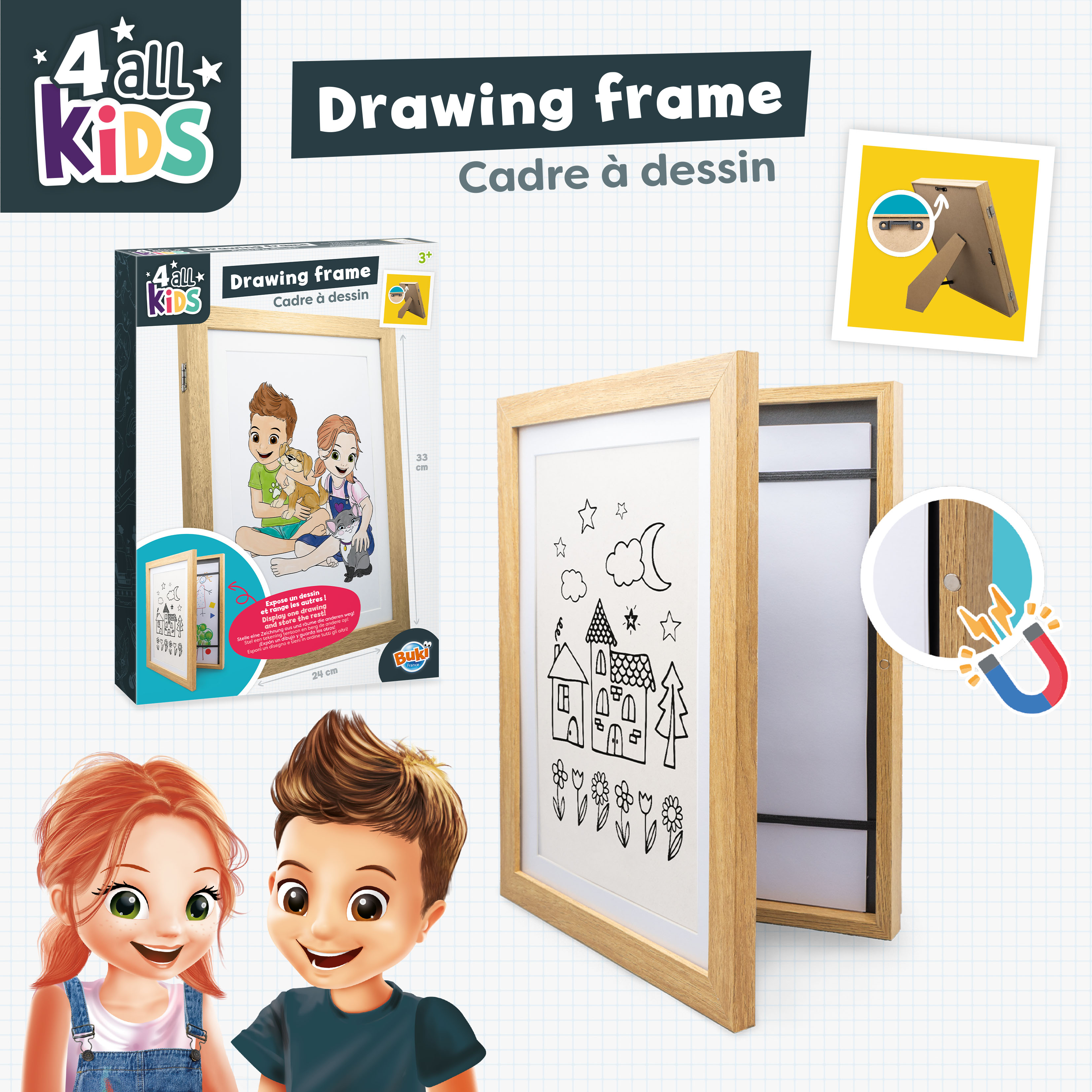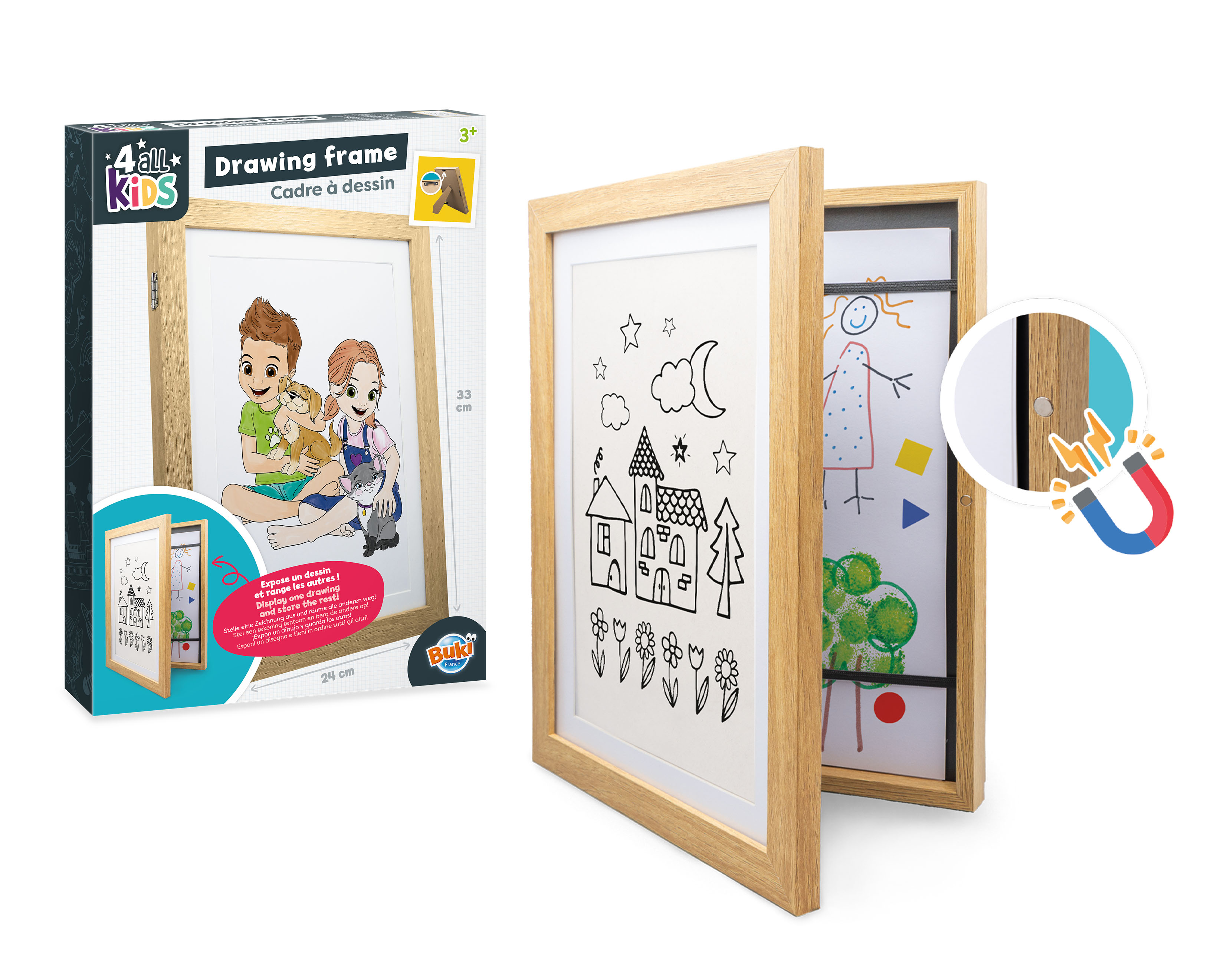 Ramka mierzy 24 cm x 33 cm, pomieści format A4. Jest bardzo łatwa w obsłudze również dla dzieci. Ramkę można powiesić na ścianie lub postawić na regale.