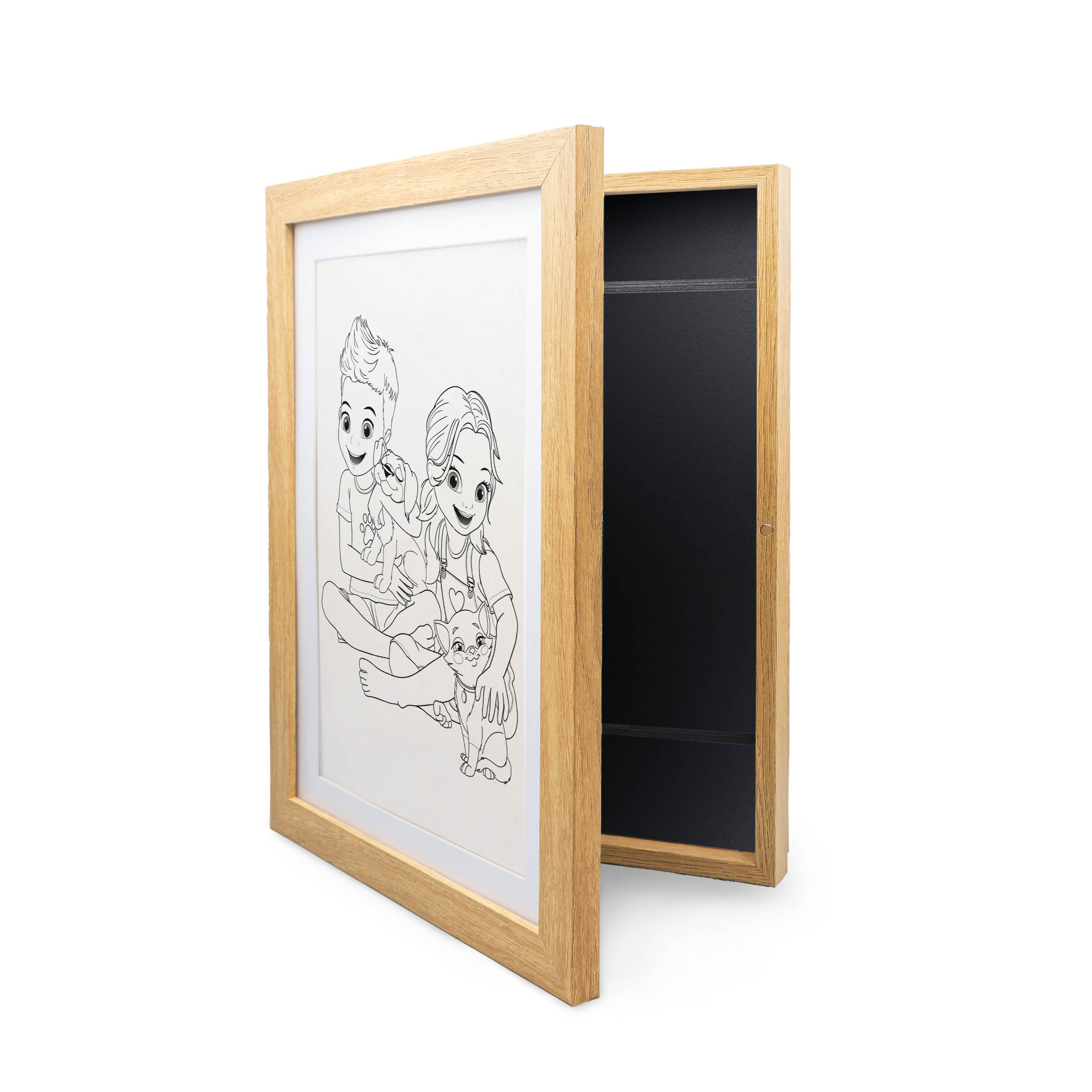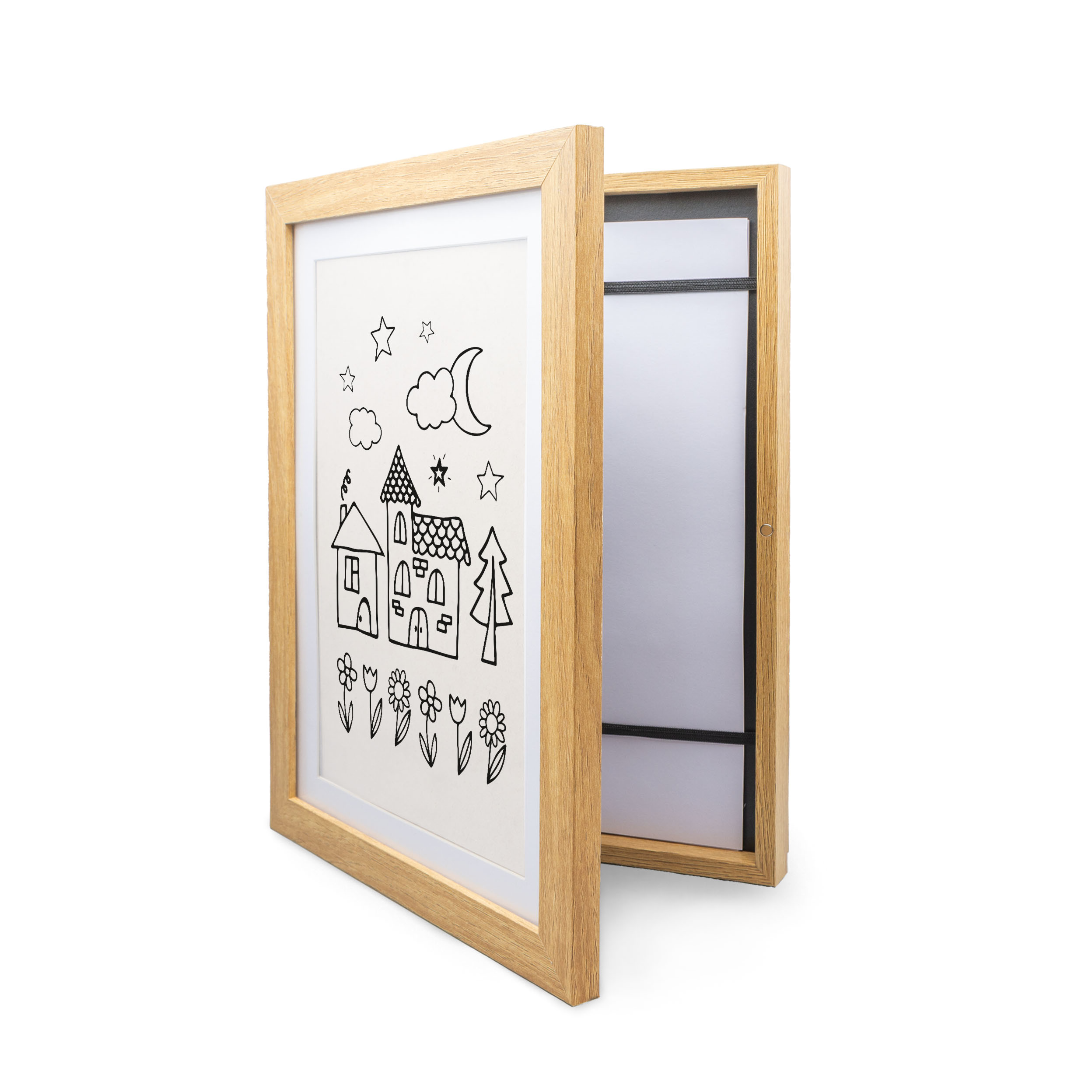 Koniec z bałaganem pośród bezcennych rysunków dziecka! Wszystkie małe dzieła sztuki można teraz zamknąć w praktycznej drewnianej ramce, która pomieści do 50 rysunków! Ramka składa się z dwóch części: schowka na rysunki i klasycznej ramki eksponującej jeden z obrazków. Pozostałe rysunki wsuwa się pod dwie gumki, które trzymają plik kartek w miejscu. Obie części zamyka się i otwiera na metalowy zatrzask.