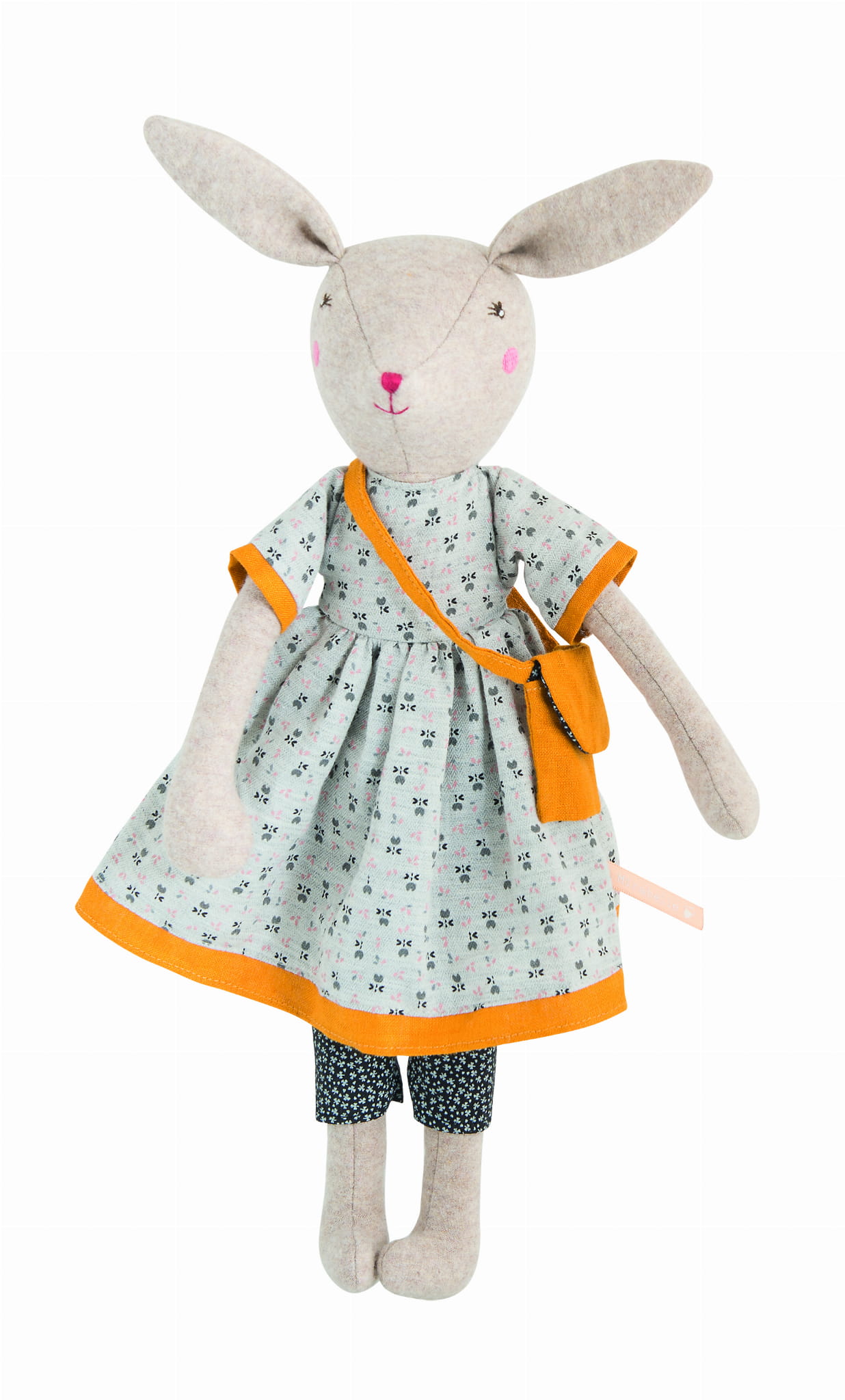 Rose - królicza mama to maskotka z kolekcji La Famille Mirabelle firmy Moulin Roty. Wykonana została z miękkiej dzianiny bawełnianej w jasnym kolorze. Maskotka ma wyszyte oczy, nos i usta. Ubrana jest w odpinaną szarą sukienkę z musztardowo żółtymi wykończeniami i torebkę w tym samym kolorze oraz czarne legginsy w jasne kwiatuszki. Maskotka ma 40 cm wysokości i jest odpowiednia od wieku 0+.