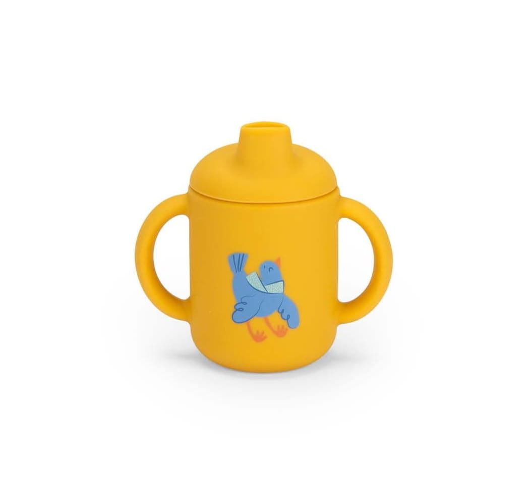 ciasteczek, żółty kubek z dziubkiem i dwoma uszami oraz kremowy talerzyk w
