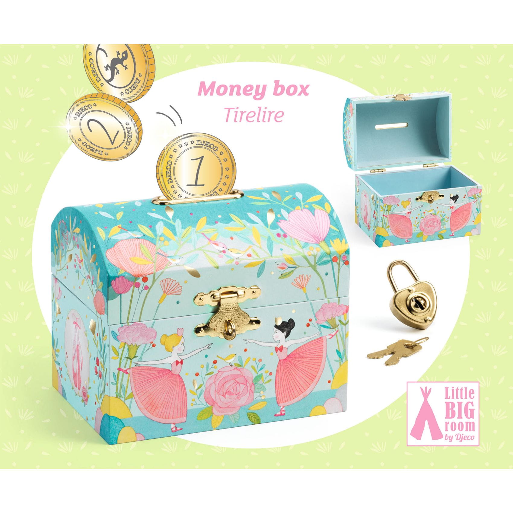 Drewniana skarbonka BALERINA- pięknie zaprojektowana skarbonka - szkatułka na pieniądze lub skarby dziewczynki. Skarbonka zabezpieczona jest kłódką w kształcie serca zamykaną na kluczyk (2 szt.), aby nikt nie mógł zabrać cennych skarbów. Dno wyłożone jest aksamitem. Śliczna ozdoba do dziecięcego pokoju o unikalnym i kreatywnym designie Djeco.