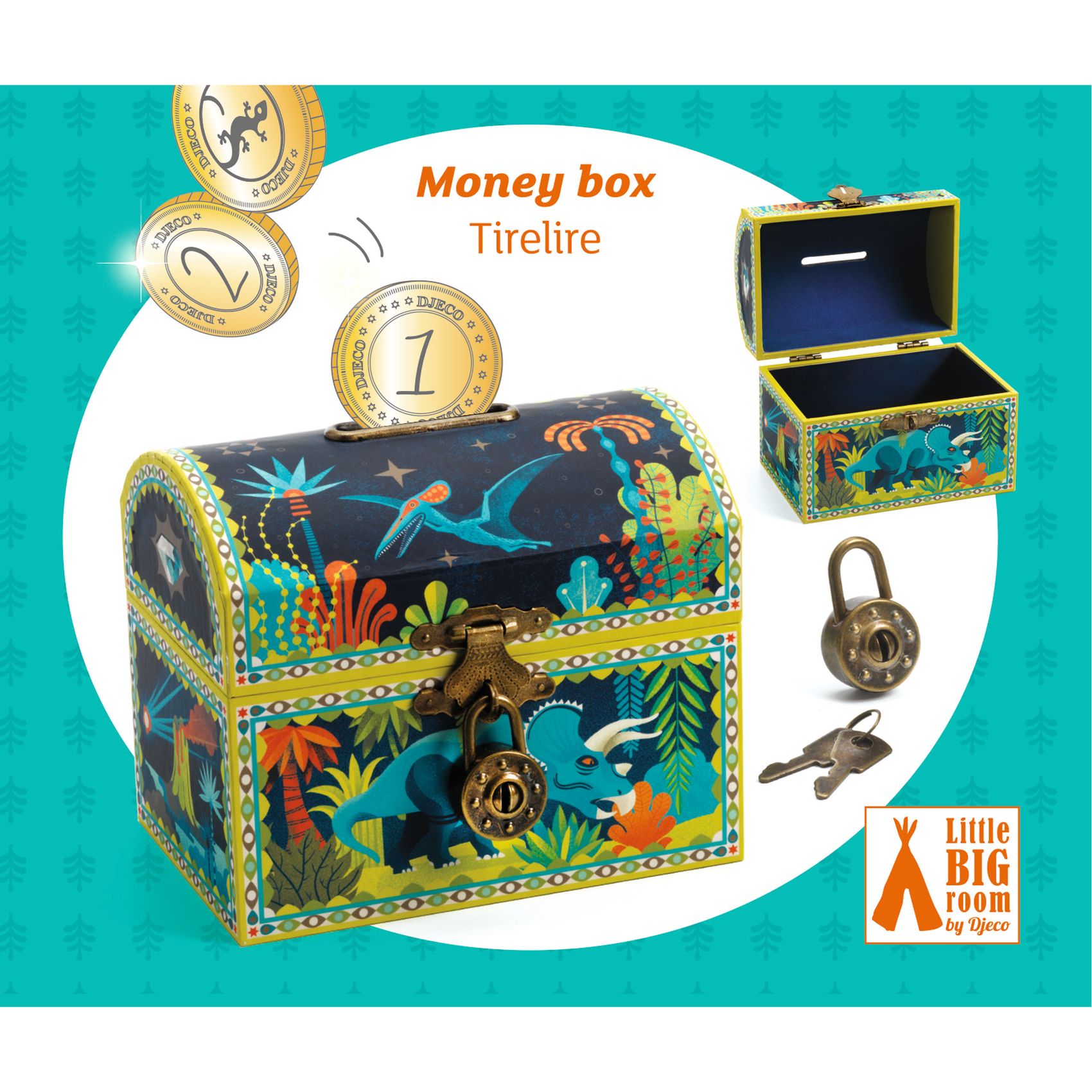 Drewniana skarbonka DINOZAURY zabezpieczona jest kłódką zamykaną na kluczyk (2 szt), aby nikt nie mógł zabrać cennych skarbów. Skarbonka podobnie jak skrzynia skarbów, ma dużą pokrywkę, więc można wniej przechowywać inne przedmioty. Dno wyłożone jest aksamitem. Skarbonka możebyć ozdobą do dziecięcego pokoju: posiada unikalny i kreatywny design Djeco.