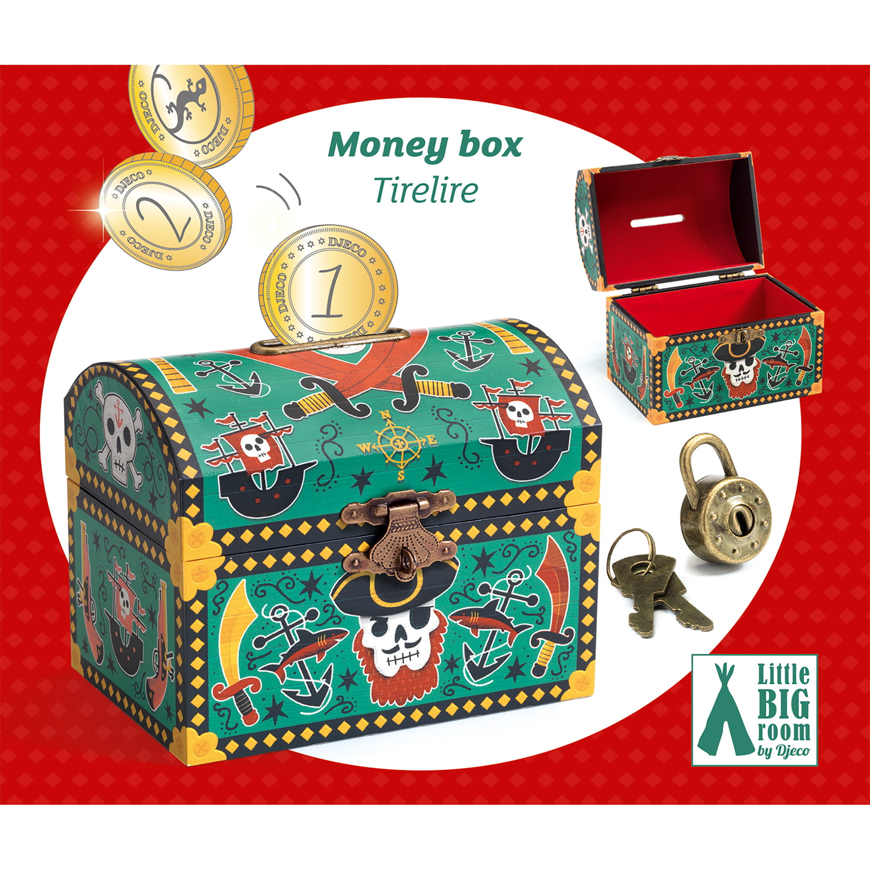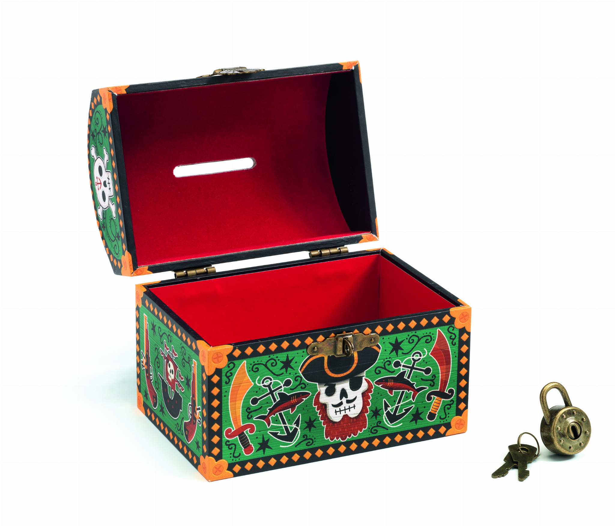 Drewniana skarbonka - SKRZYNIA PIRATA, zabezpieczona jest kłódka zamykaną na kluczyk (2 szt) aby nikt nie mógł zabrać cennych skarbów. Skarbonka podobnie jak skrzynia skarbów, ma dużą pokrywkę, więc można w niej przechowywać inne przedmioty. Skarbonka może być ozdobą do dziecięcego pokoju ma unikalny i kreatywny designie Djeco.