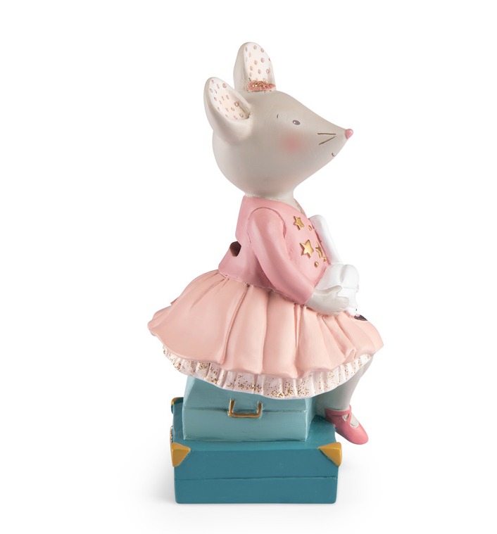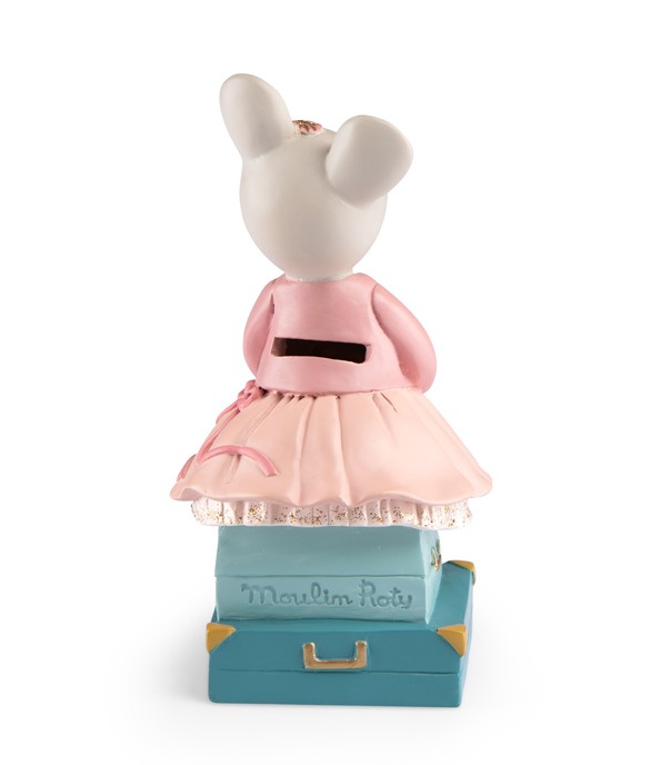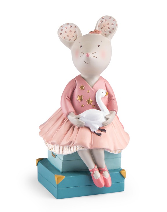 Skarbonka w kształcie myszki pochodzącej z kolekcji Mała Szkoła Tańca. Urocza balerina siedzi na dwóch walizkach, trzymając swojego wiernego towarzysza podróży łabędzia. Ubrana jest w różową bluzeczkę w gwiazdki, tiulową spódniczkę i różowe baletki.
