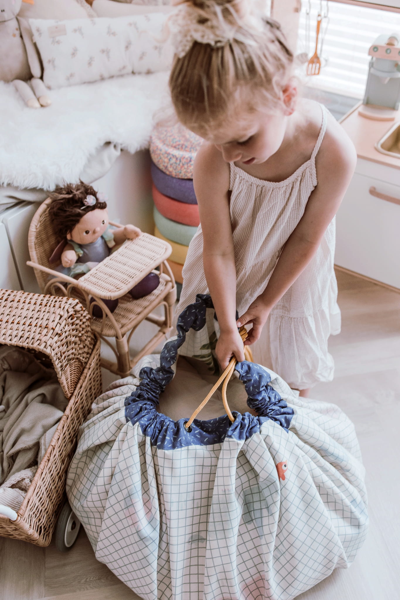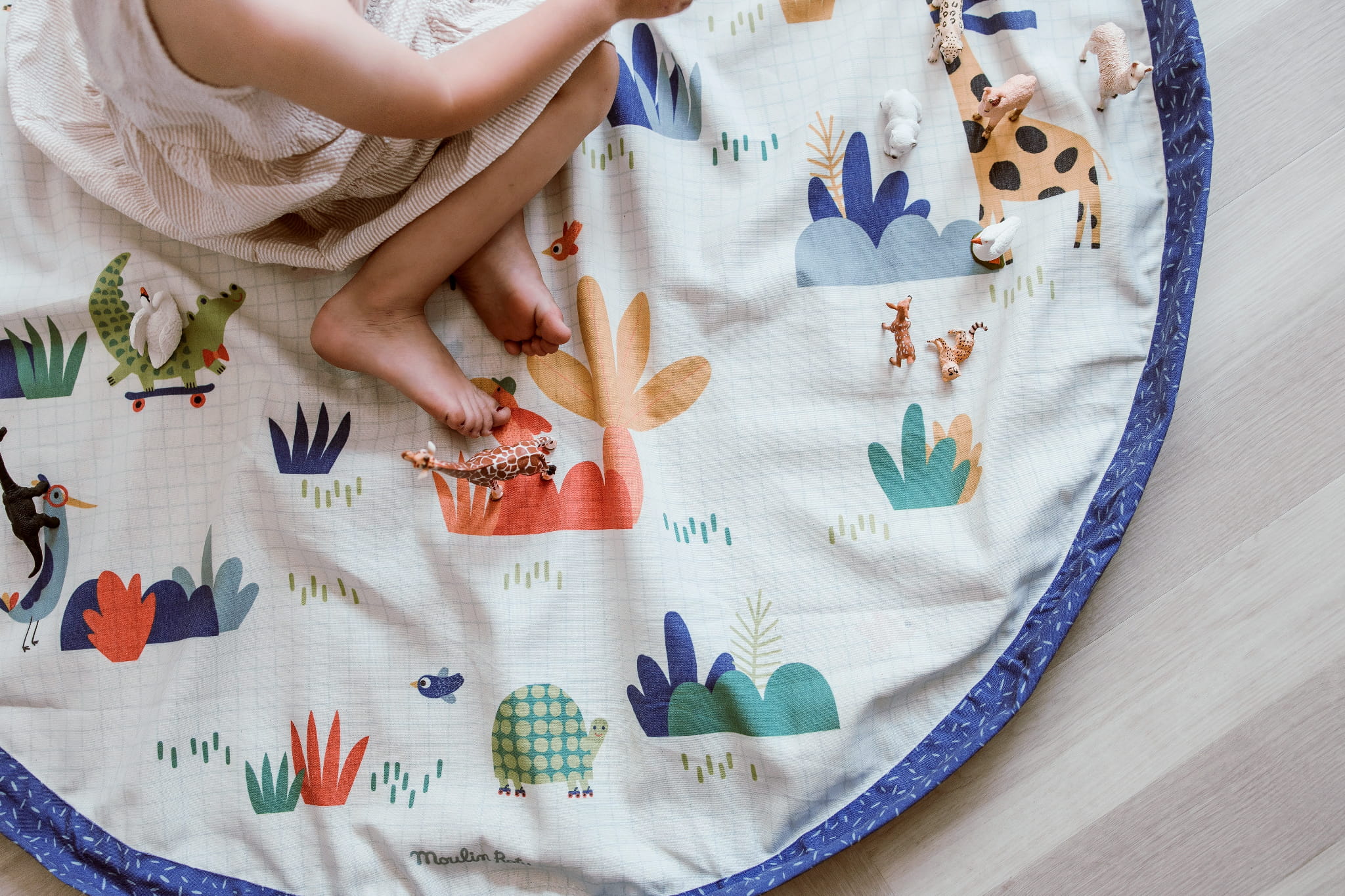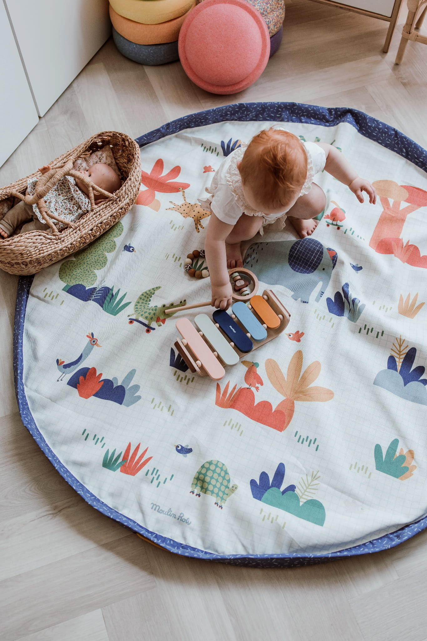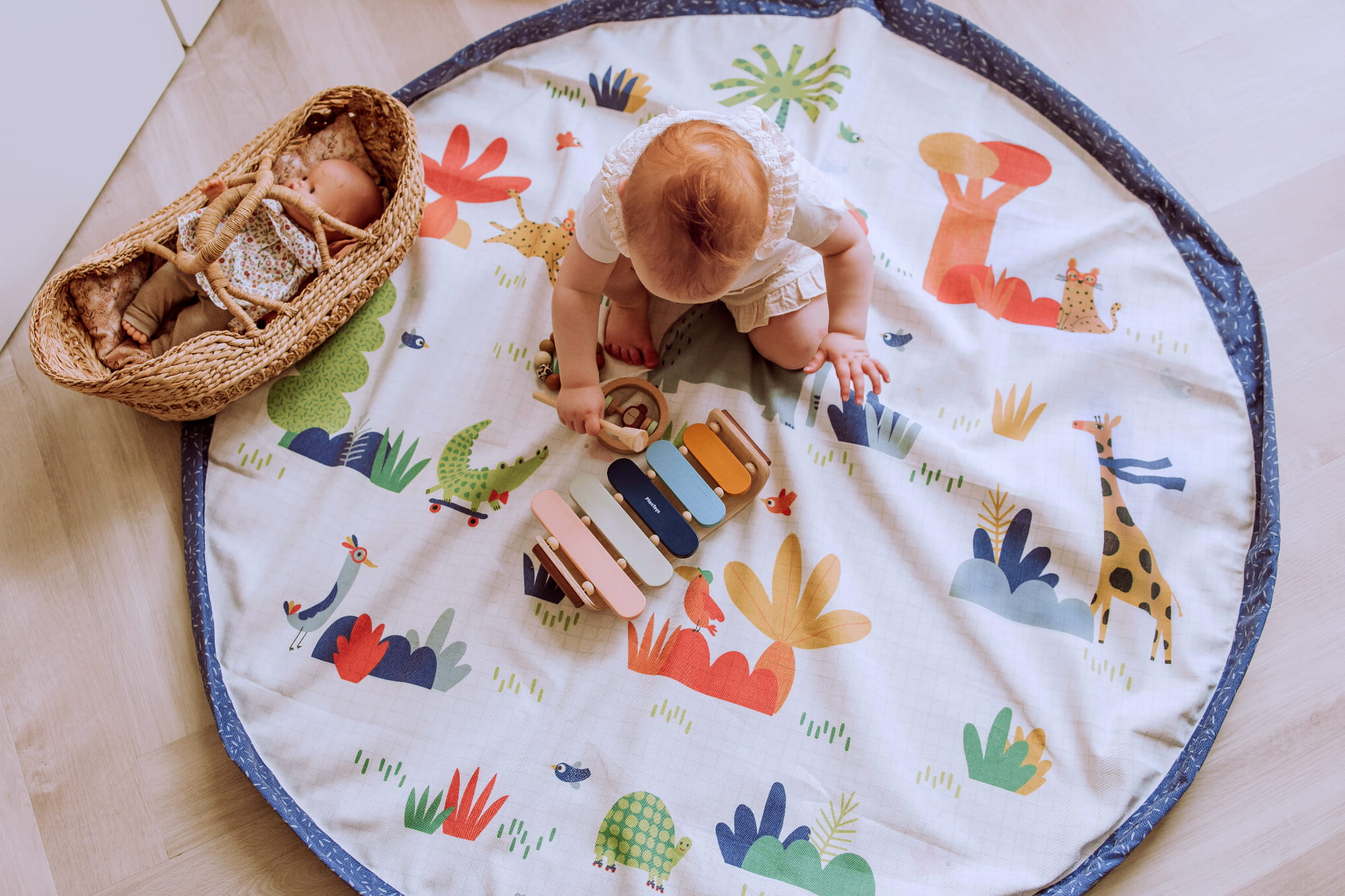 Mata do zabawy dla dzieci od 1. dnia życia. Wykonana w 100% z bawełny, ilustrowana kolorami i wzorami pochodzącymi z kolekcji Les Toupitis. Rozłożona na podłodze zapewni bezpieczną przestrzeń do zabawy dla maluszka. Wesołe rysunki zaciekawią małe oczka.