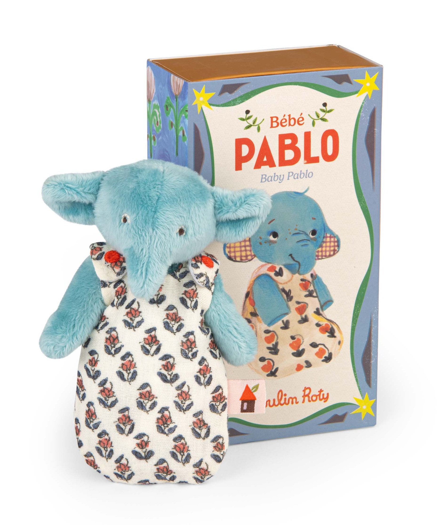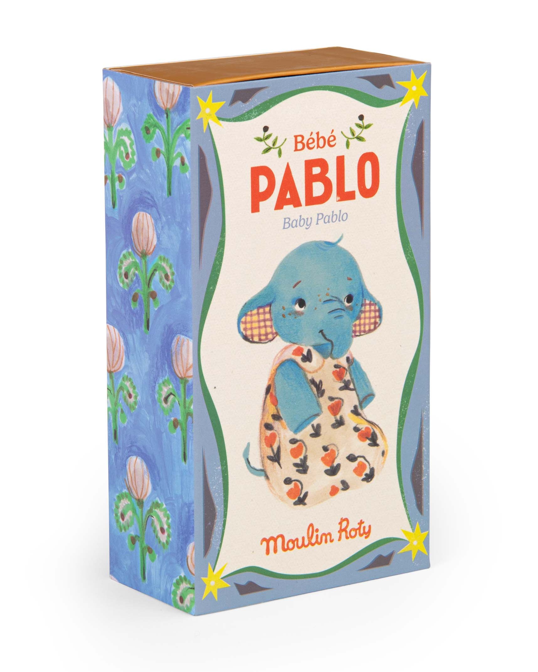 Słonik Pablo posiada mięciutkie uszy oraz uroczą trąbę, która rozweseli niejednego maluszka. Ubrany jest w śpiworek w kwiatowy wzór z dwoma ozdobnymi czerwonymi kółkami, imitującymi guziki. Śpiworki są zapinane na rzep i zdejmowalne. Nóżki maskotki można zgiąć i ustawić ją w pozycji siedzącej. Każda z maskotek jest pakowana w pięknie ilustrowane, ozdobne pudełko.